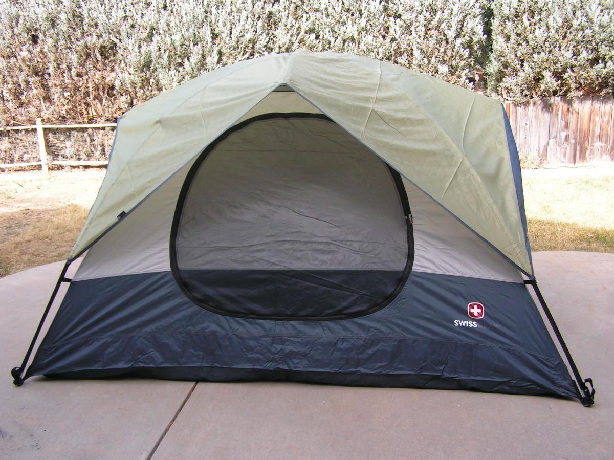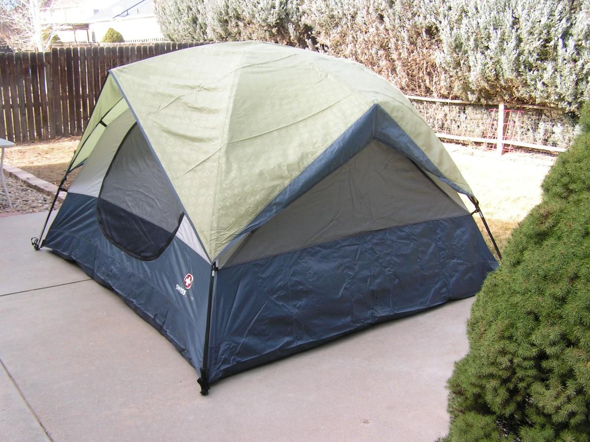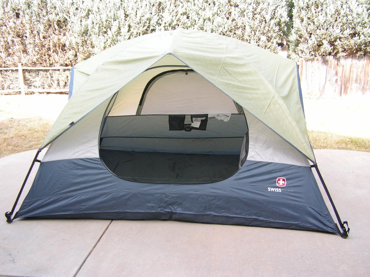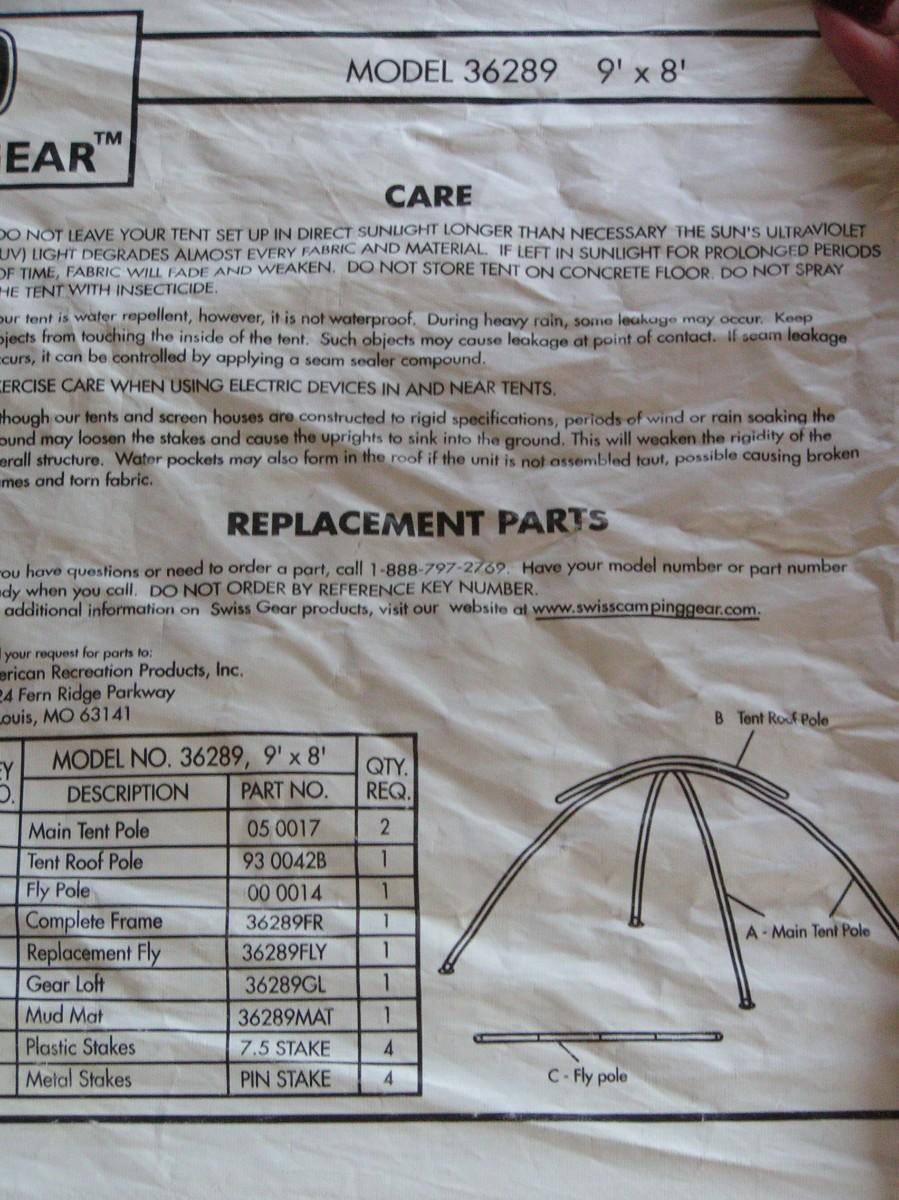 SwissGear Quality family size self supporting tent. Label says it's 9'x8'. It is roomy and 3 adults can be very comfortable, 4 is cozy but do-able. It's ample for 2 adults and 2 kids OR a bunch of kids. Waterproof floor and a rain fly keep you dry. Mesh ceiling, mesh window & door with zippered door/window cover blinds provide good air flow when needed. Stake down loops on the corners. Set up instructions are on the carry bag label as well as a replacement parts list (that's rare). This high quality tent looks barely used, it's in clean excellent+ condition.