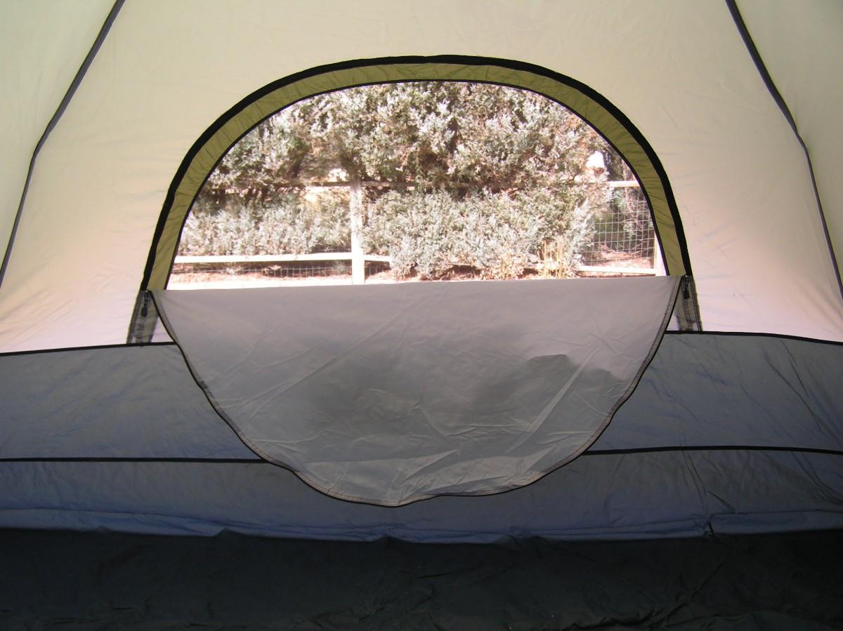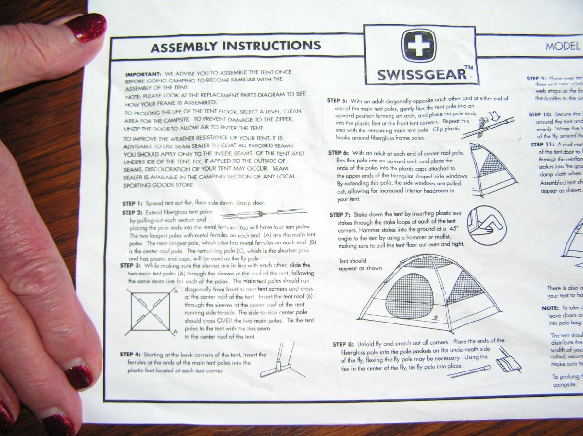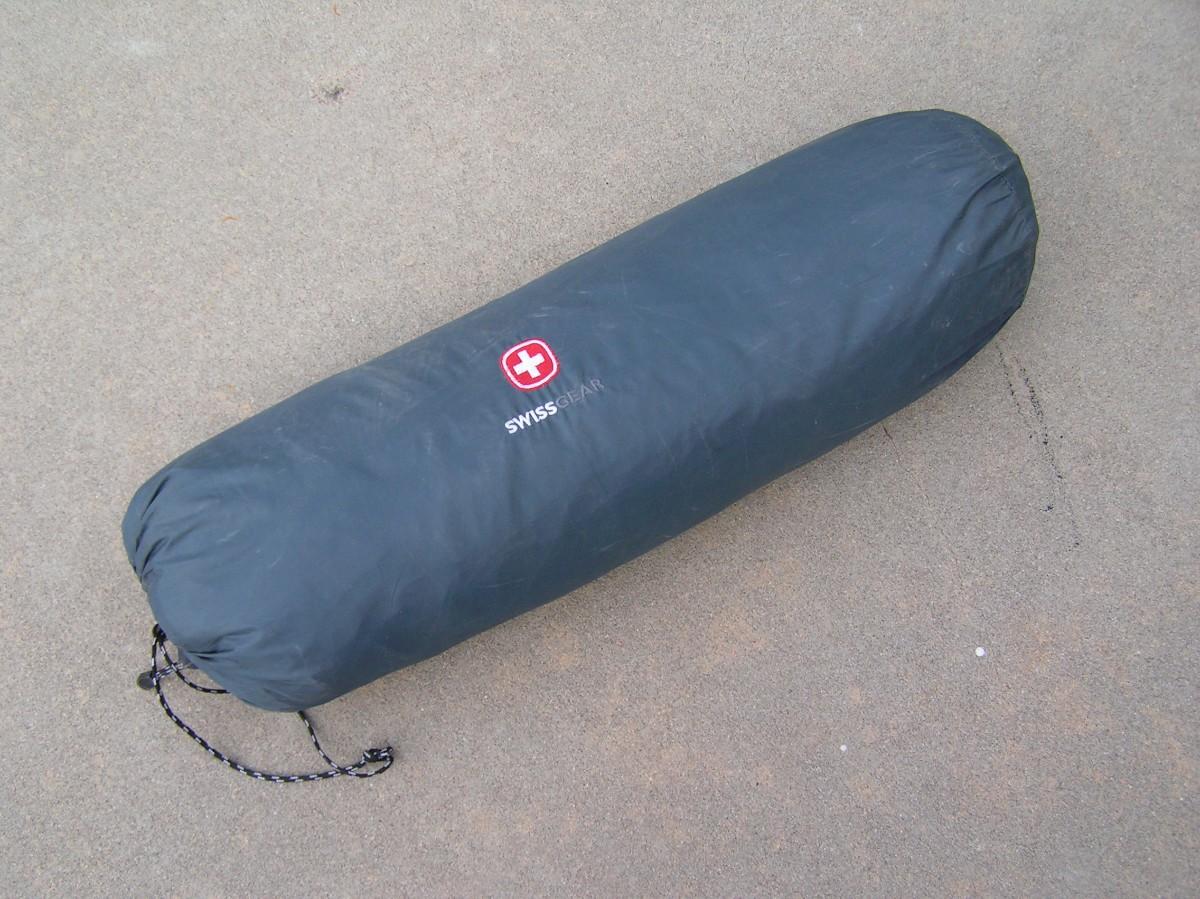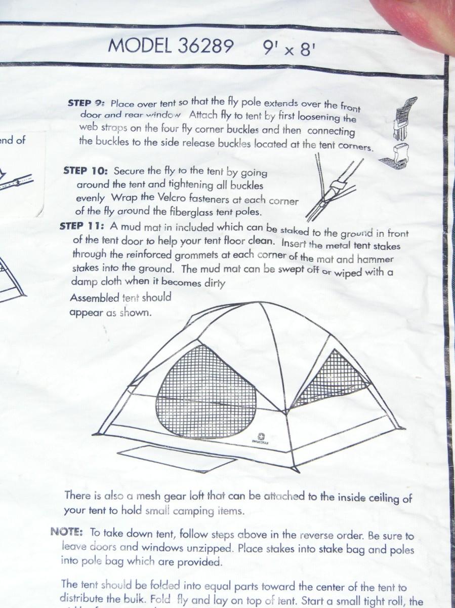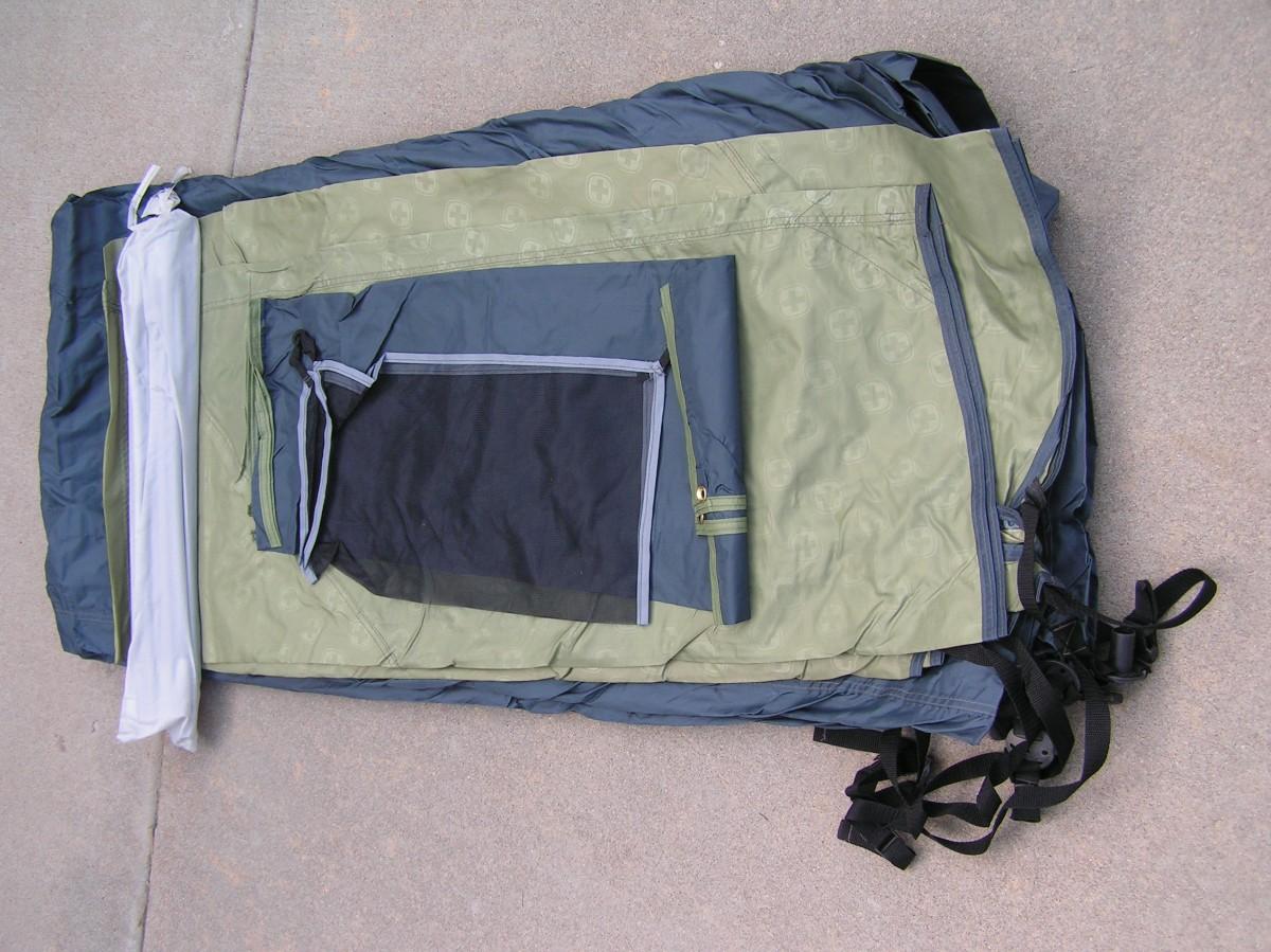 SwissGear Quality family size self supporting tent. Label says it's 9'x8'. It is roomy and 3 adults can be very comfortable, 4 is cozy but do-able. It's ample for 2 adults and 2 kids OR a bunch of kids. Waterproof floor and a rain fly keep you dry. Mesh ceiling, mesh window & door with zippered door/window cover blinds provide good air flow when needed. Stake down loops on the corners. Set up instructions are on the carry bag label as well as a replacement parts list (that's rare). This high quality tent looks barely used, it's in clean excellent+ condition.