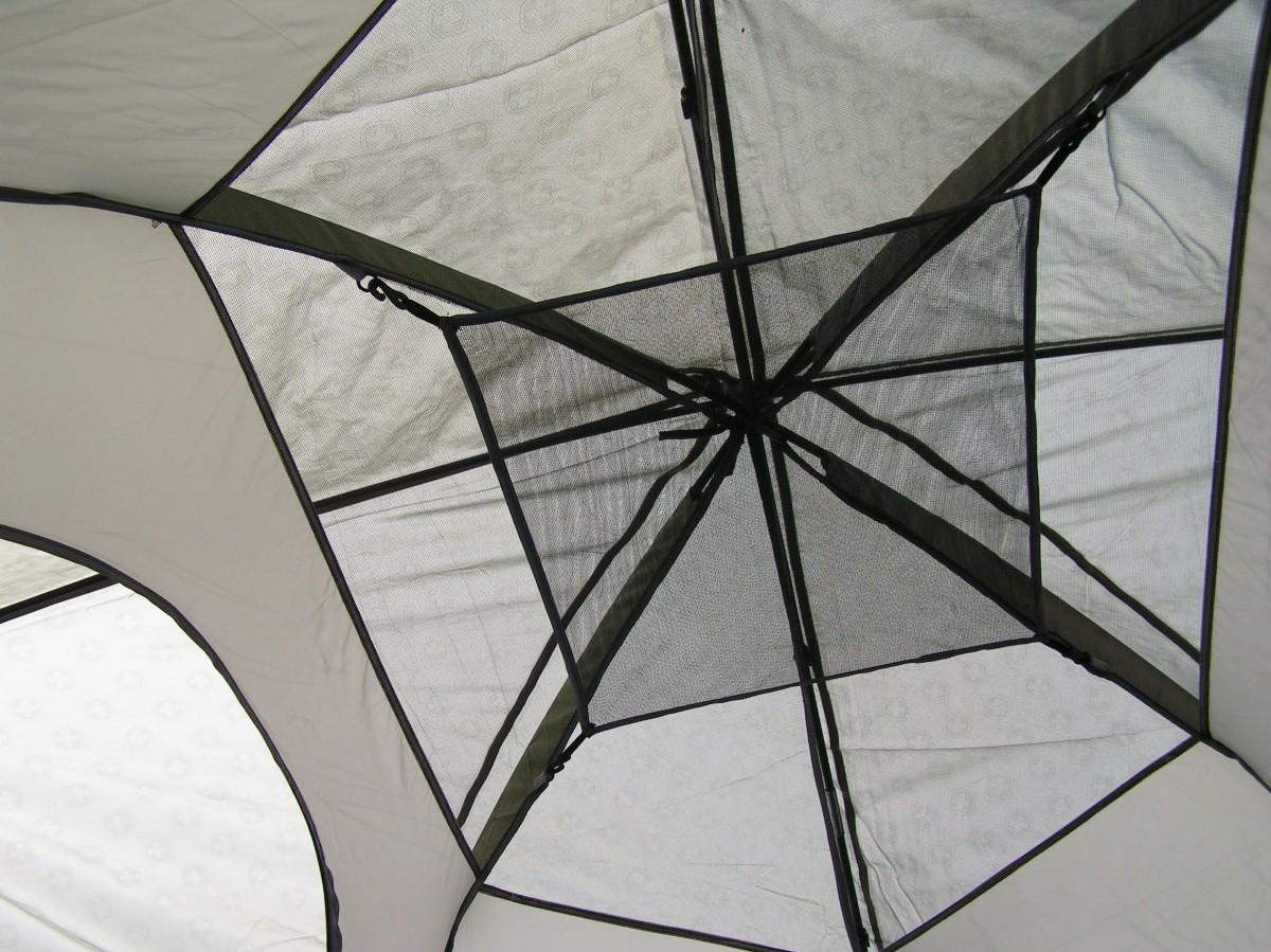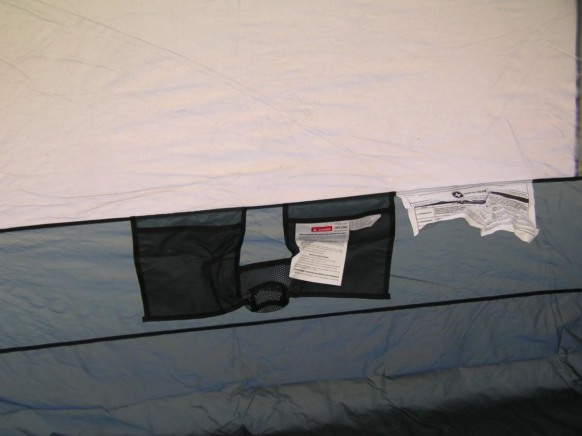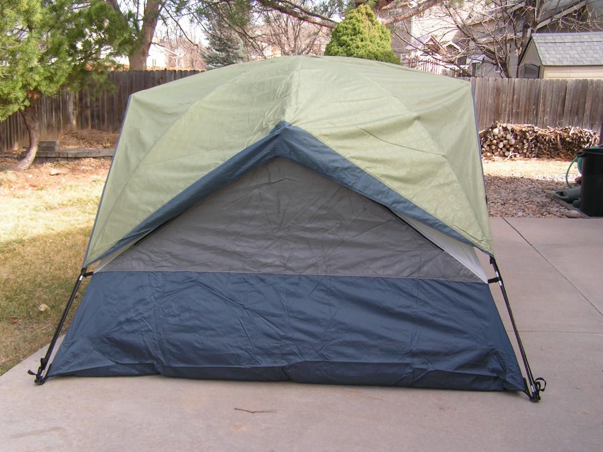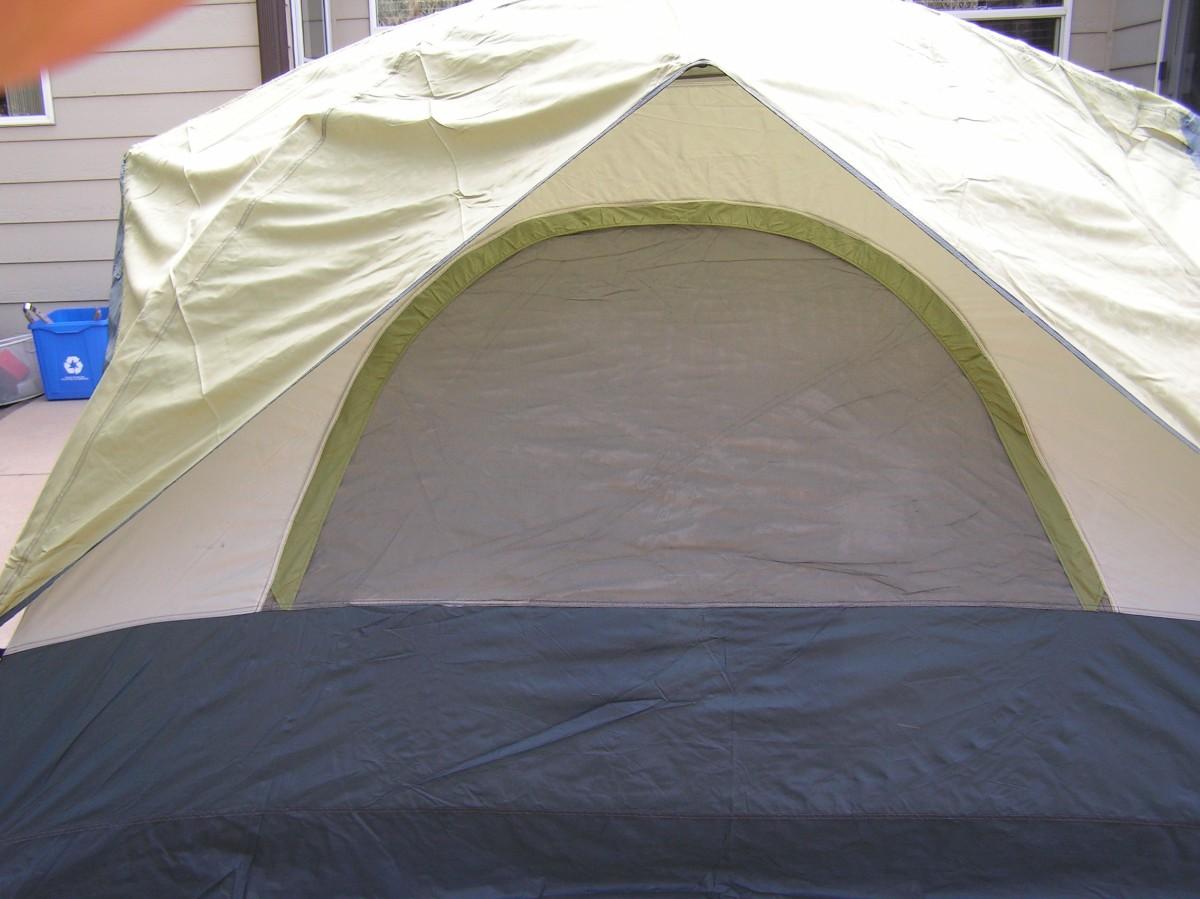 SwissGear Quality family size self supporting tent. Label says it's 9'x8'. It is roomy and 3 adults can be very comfortable, 4 is cozy but do-able. It's ample for 2 adults and 2 kids OR a bunch of kids. Waterproof floor and a rain fly keep you dry. Mesh ceiling, mesh window & door with zippered door/window cover blinds provide good air flow when needed. Stake down loops on the corners. Set up instructions are on the carry bag label as well as a replacement parts list (that's rare). This high quality tent looks barely used, it's in clean excellent+ condition.