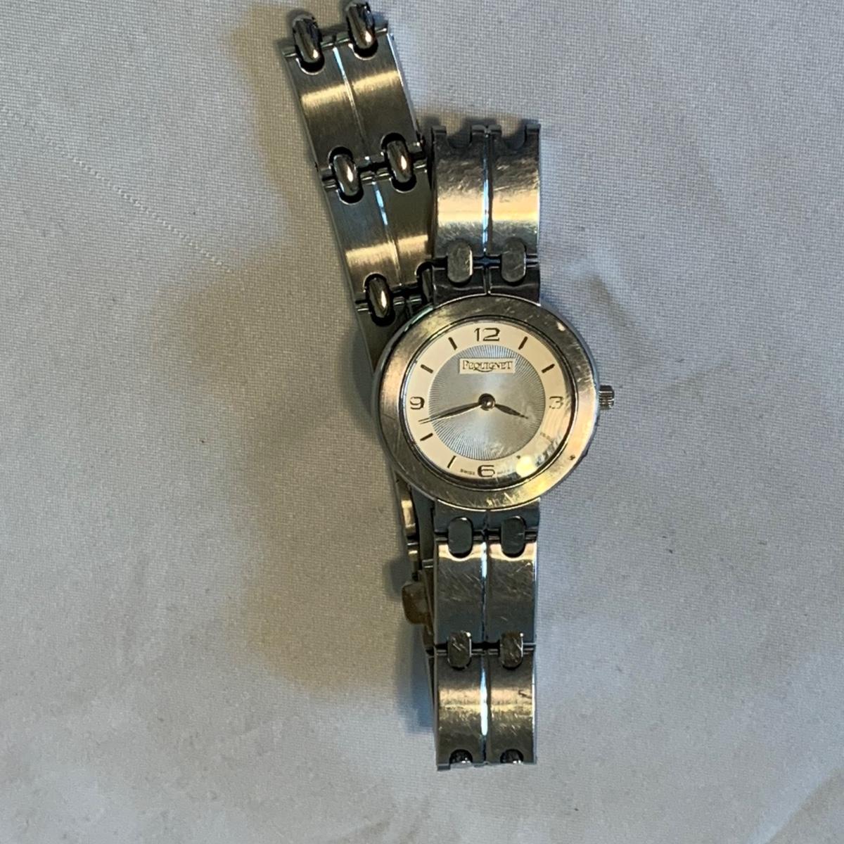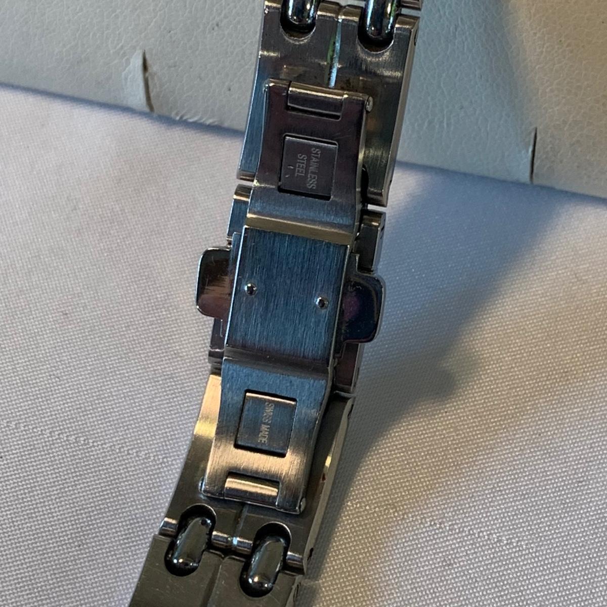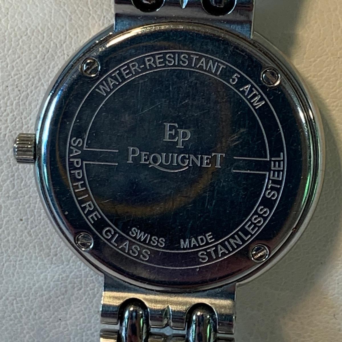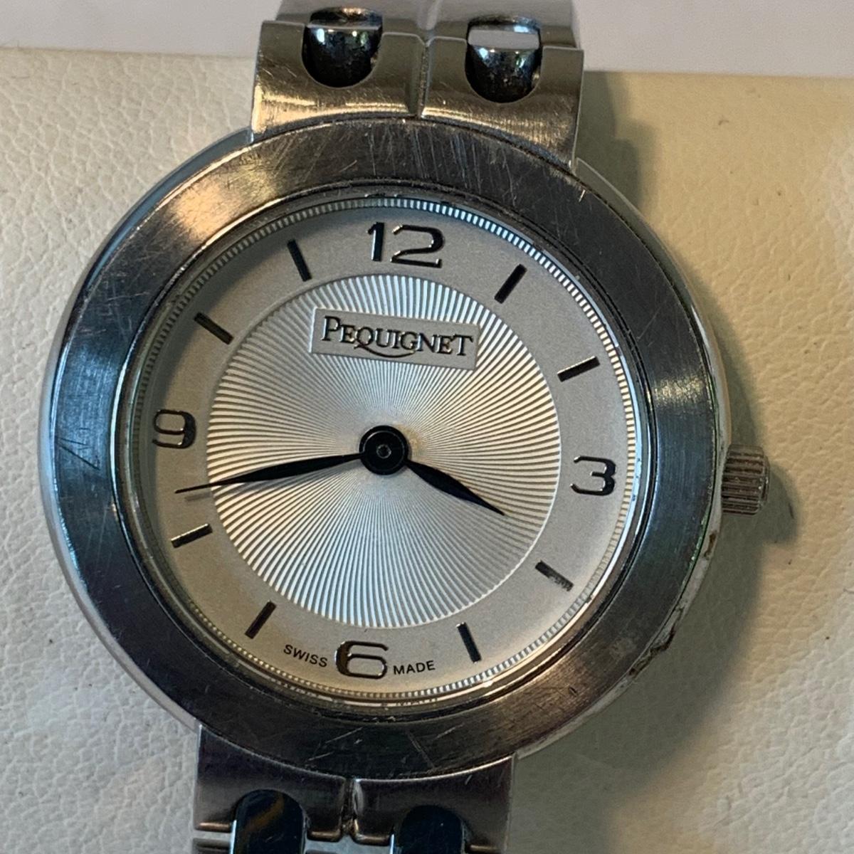 Swiss-made Pequignet stainless steel watch with sapphire glass. Watch is about 7” long. It needs a small repair to hold the band together. It is not currently ticking and likely needs a new battery.