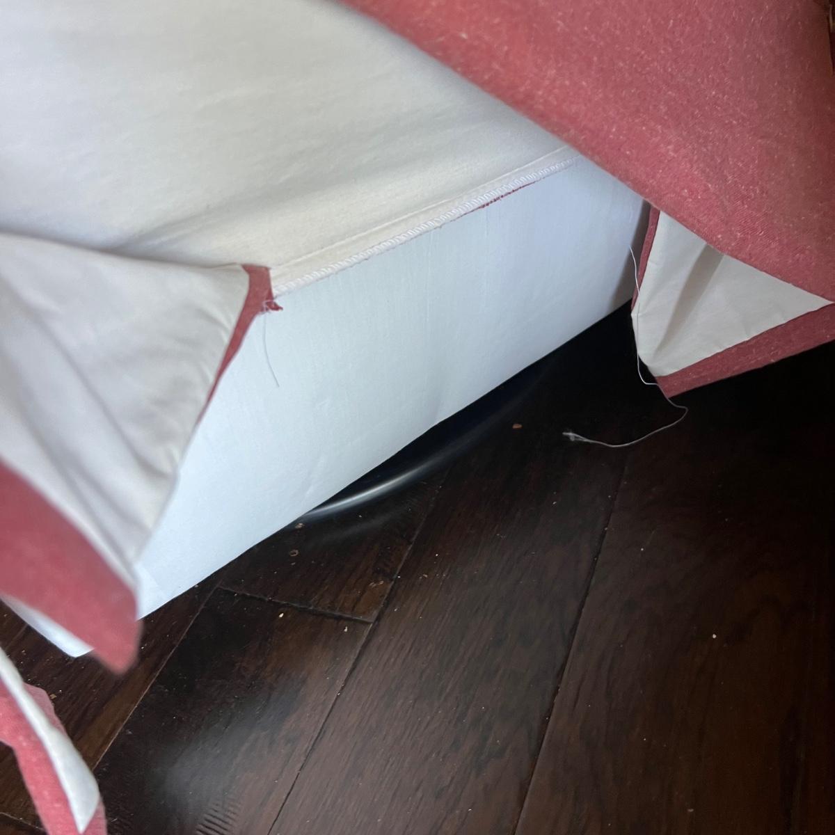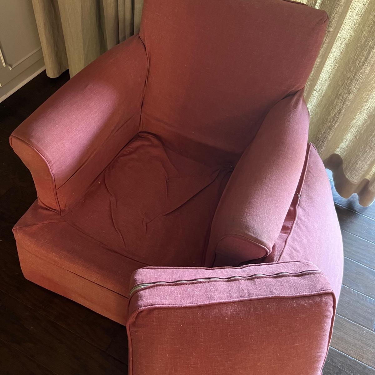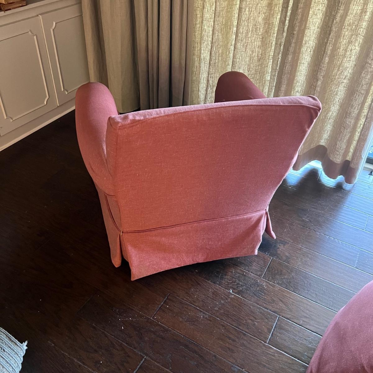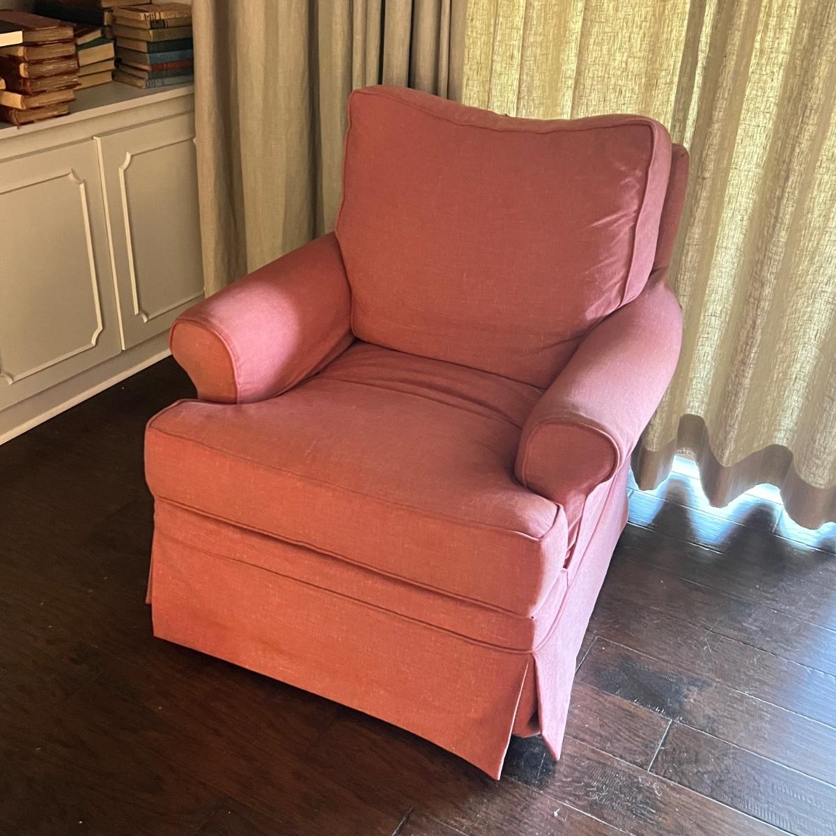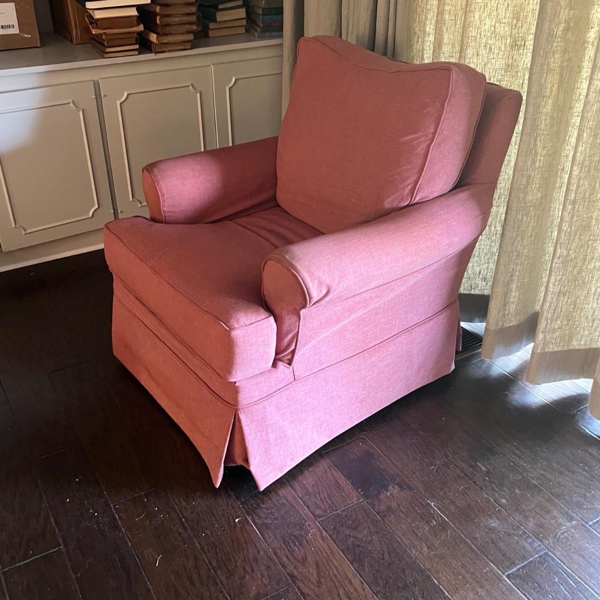 This arm chair swivels and rocks. It has a fitted slipcover that is a dusty pink color. Both seat and back cushions have removable covers. No mfg. labels found.