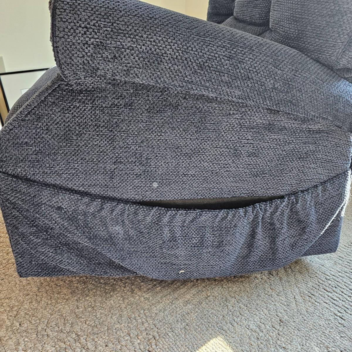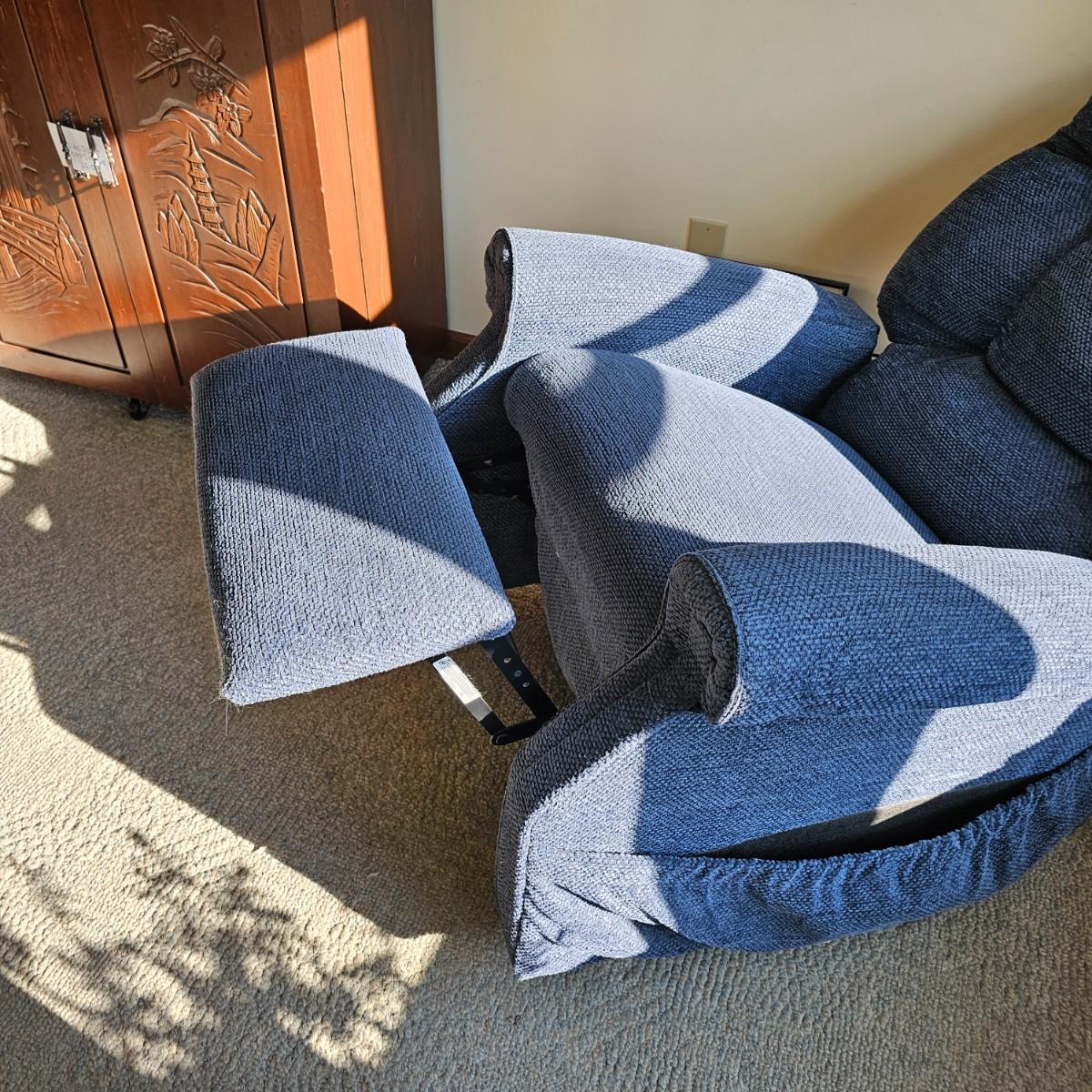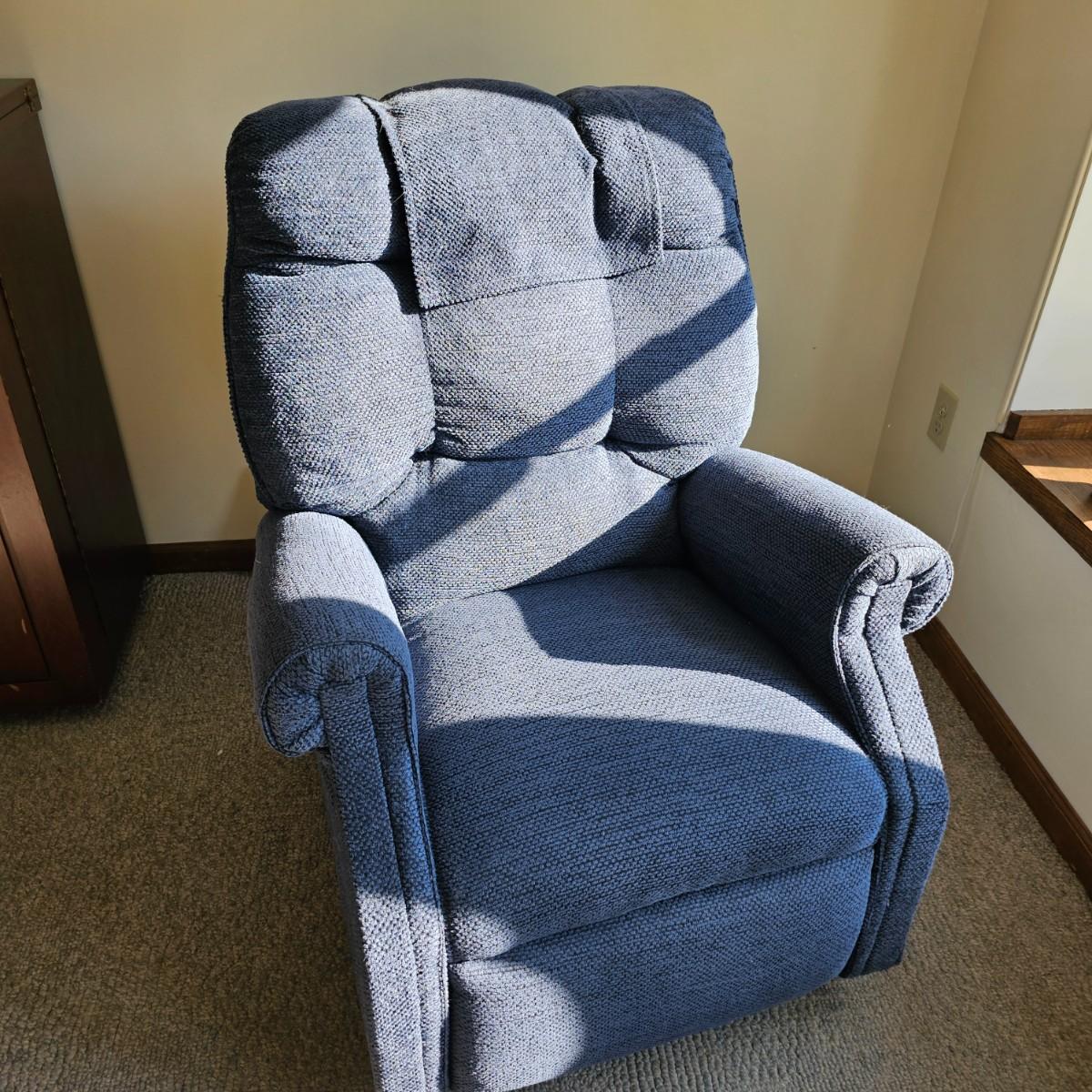 Dark blue upholstery, swivel capability and manual push back to recline. Rocker has side pocket, head and arm protectors. Chair measures 33" x 39" x 39"H, has 19" seat height. See photos for details. Items in the background are not included but can be found elsewhere in this auction. Local pickup only. Winning bidder must bring assistance to help move and load this item due to its weight and/or size. This item is located on the ground floor with three steps down from the porch to the driveway.