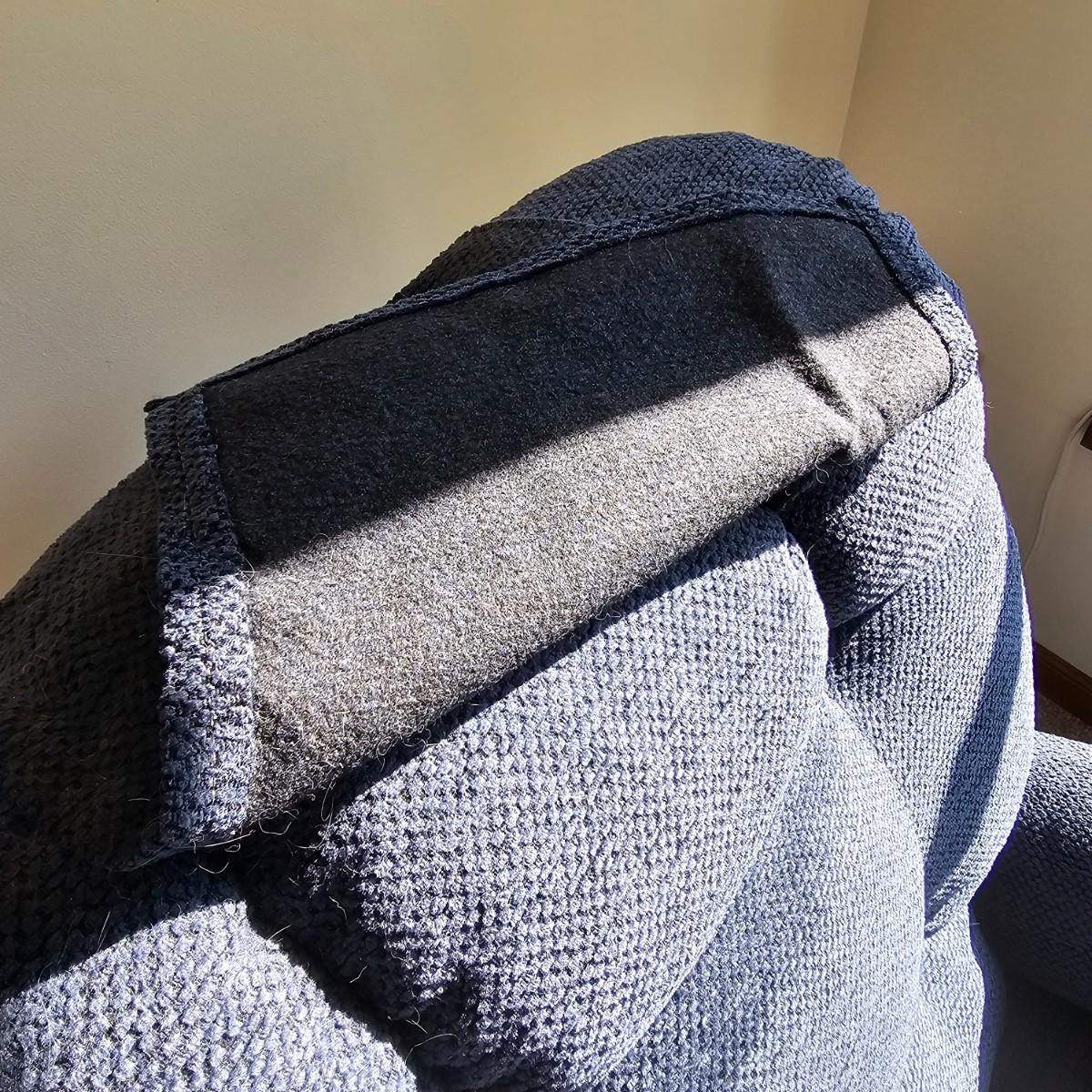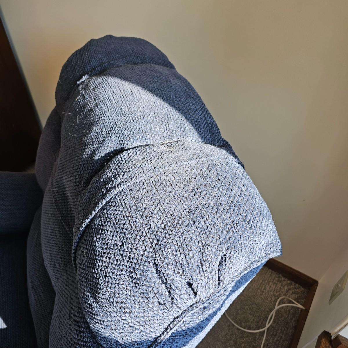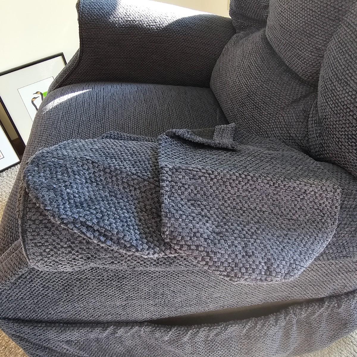 Dark blue upholstery, swivel capability and manual push back to recline. Rocker has side pocket, head and arm protectors. Chair measures 33" x 39" x 39"H, has 19" seat height. See photos for details. Items in the background are not included but can be found elsewhere in this auction. Local pickup only. Winning bidder must bring assistance to help move and load this item due to its weight and/or size. This item is located on the ground floor with three steps down from the porch to the driveway.