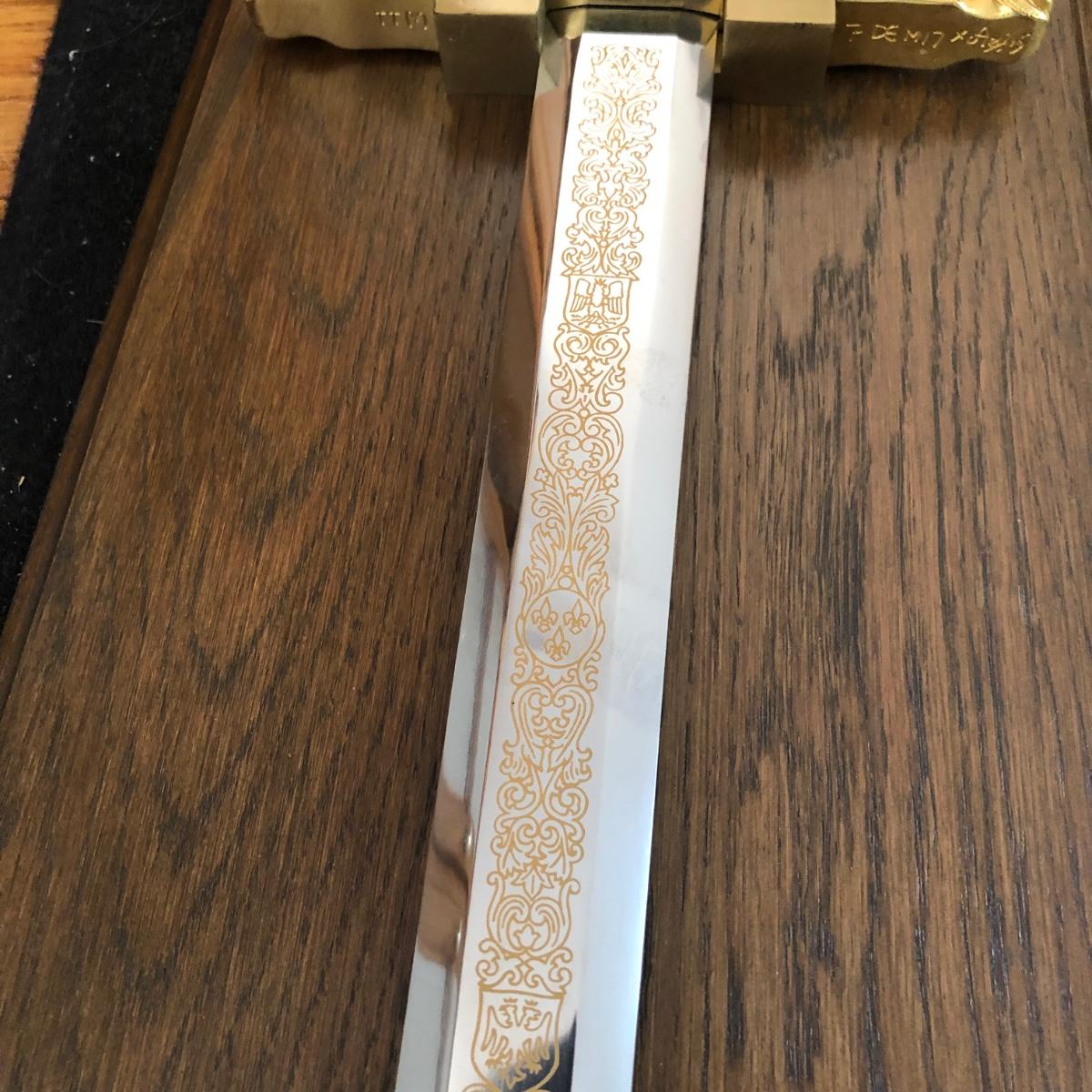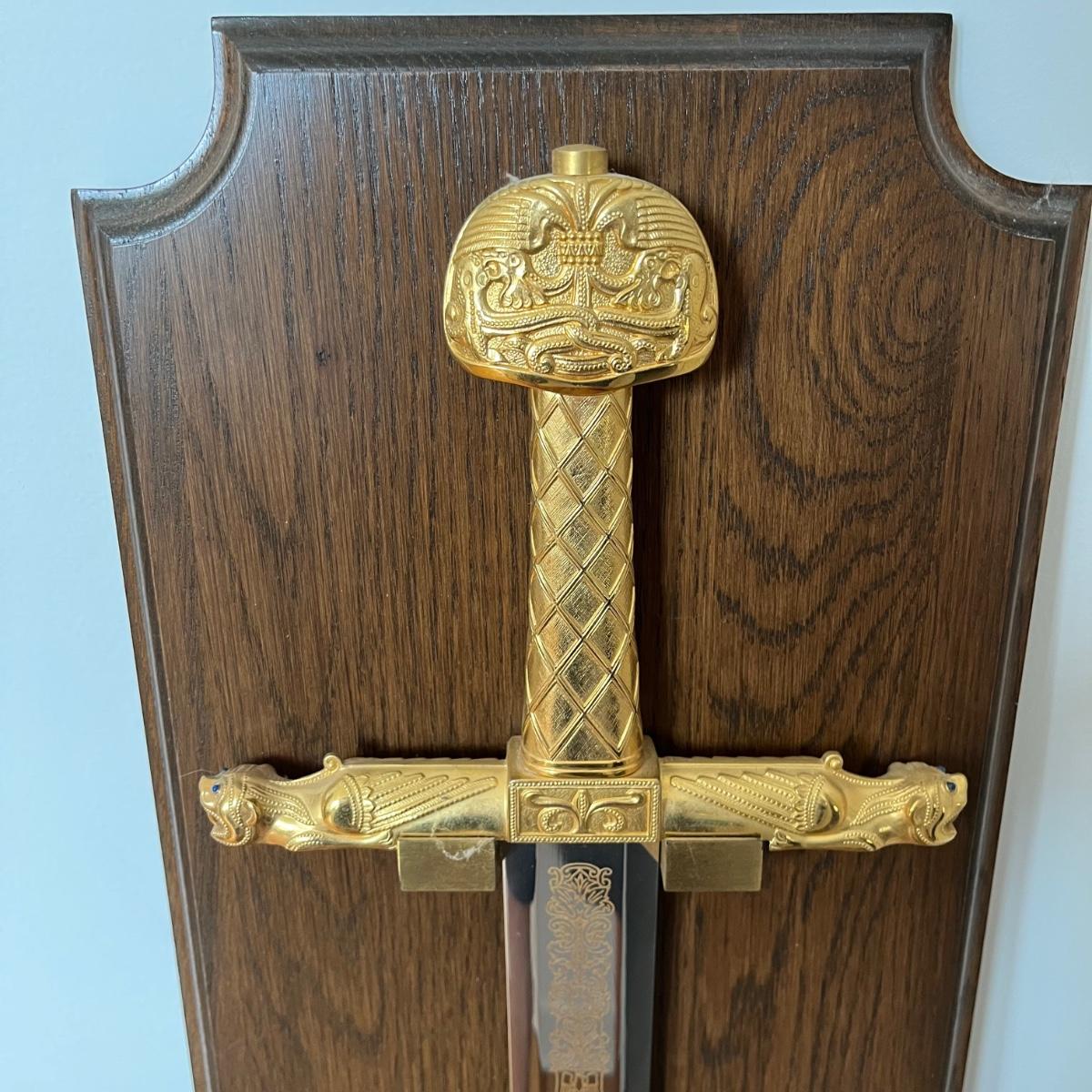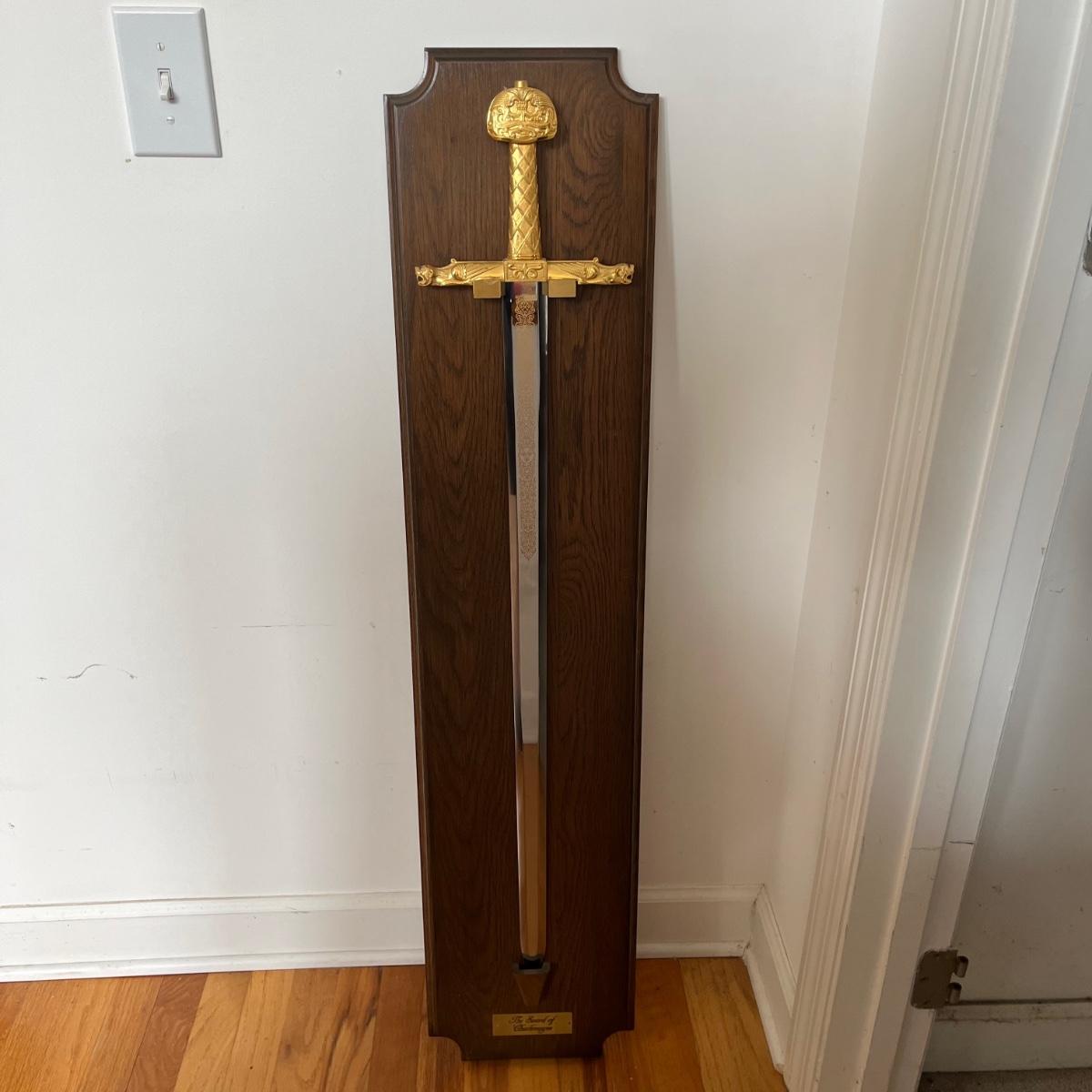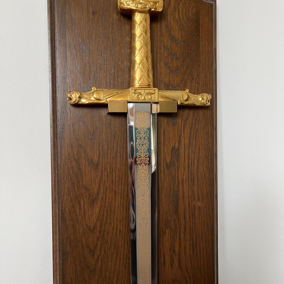 Lot includes the Sword of Charlemagne replica with wooden wall mount. Sword has these marking on handle TTM 7DEM17. Wall mount measures 10” x 45”. The handle of the sword is metal and painted gold. The bald has a gold painted design near the top of the blade.