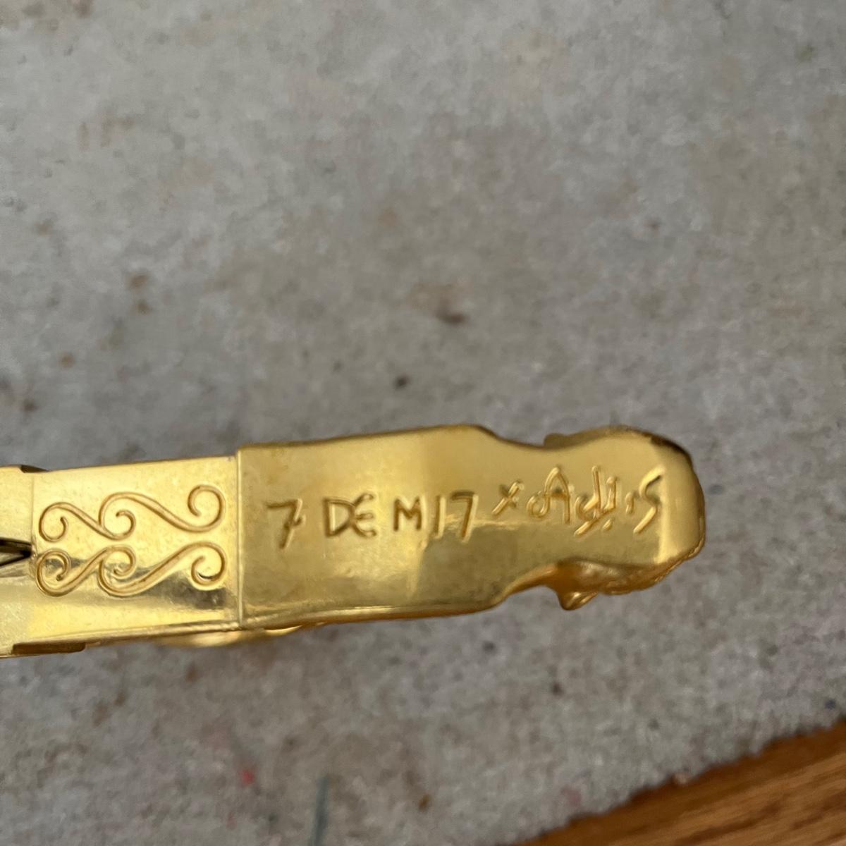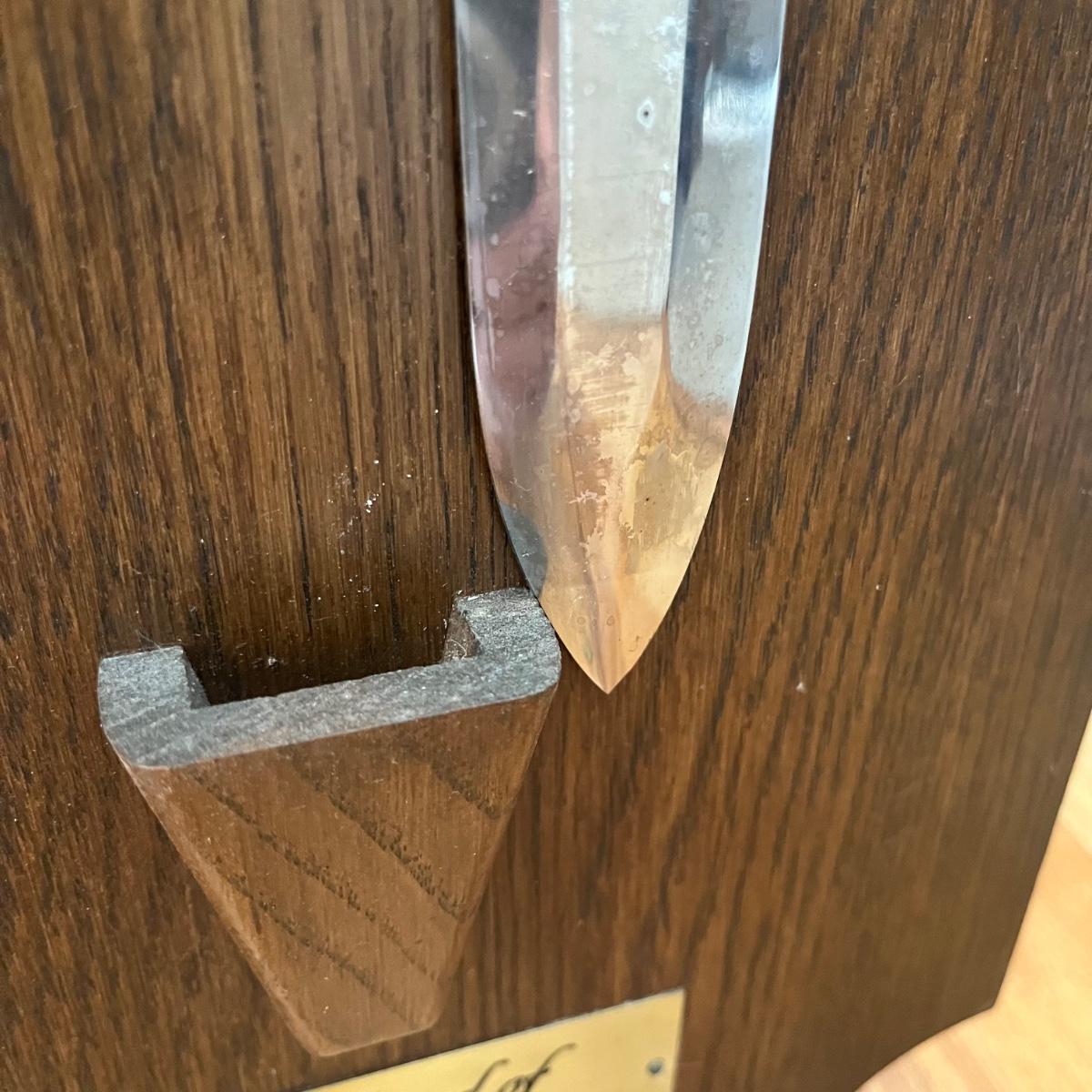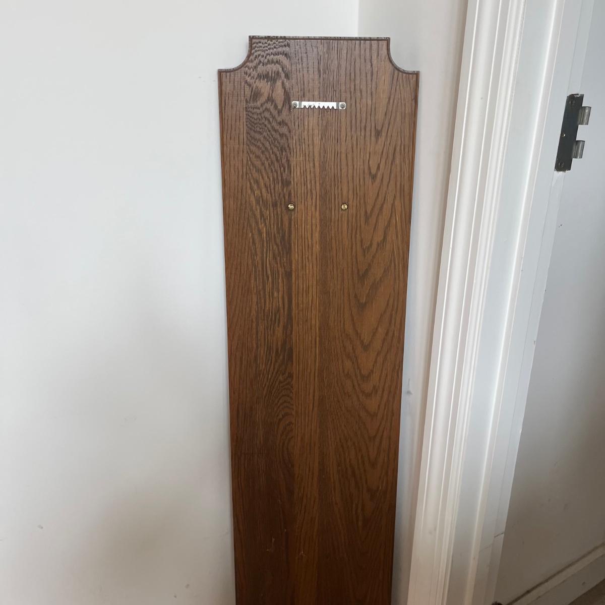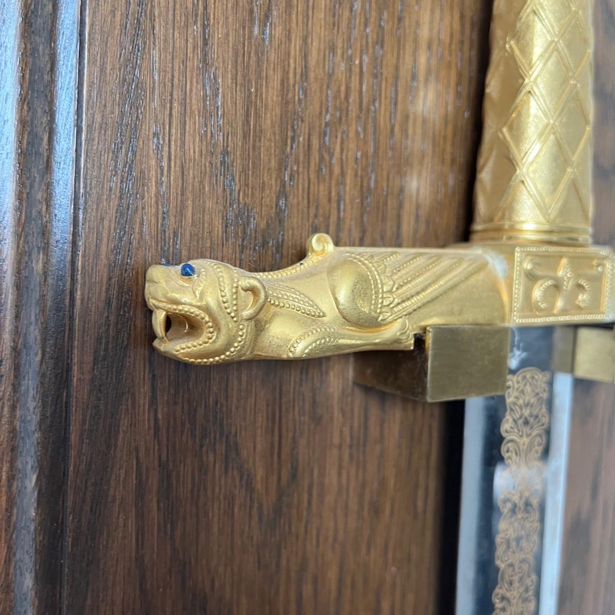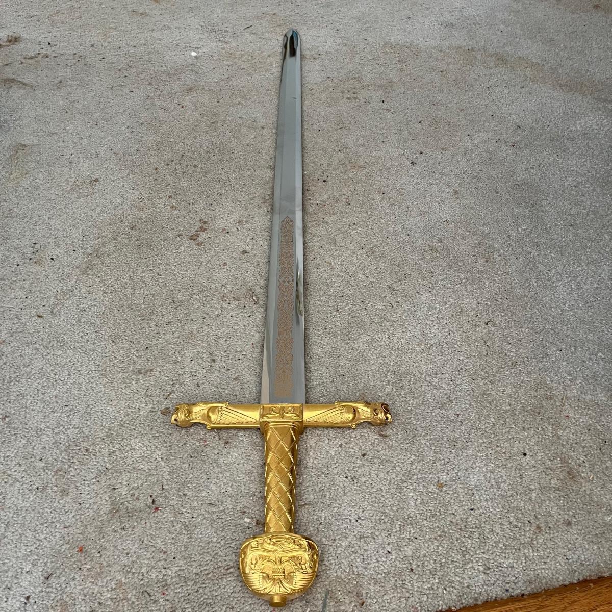 Lot includes the Sword of Charlemagne replica with wooden wall mount. Sword has these marking on handle TTM 7DEM17. Wall mount measures 10” x 45”. The handle of the sword is metal and painted gold. The bald has a gold painted design near the top of the blade.