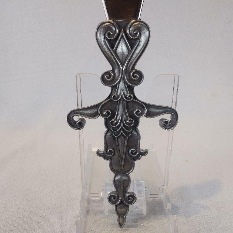 This is a Sword-Shaped Pewter-Handled Letter Opener. No maker noted but very ornate and in very good condition. It measures 9-inches long.