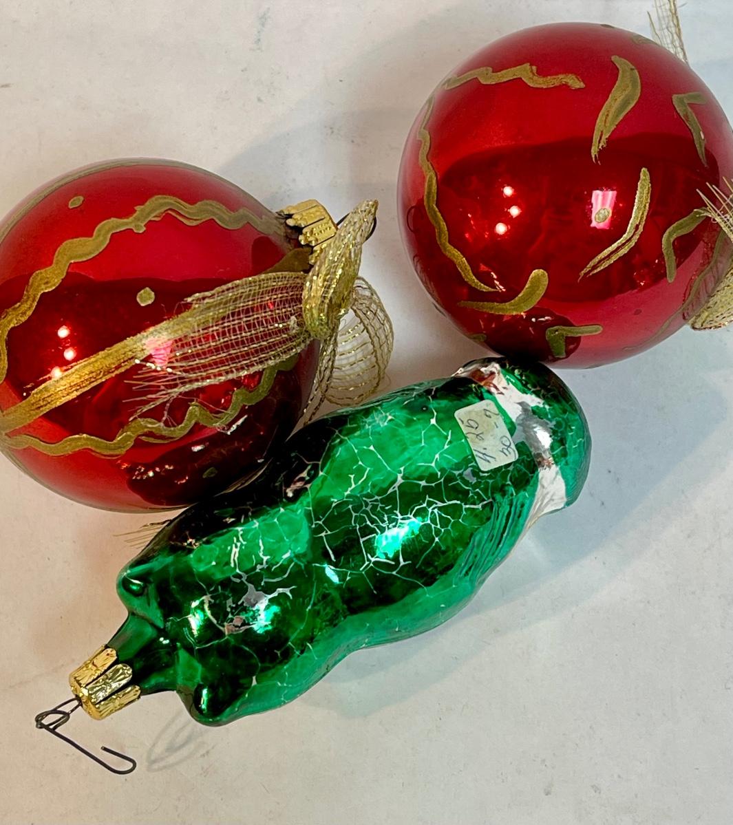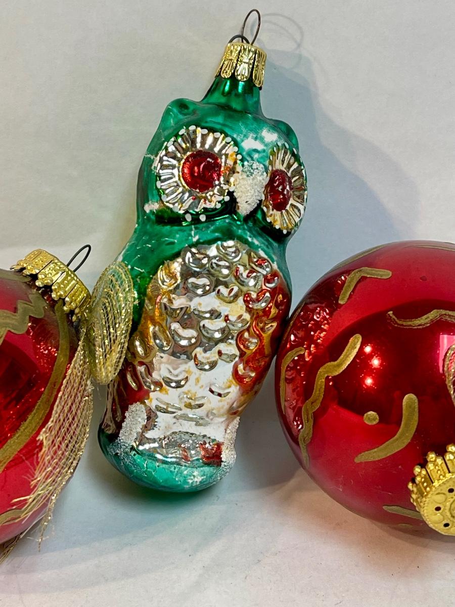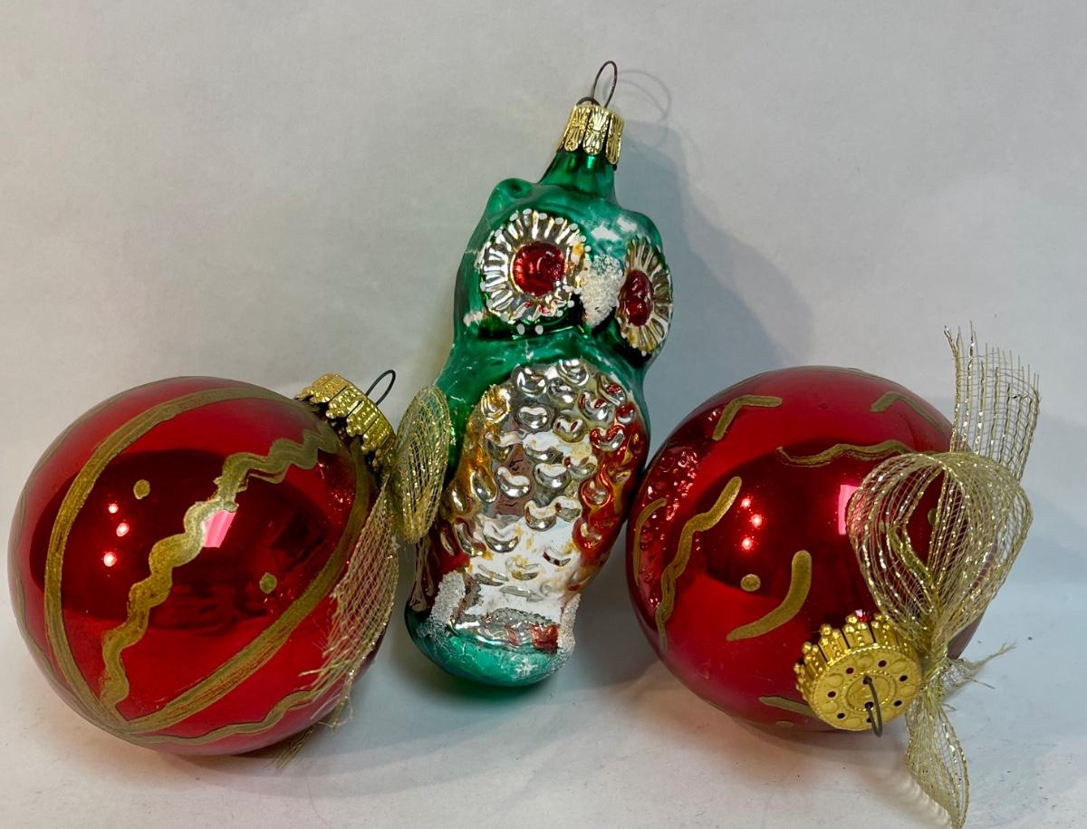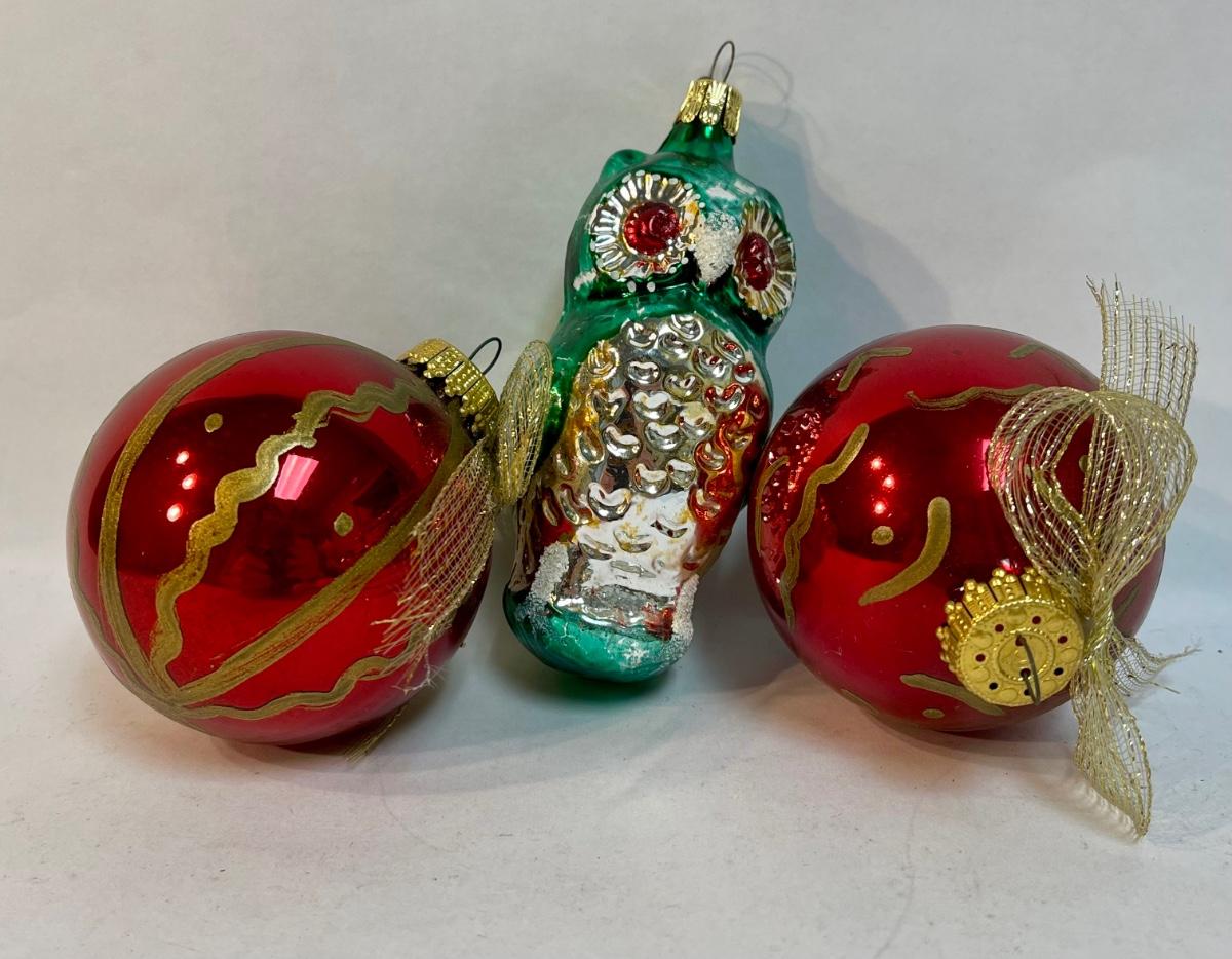 3 Glass Christmas Tree Ornaments - owl and round red & gold