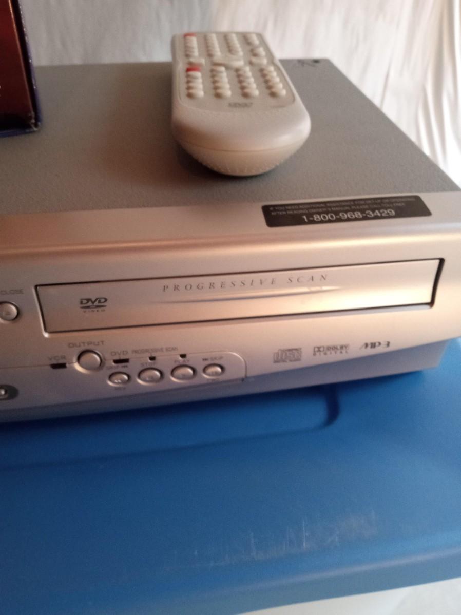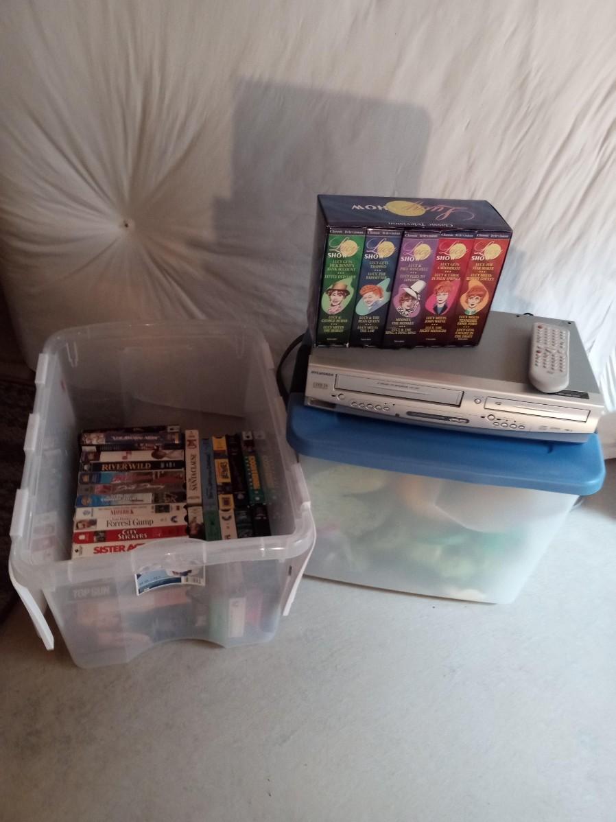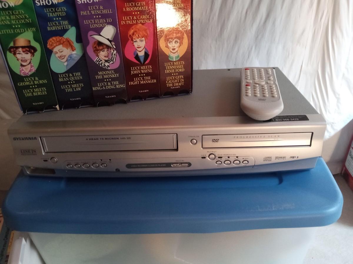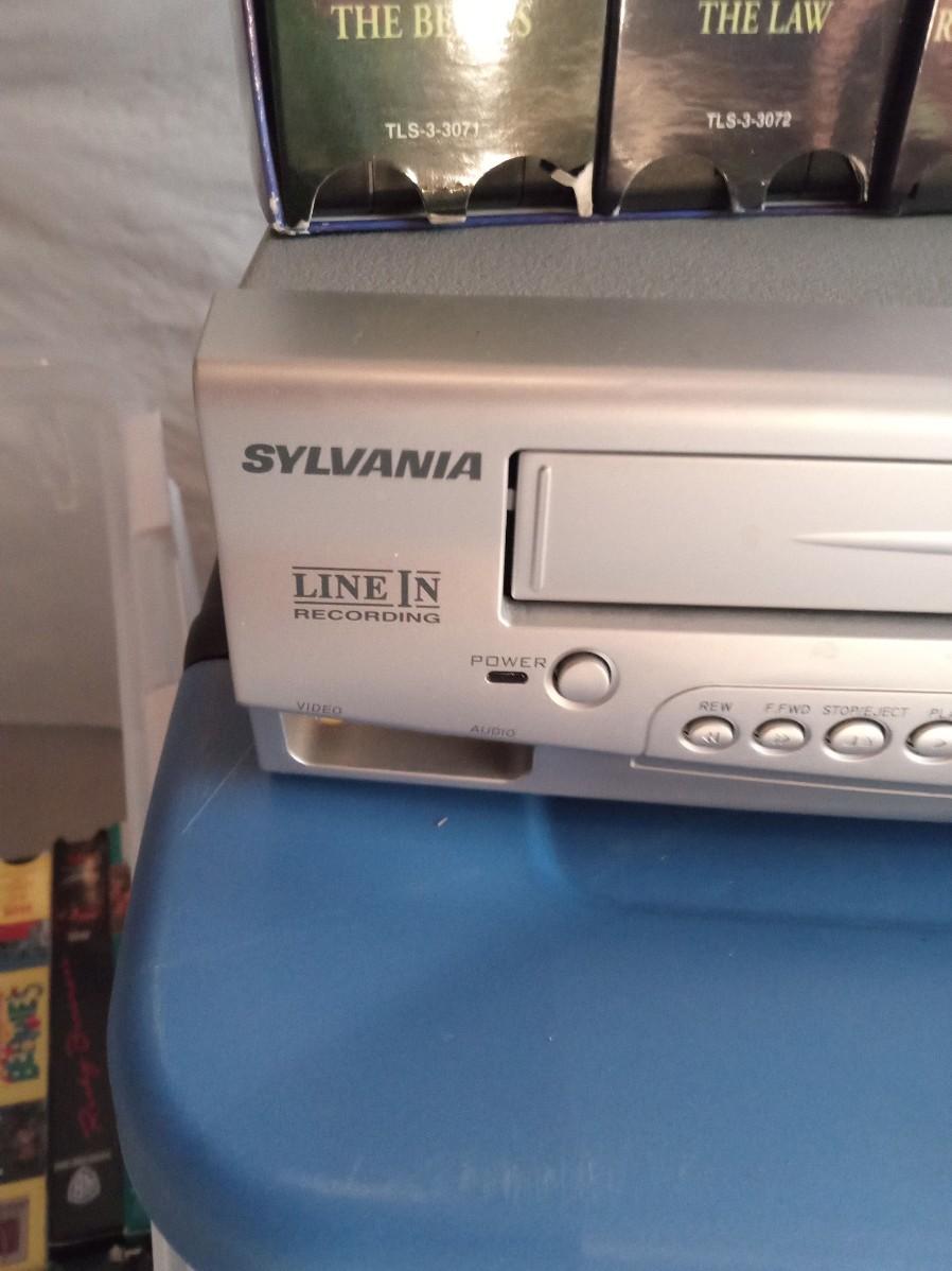 SYLVANIA COMBO VHS/DVD PLAYER WITH REMOTE AND TOTE FULL OF VHS MOVIES
