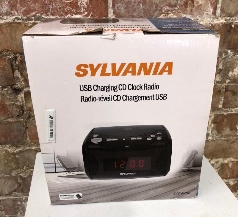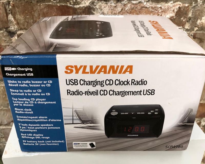 New in the box here is a USB Charging CD Clock Radio from Slyvania...