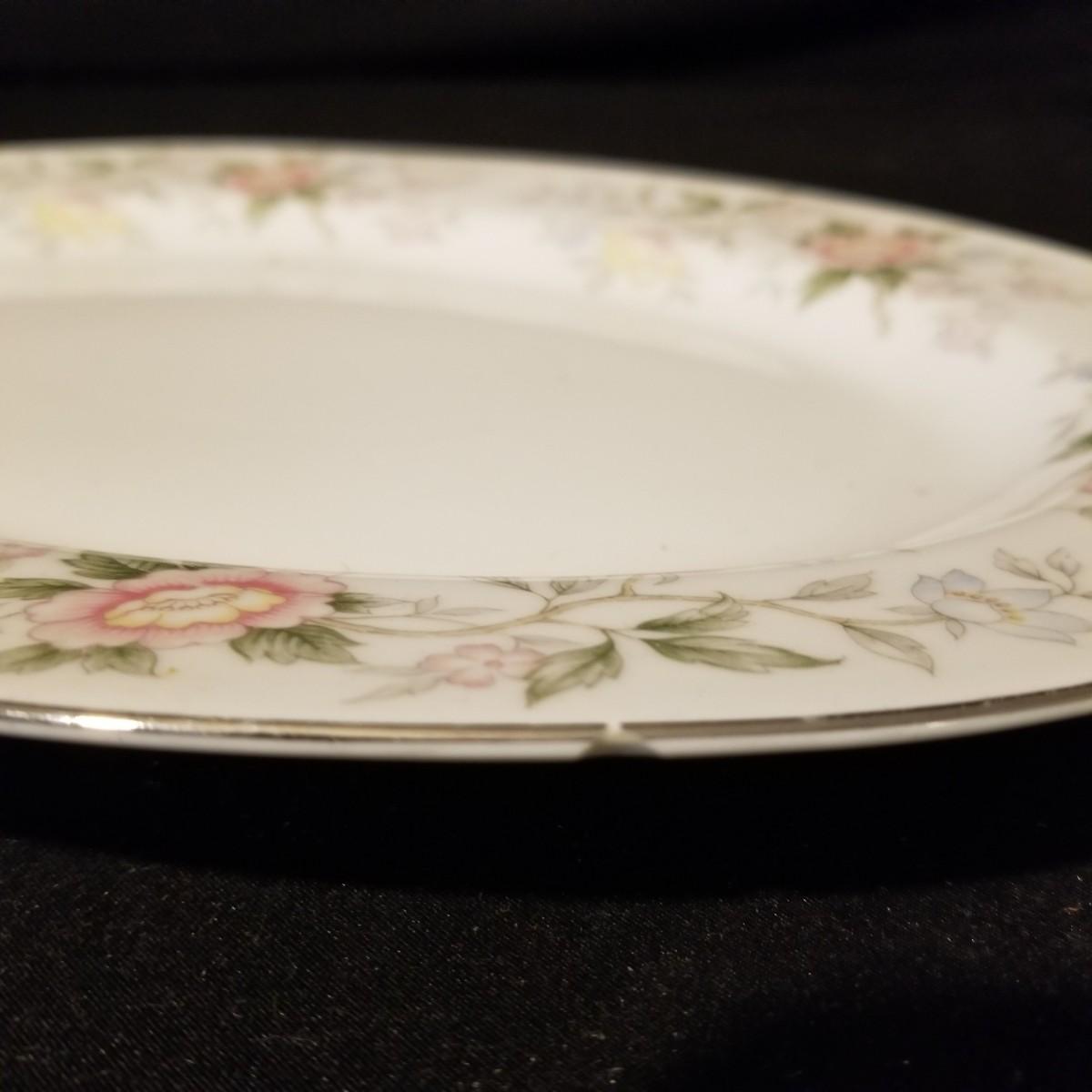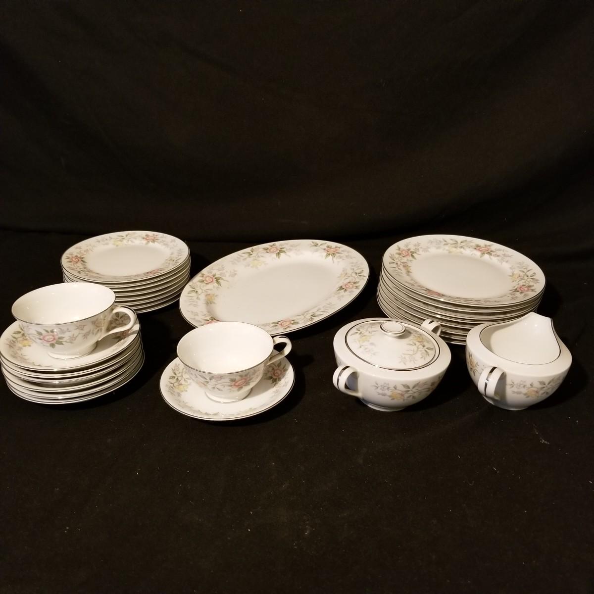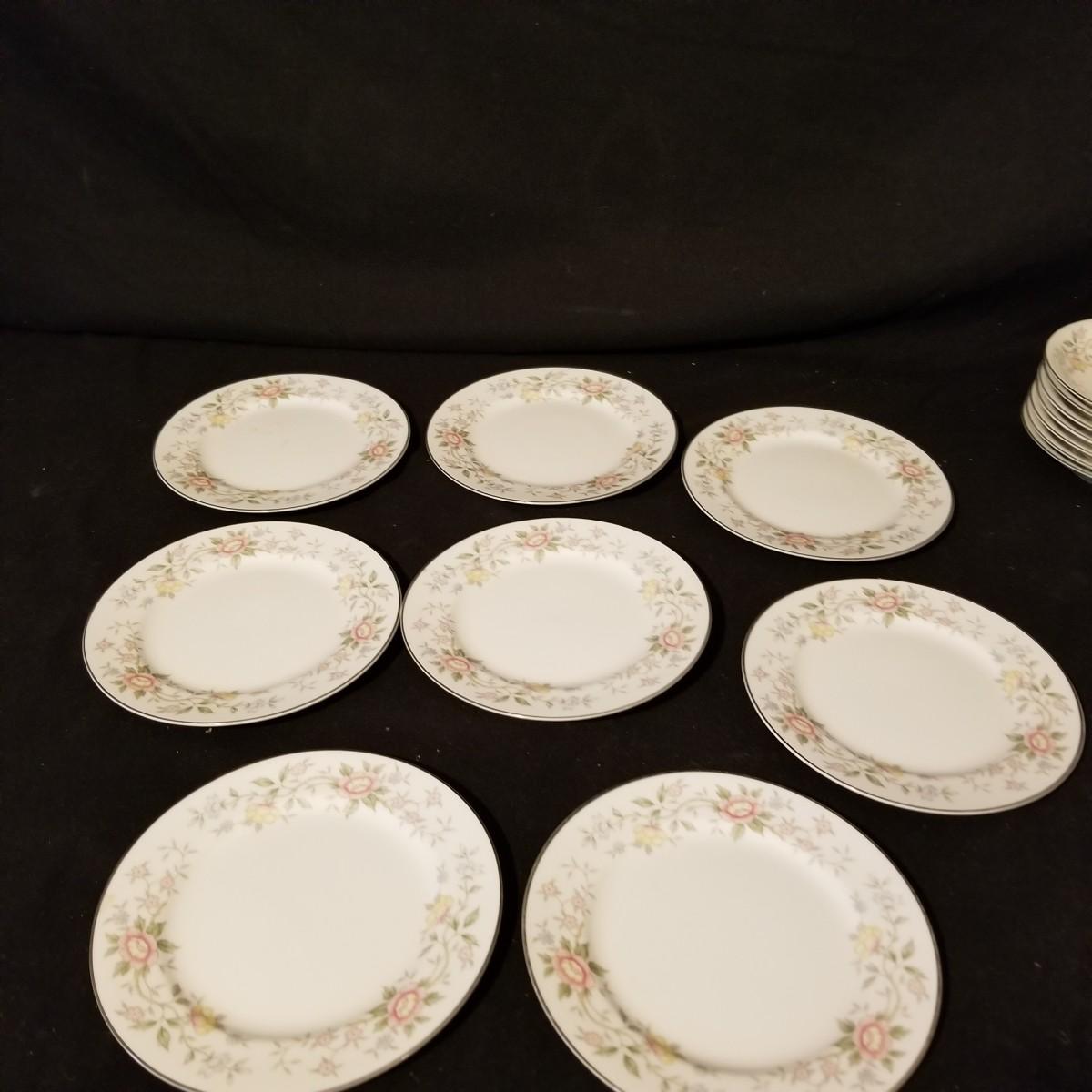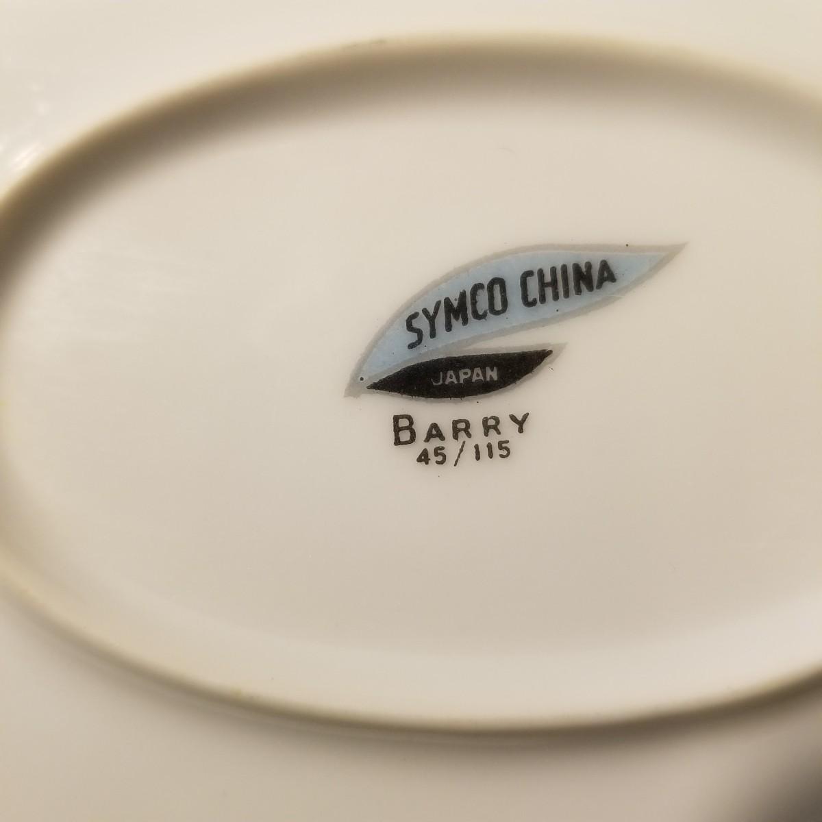 Small set of Symco brand china, made in Japan. Delicate flower pattern (Barry 45/115) with silver rim. There are twenty-eight pieces total. Eight salad plates, 8"d, eight bread plates, 6.5"d, seven saucers, two cups, one creamer/sugar set w/lid, and one small serving platter, 9"x12". Platter has two small chip in rim. See photos for details. Shipping available.