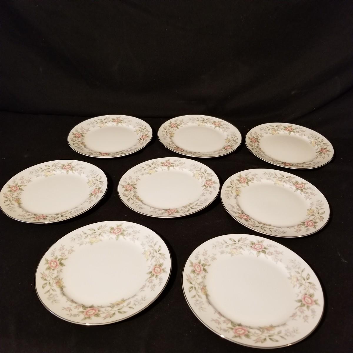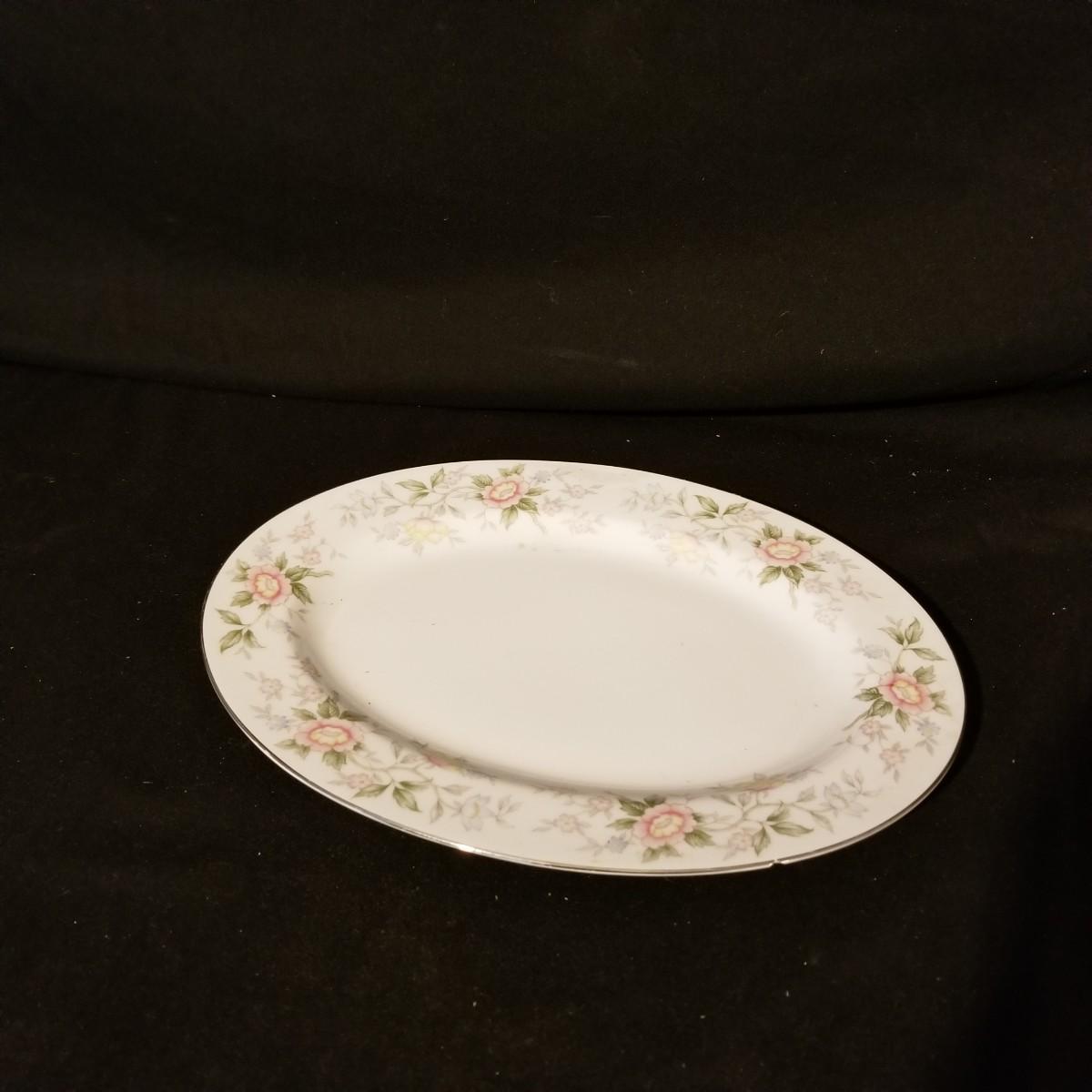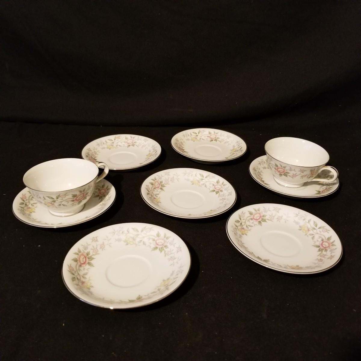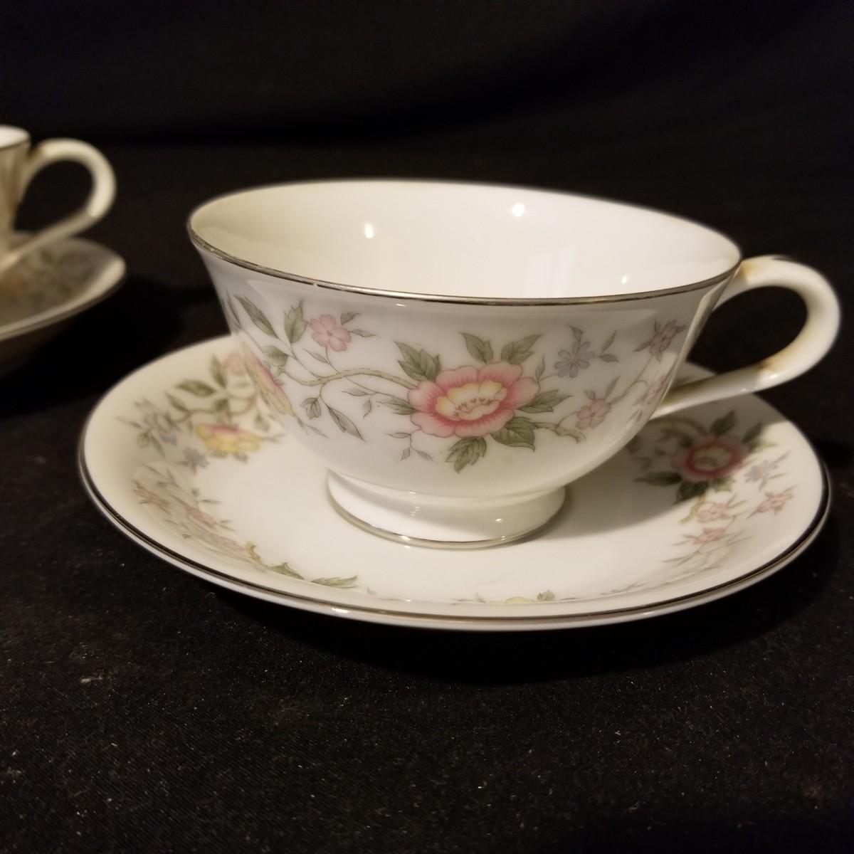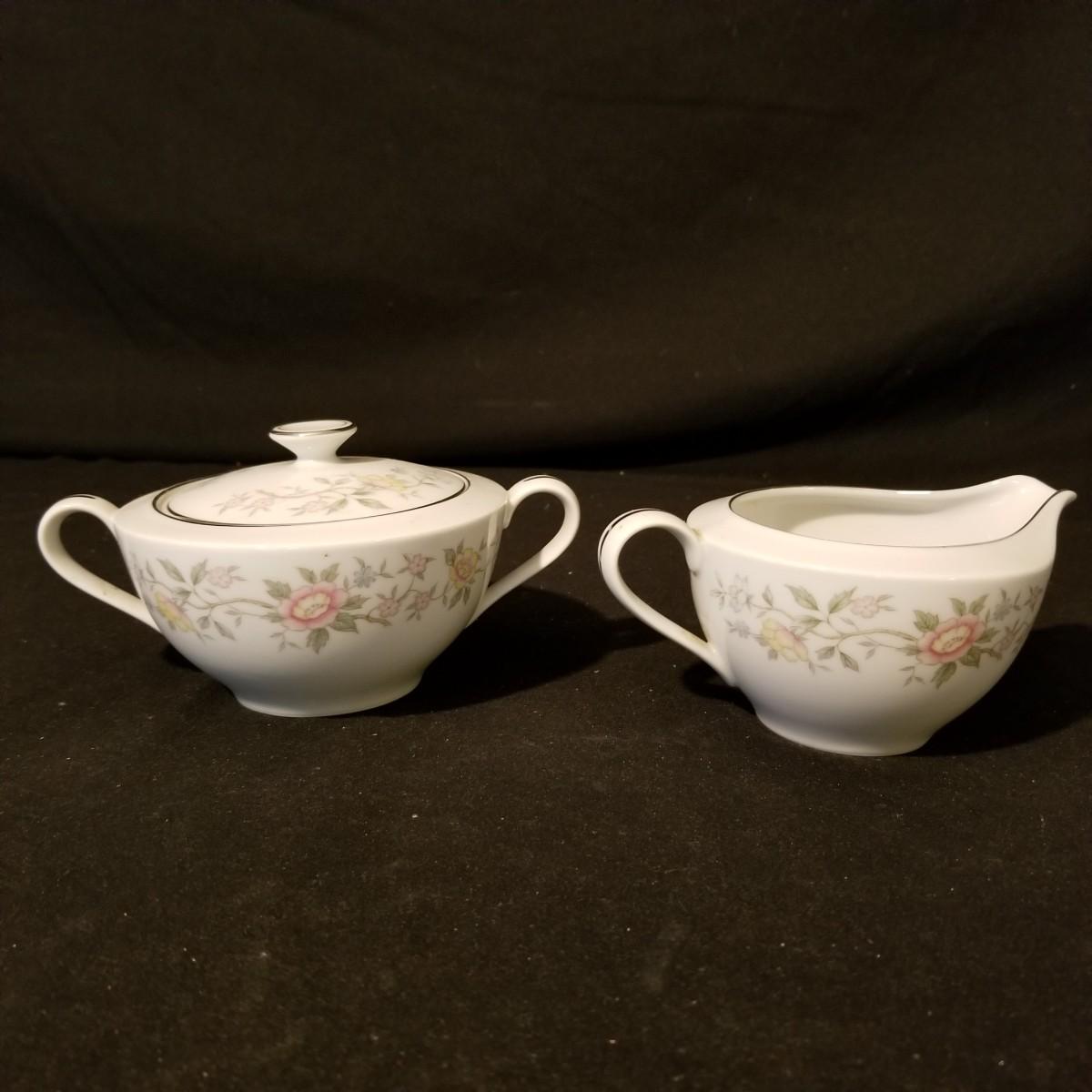 Small set of Symco brand china, made in Japan. Delicate flower pattern (Barry 45/115) with silver rim. There are twenty-eight pieces total. Eight salad plates, 8"d, eight bread plates, 6.5"d, seven saucers, two cups, one creamer/sugar set w/lid, and one small serving platter, 9"x12". Platter has two small chip in rim. See photos for details. Shipping available.
