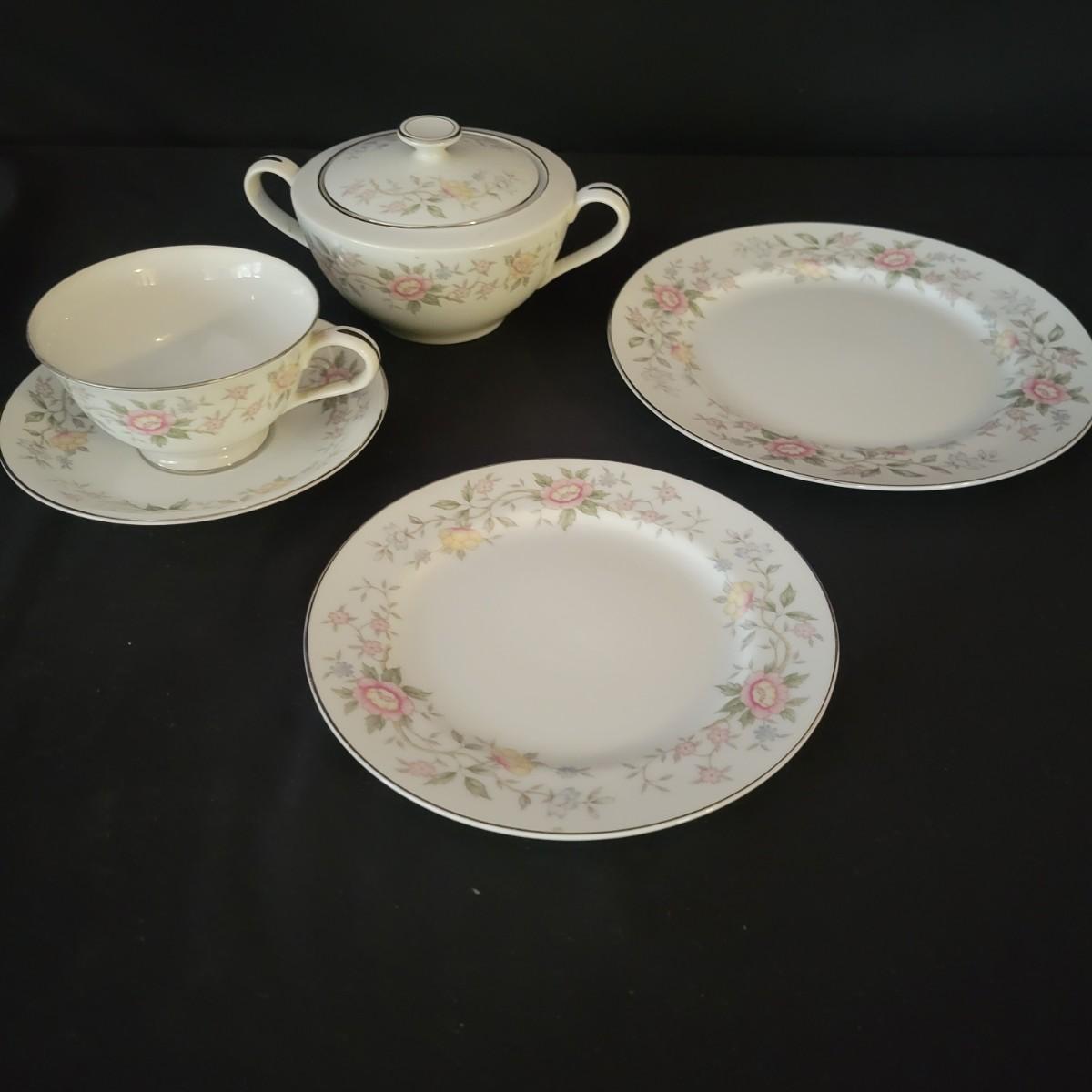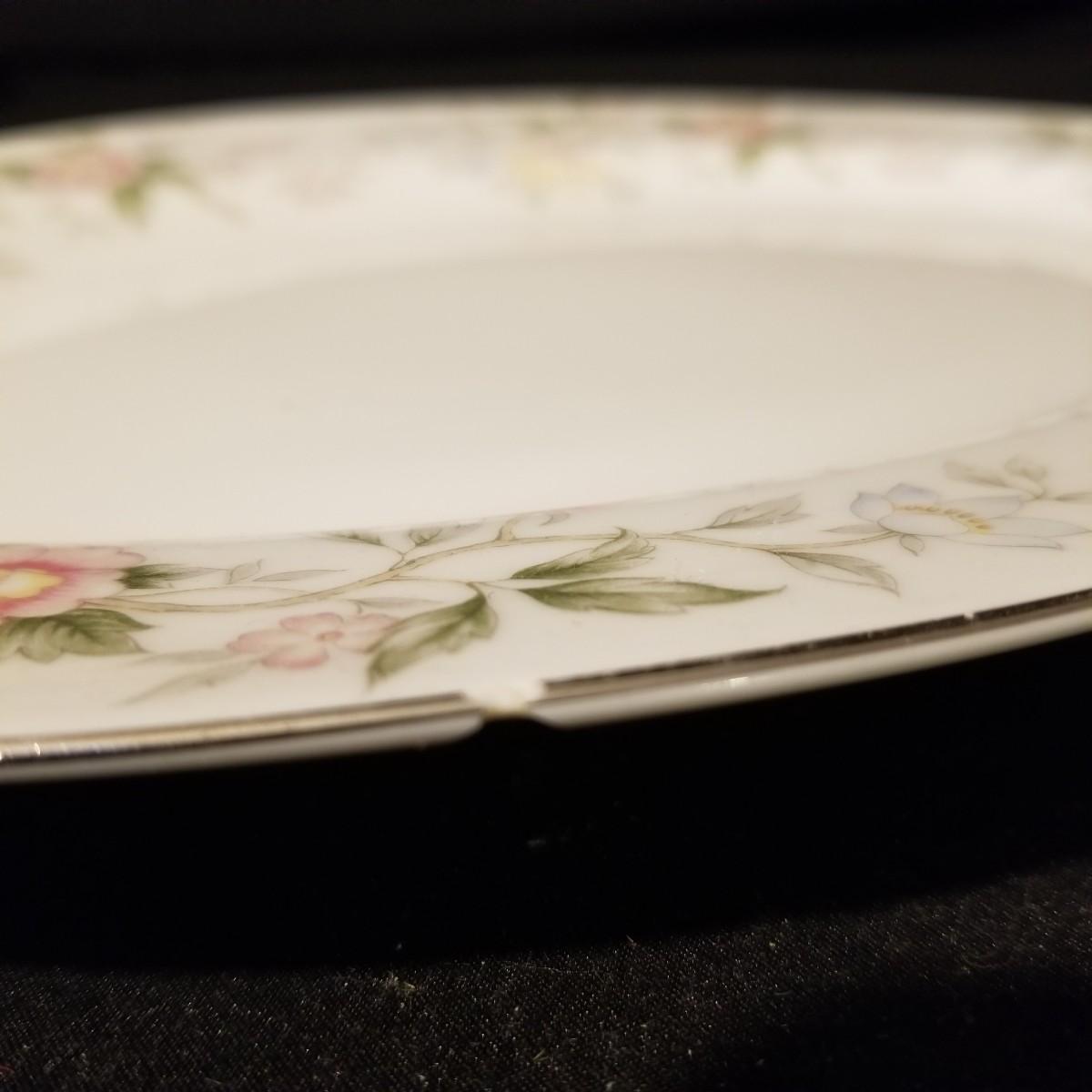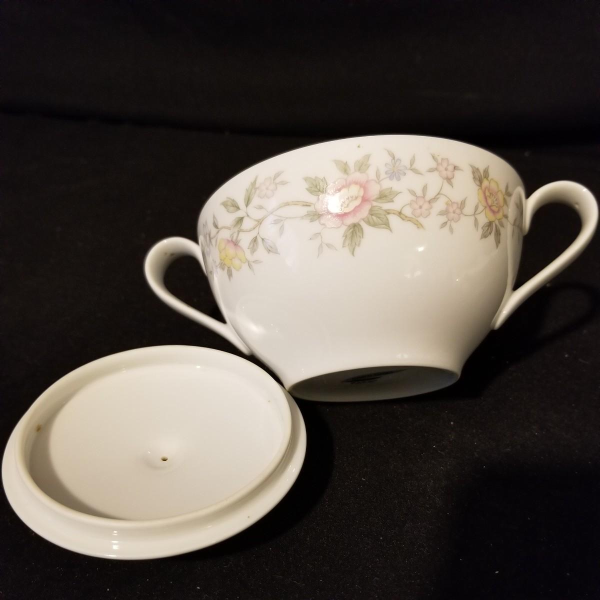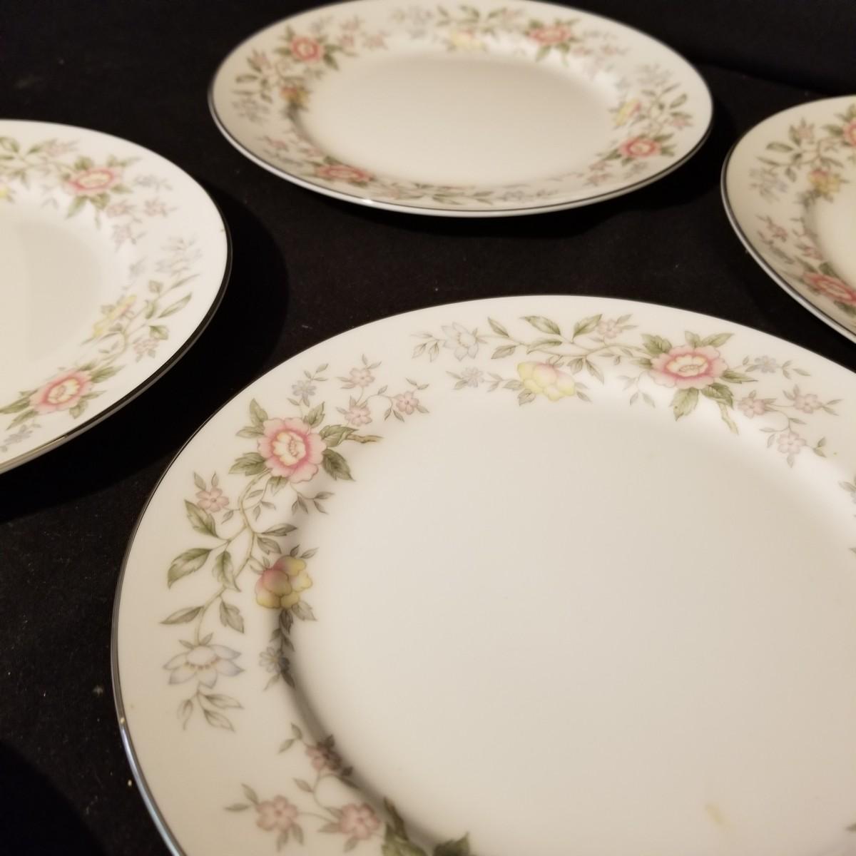 Small set of Symco brand china, made in Japan. Delicate flower pattern (Barry 45/115) with silver rim. There are twenty-eight pieces total. Eight salad plates, 8"d, eight bread plates, 6.5"d, seven saucers, two cups, one creamer/sugar set w/lid, and one small serving platter, 9"x12". Platter has two small chip in rim. See photos for details. Shipping available.