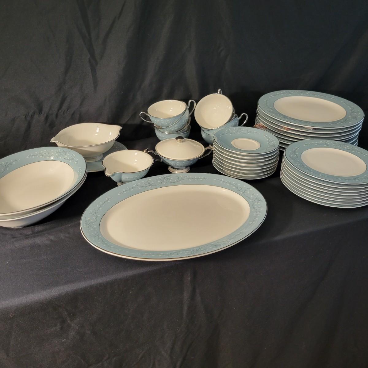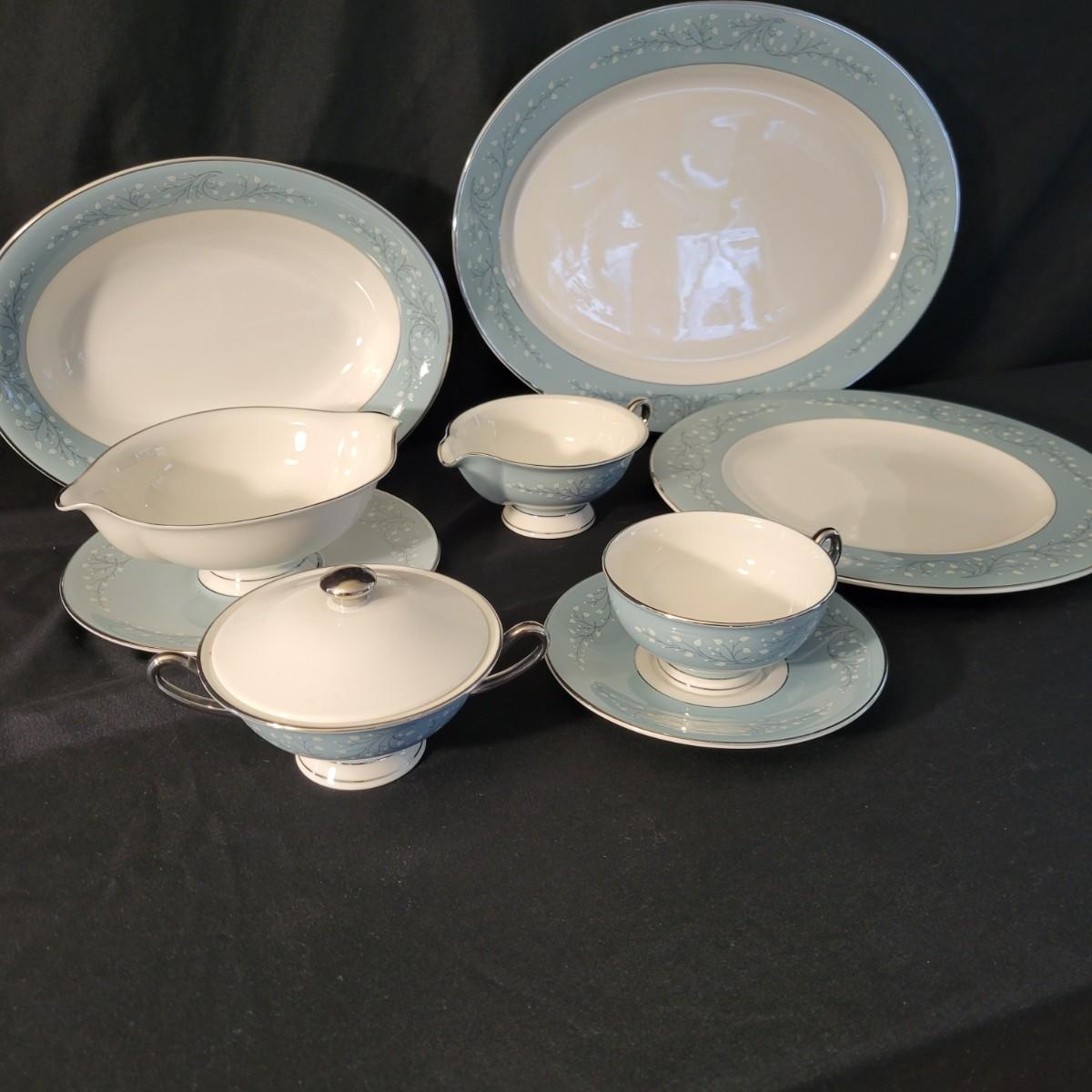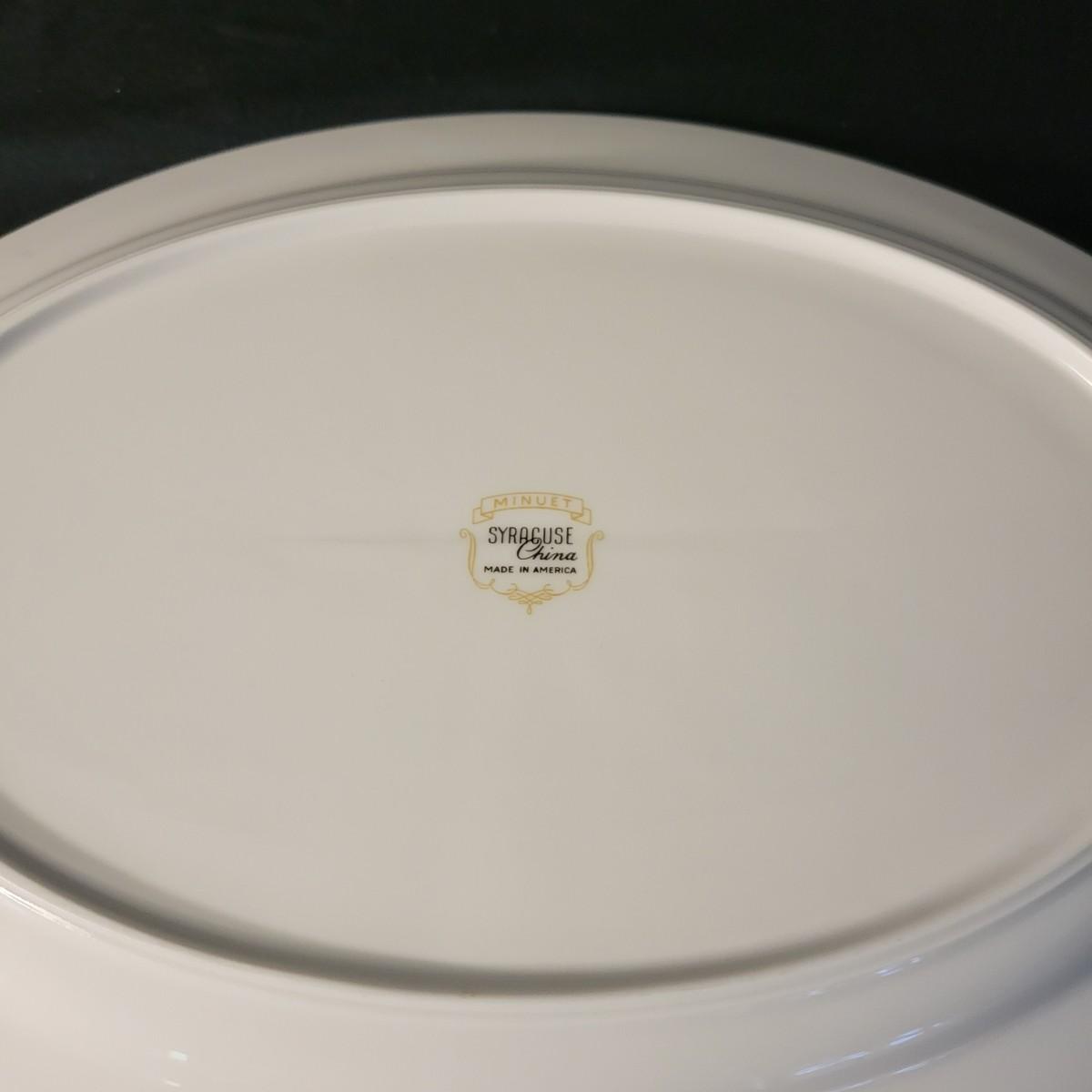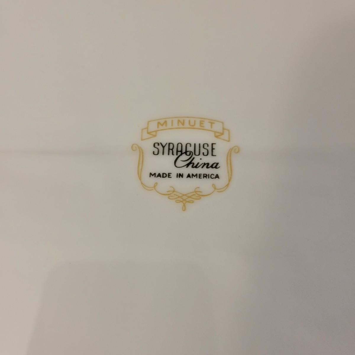 A four piece, eight place setting china set made by Syracuse China "Minuet" pattern in excellent condition that includes additional pieces. Included is a cream bowl, a sugar bowl, a gravy boat, two large bowls and a serving plate. Serving plate measures approximately 14" x 10.5 " Local pickup only