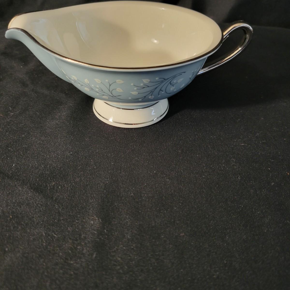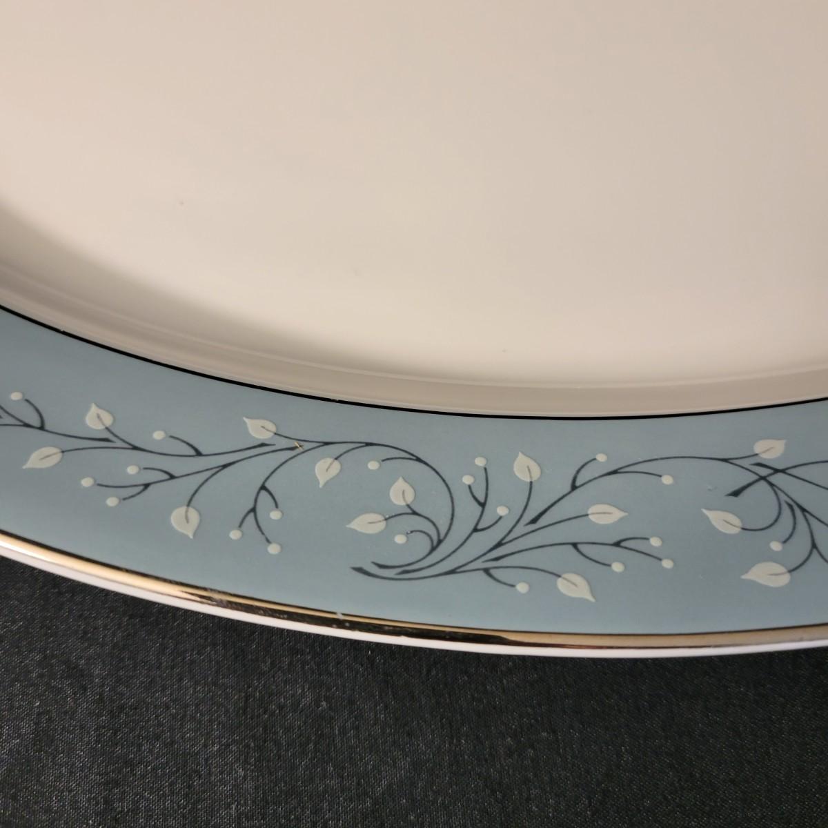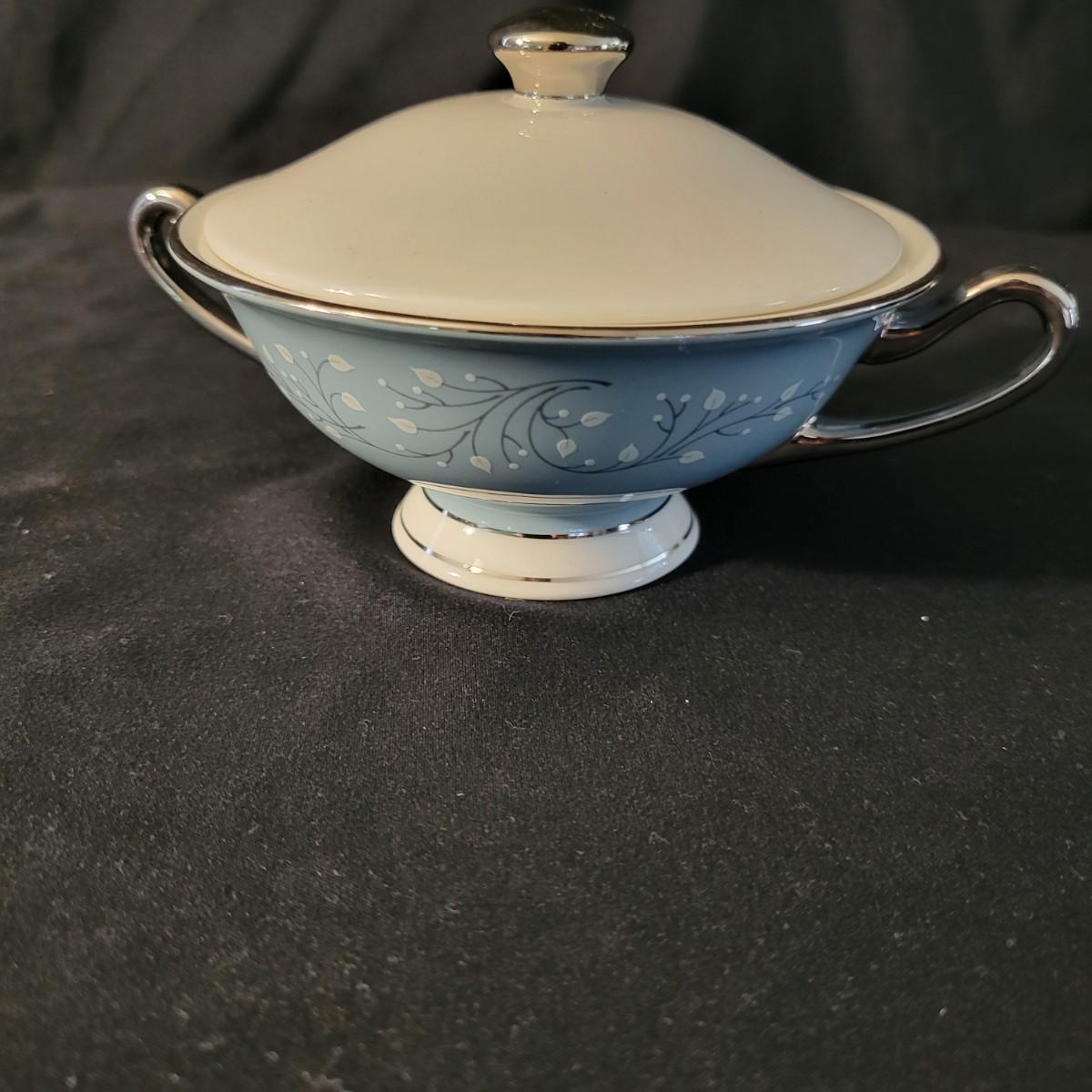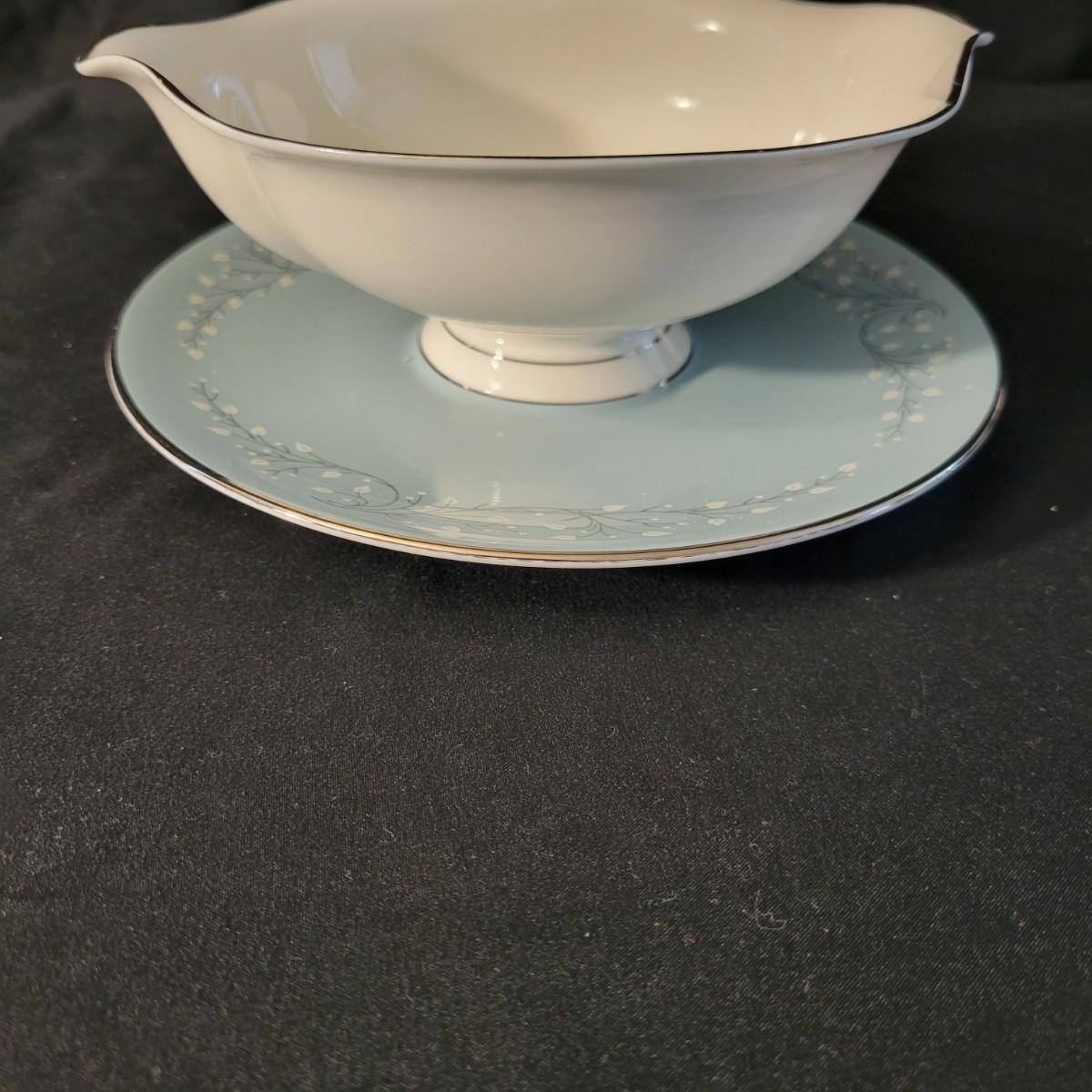 A four piece, eight place setting china set made by Syracuse China "Minuet" pattern in excellent condition that includes additional pieces. Included is a cream bowl, a sugar bowl, a gravy boat, two large bowls and a serving plate. Serving plate measures approximately 14" x 10.5 " Local pickup only