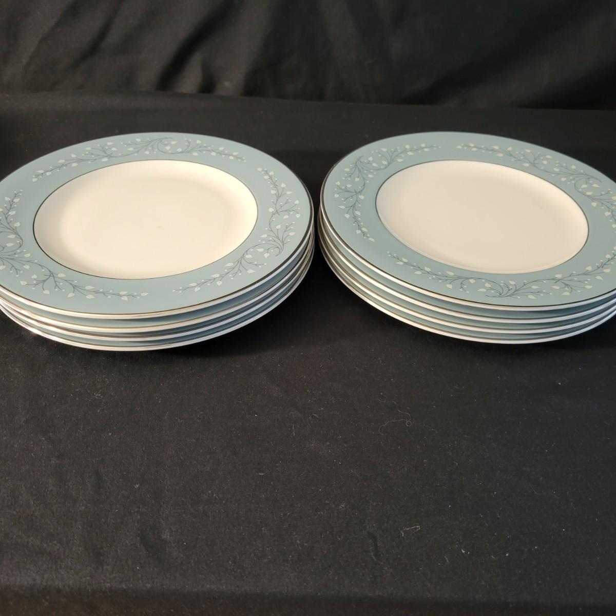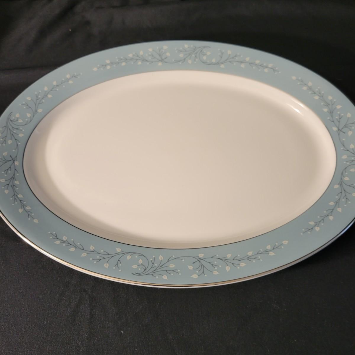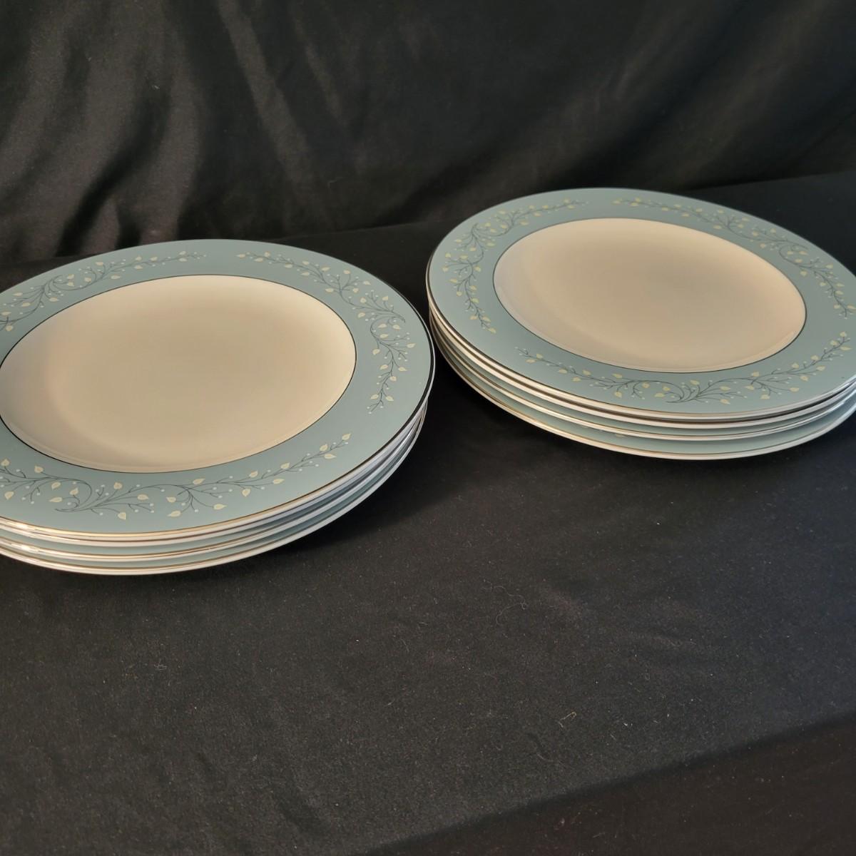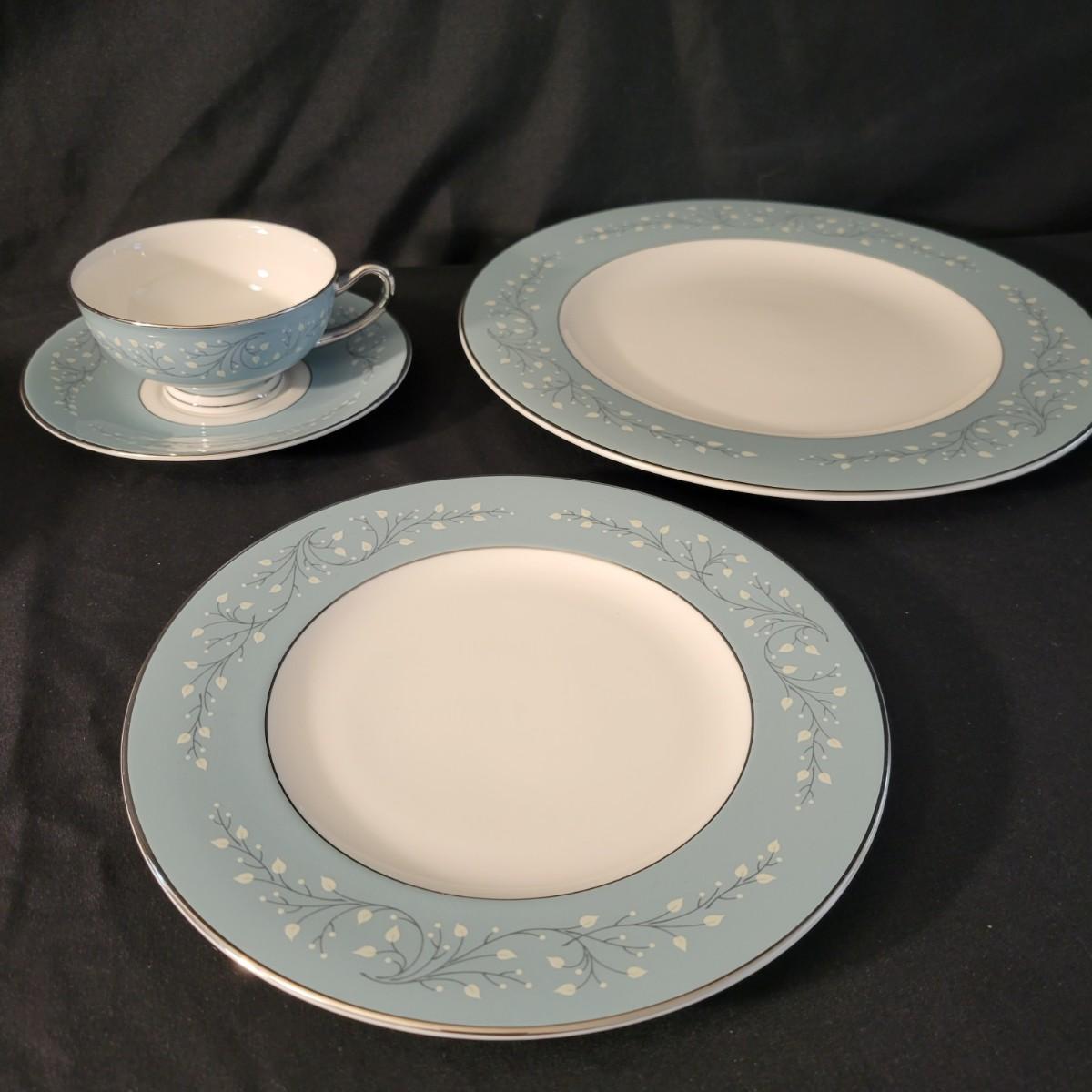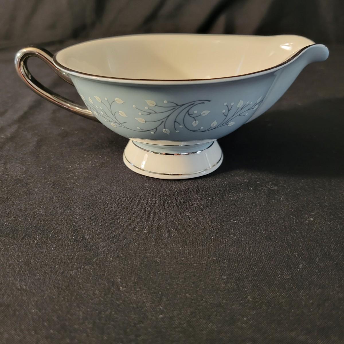 A four piece, eight place setting china set made by Syracuse China "Minuet" pattern in excellent condition that includes additional pieces. Included is a cream bowl, a sugar bowl, a gravy boat, two large bowls and a serving plate. Serving plate measures approximately 14" x 10.5 " Local pickup only