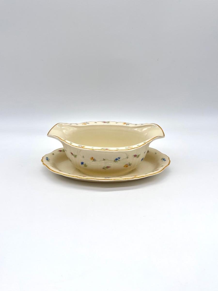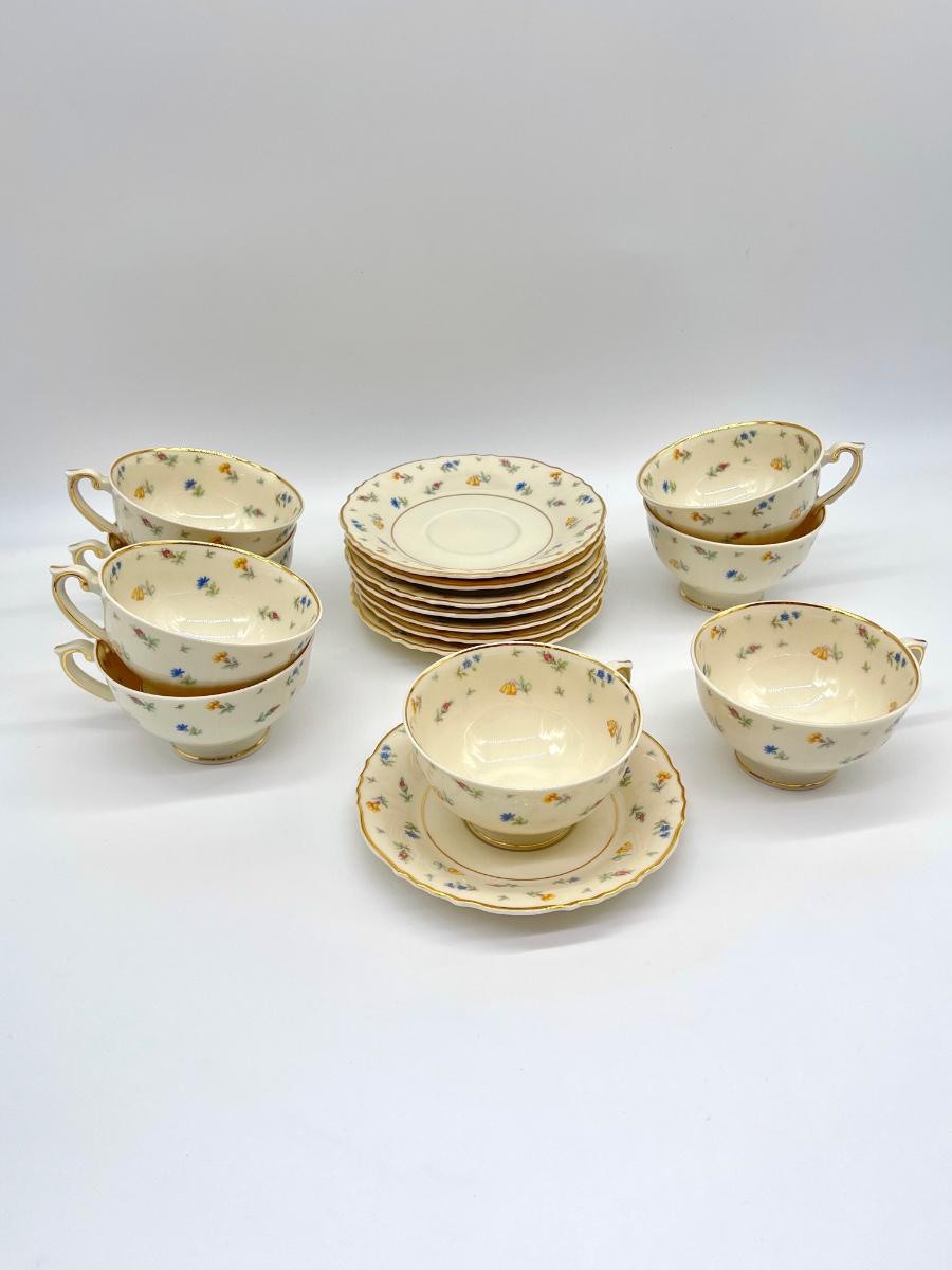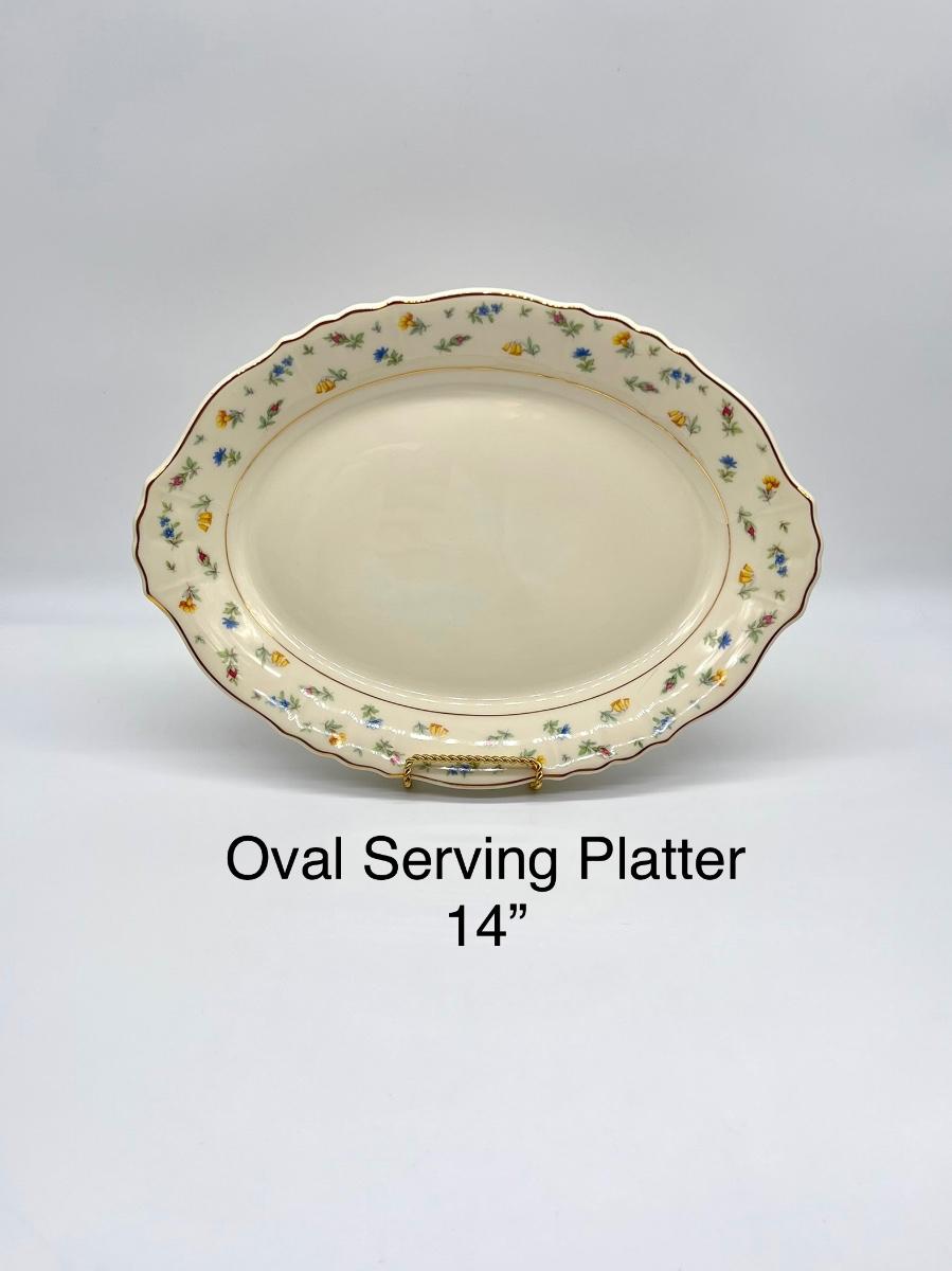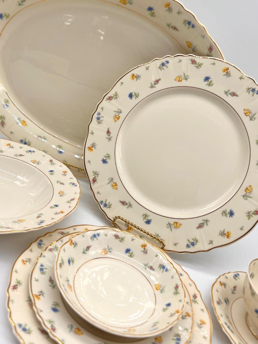 64 piece set includes: 8 dinner plates ~ 8 salad plates ~ 8 bread/butter plates ~ 8 salad/soup bowls ~ 8 dessert bowls ~ 8 cups ~ 8 saucers ~ 1 sugar bowl ~ 1 creamer ~ 1 gravy boat ~ 2 serving bowls ~ 3 serving platters.