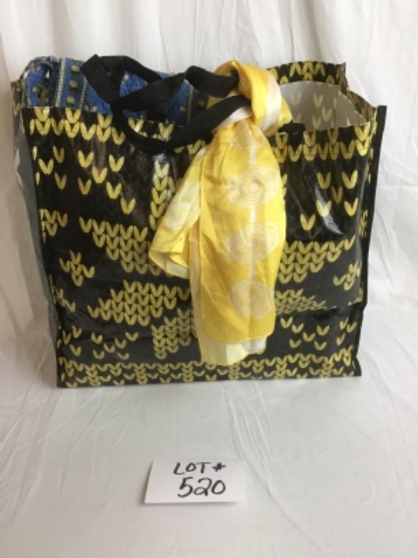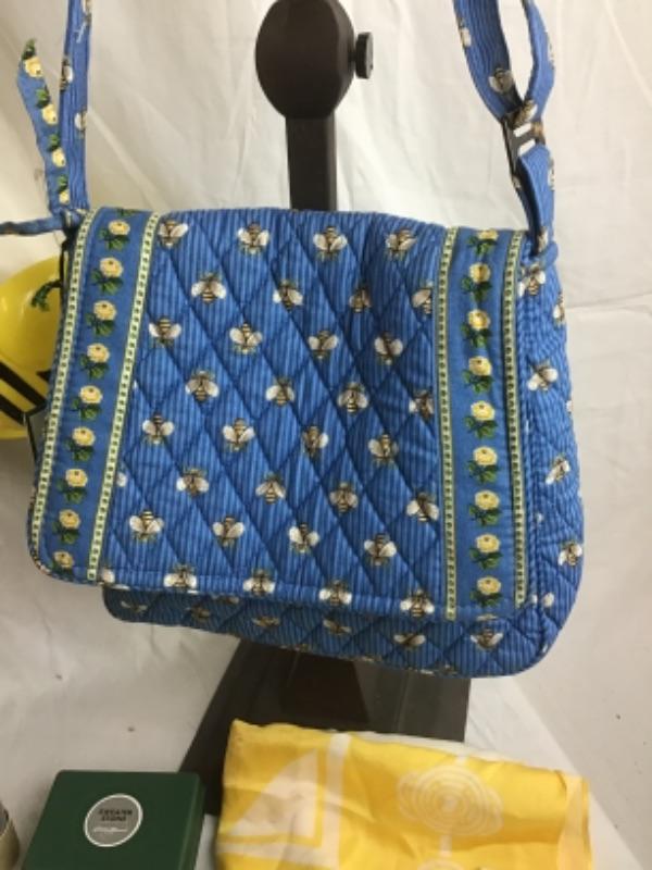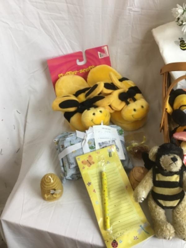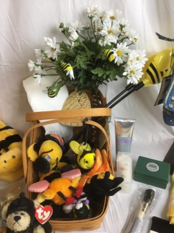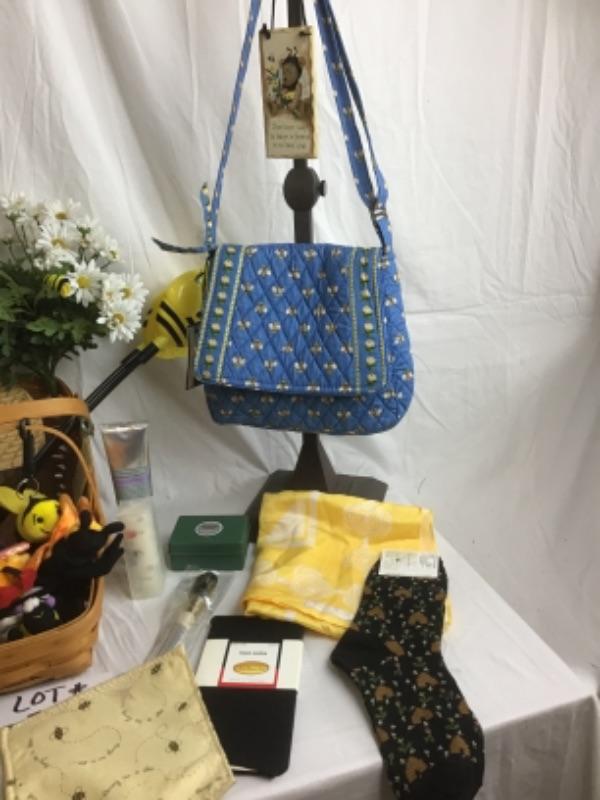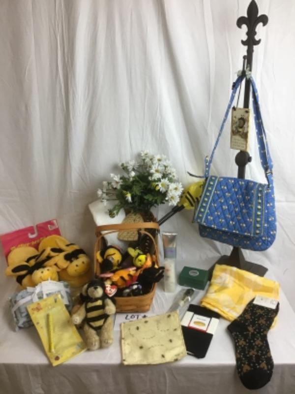 Socks, Slippers, Vera Bradley Set of 3 Accessories Bags, Vera Bradley Handbag, Ellen Allen Scarf, Longaberger Basket with 2 Handles and Plastic Liner, several smal Bee Stuffed Animals