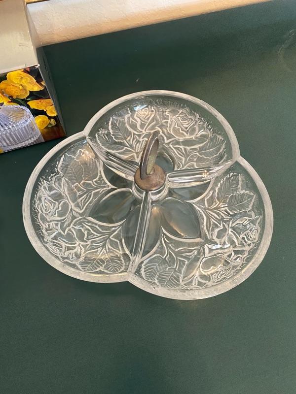 3 vintage crystal/glass serving pieces. Two are divided dishes, one is a small lidded candy dish. No chips.