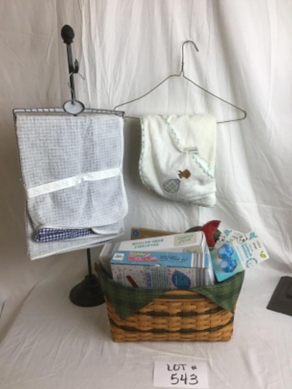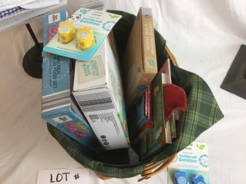 Baby Gift Basket in a Single Handle Longaberger Basket with fabric & plastic liners. Lot includes Books, Bath Towel Sets, Tooth Brush Sanitizers, Organic Muslin Wearable Blanket, Inflatable Baby Bathtub, & Wooden Play Food Set