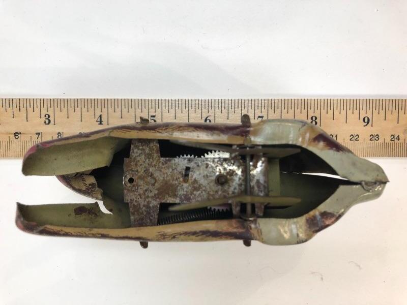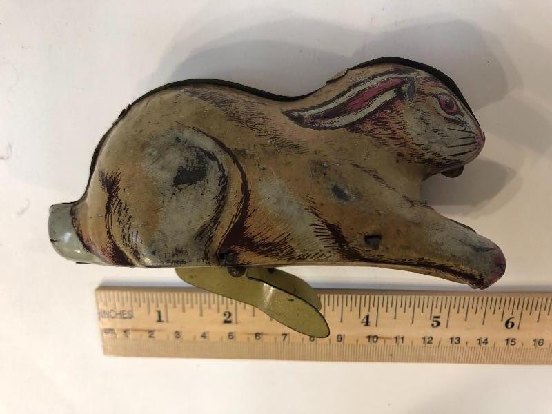 Vintage mechanical tin jumping rabbit by J. Chain & Co. Still has a partial logo mark on the back. Does have signs of age and is a little bent. Good for display.