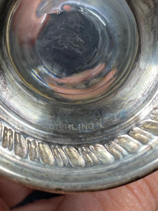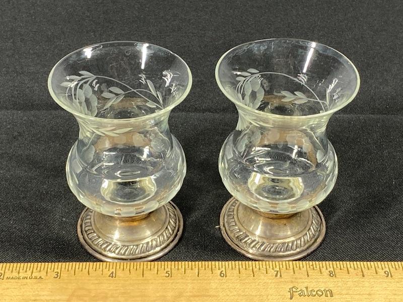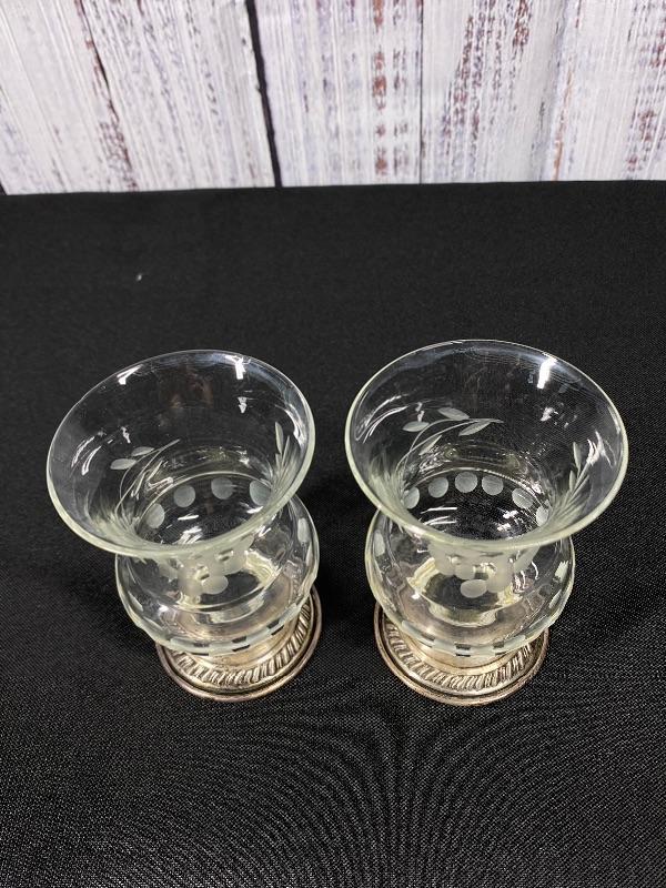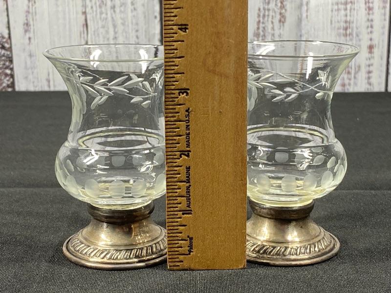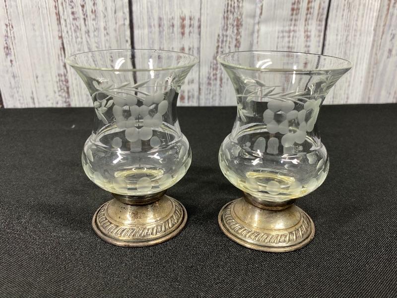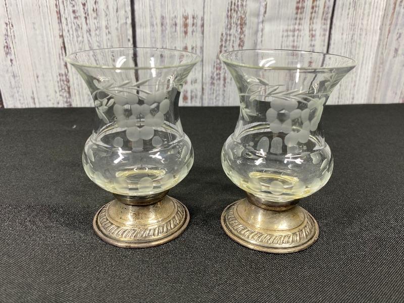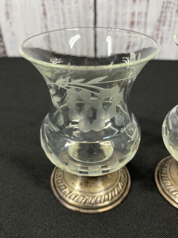 Pair of Princess House Heritage Collection candle holders. Etched crystal top with marked sterling silver base. In good condition. Stand about 3.5". #24-30007