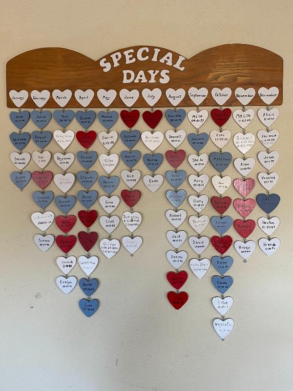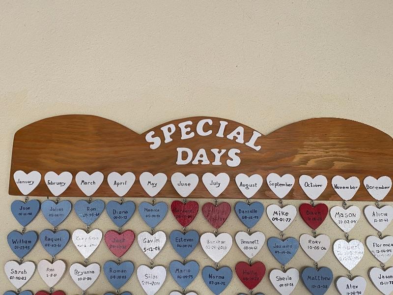 Special Days wall hanging, Used to keep track of all your special days each month like birthdays and anniversaries. Currently have writing on hanging hearts, but can easily repaint to make your own. Wall plaque is about 33" long and 8" wide. #030-2006