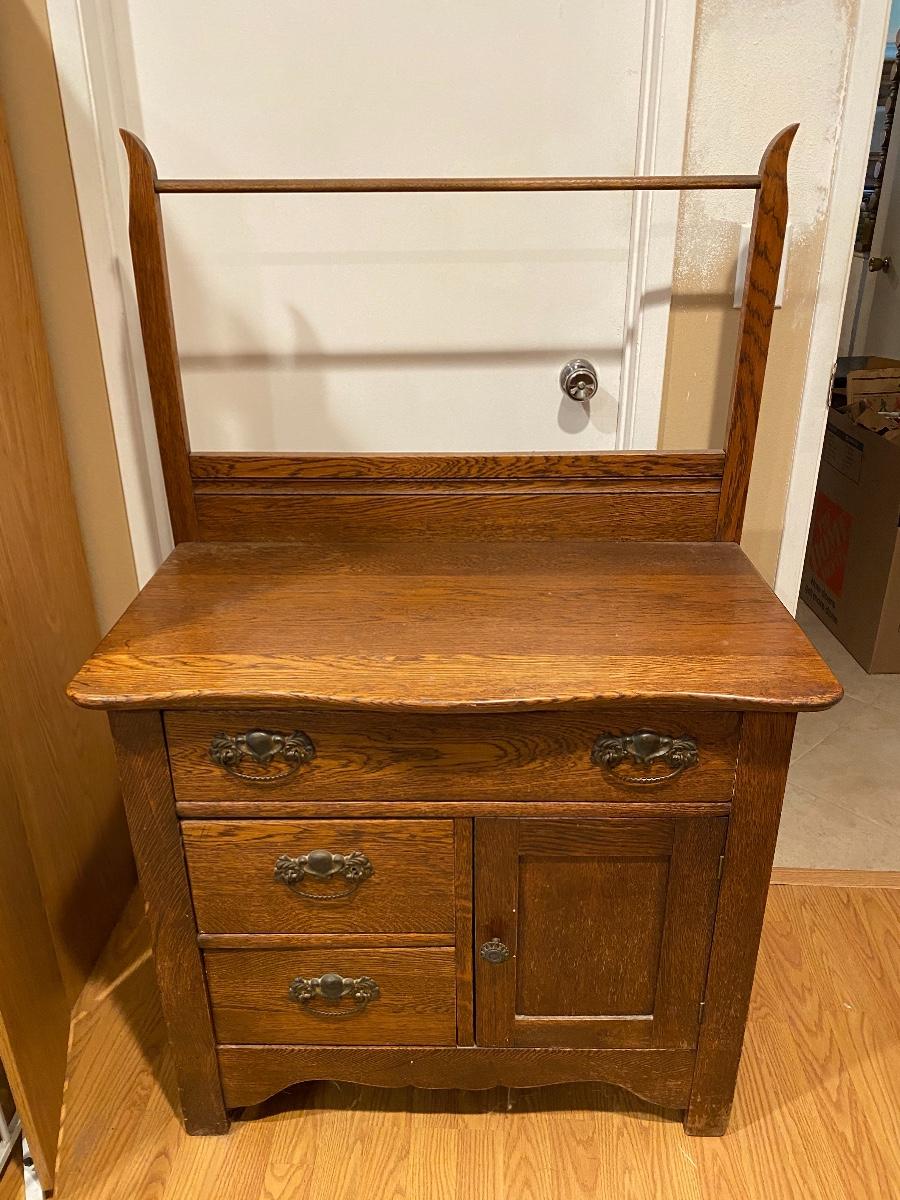 Vintage quarter sawn youth size wash basin table. Three drawers and a cabinet. Small child size at about 3' tall. Has rung across the back for hanging towel. Good vintage condition. #030-1042
