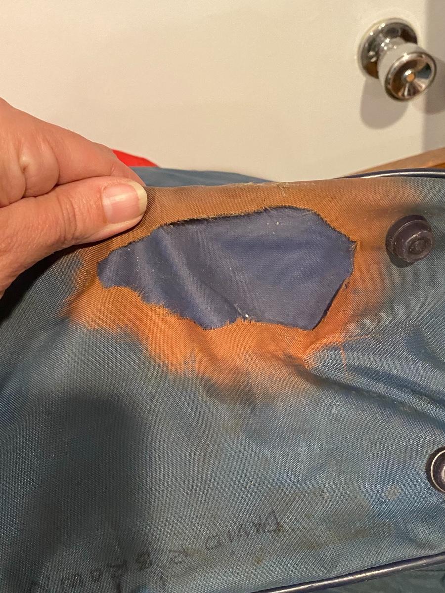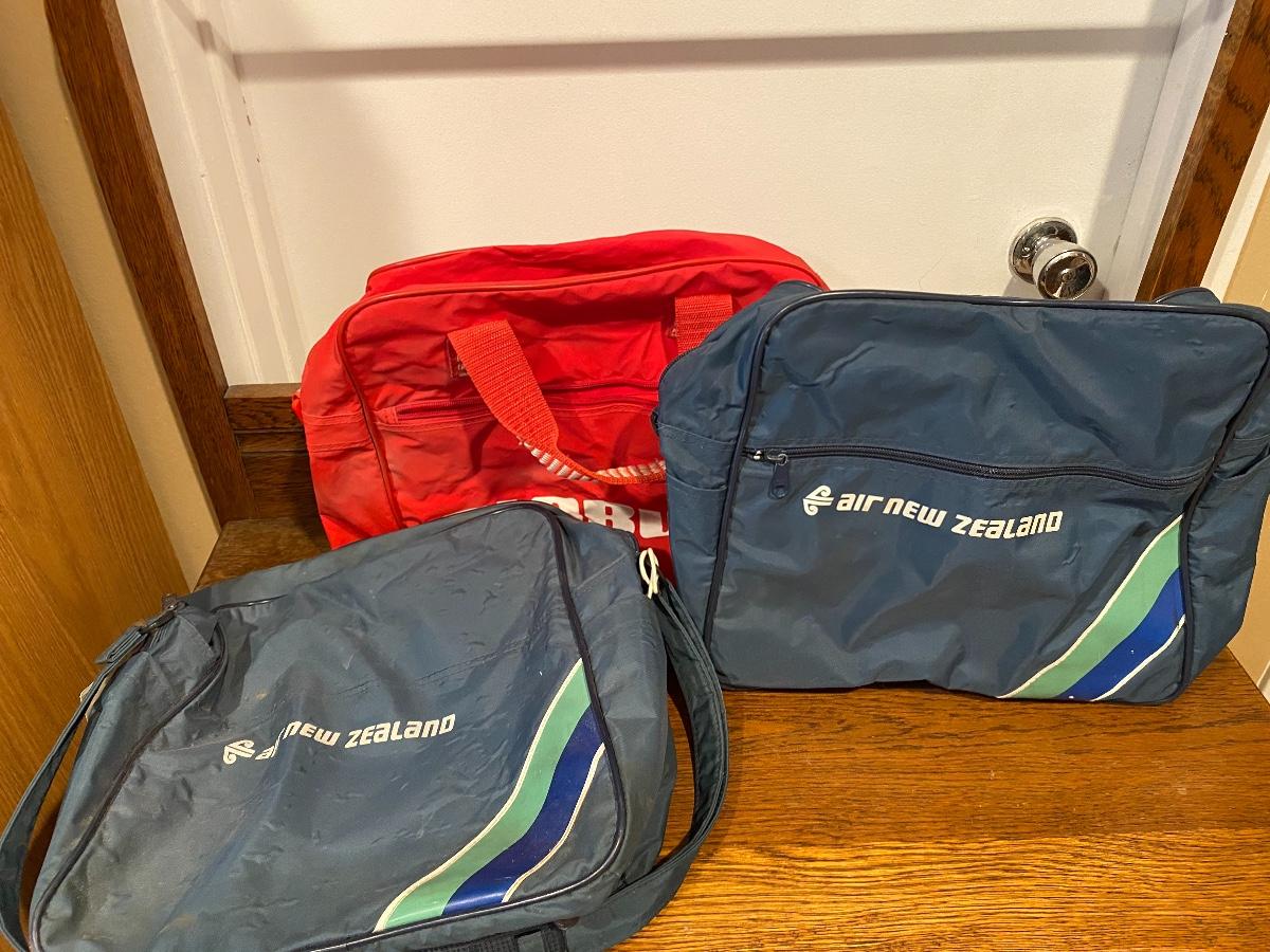 Set of three retro zipper travel bags. Two are from Air New Zealand, the other is from Globus Tours. One of the Air New Zealand bags is a little more worn and has small damage. All are in useable condition. Small about 12" to 15" size.