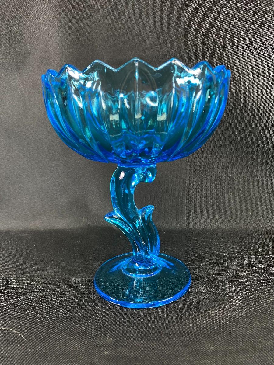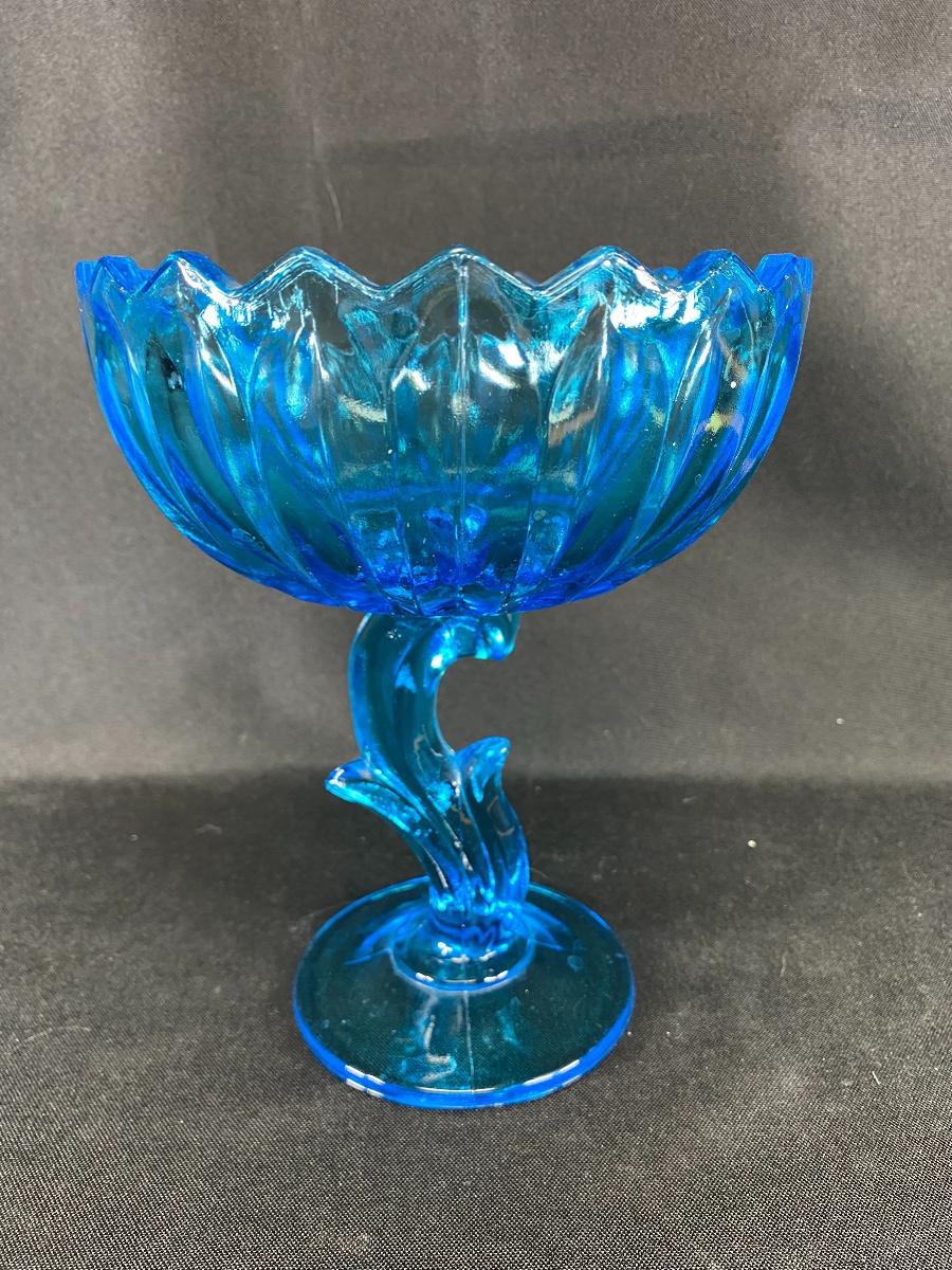 Vintage Indiana Glass lotus blossom flower candy dish compote. Bright blue glass. Good condition.
