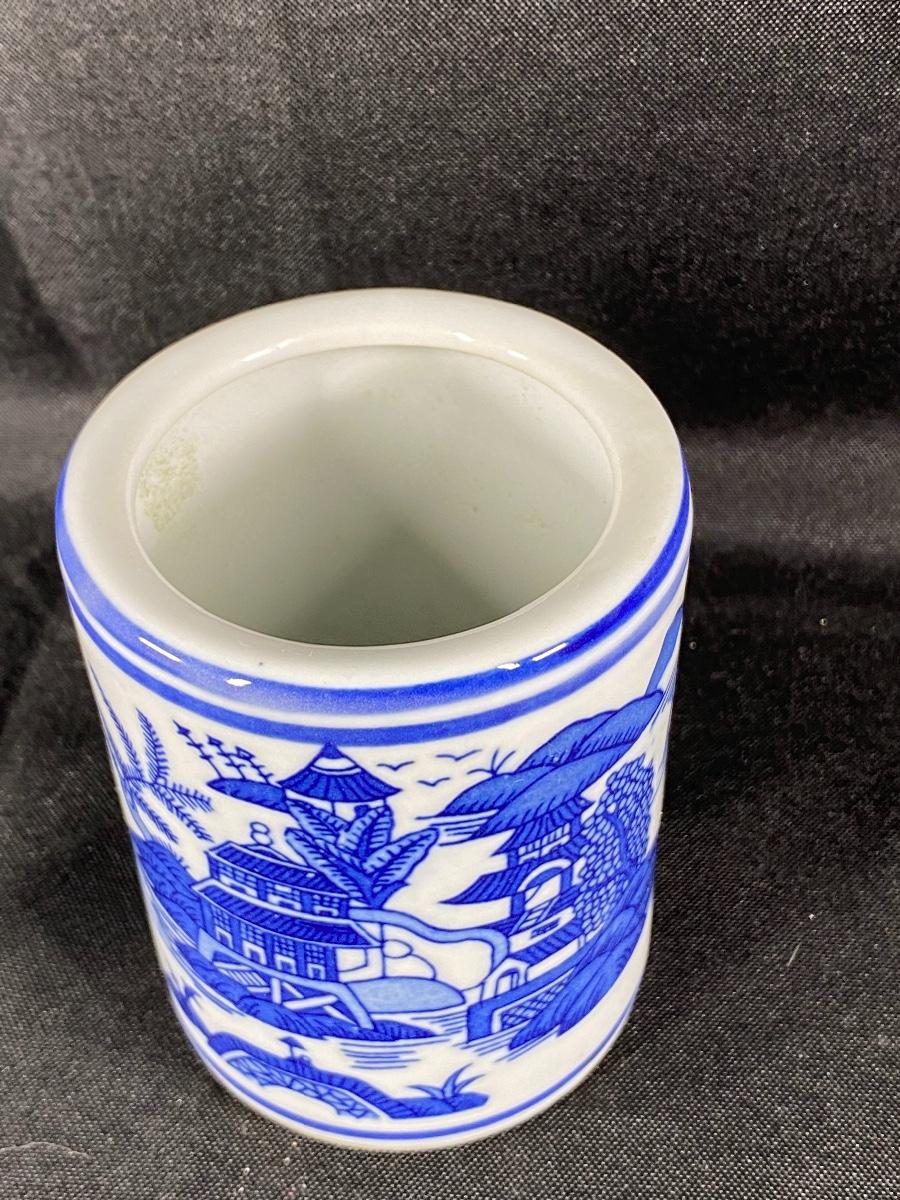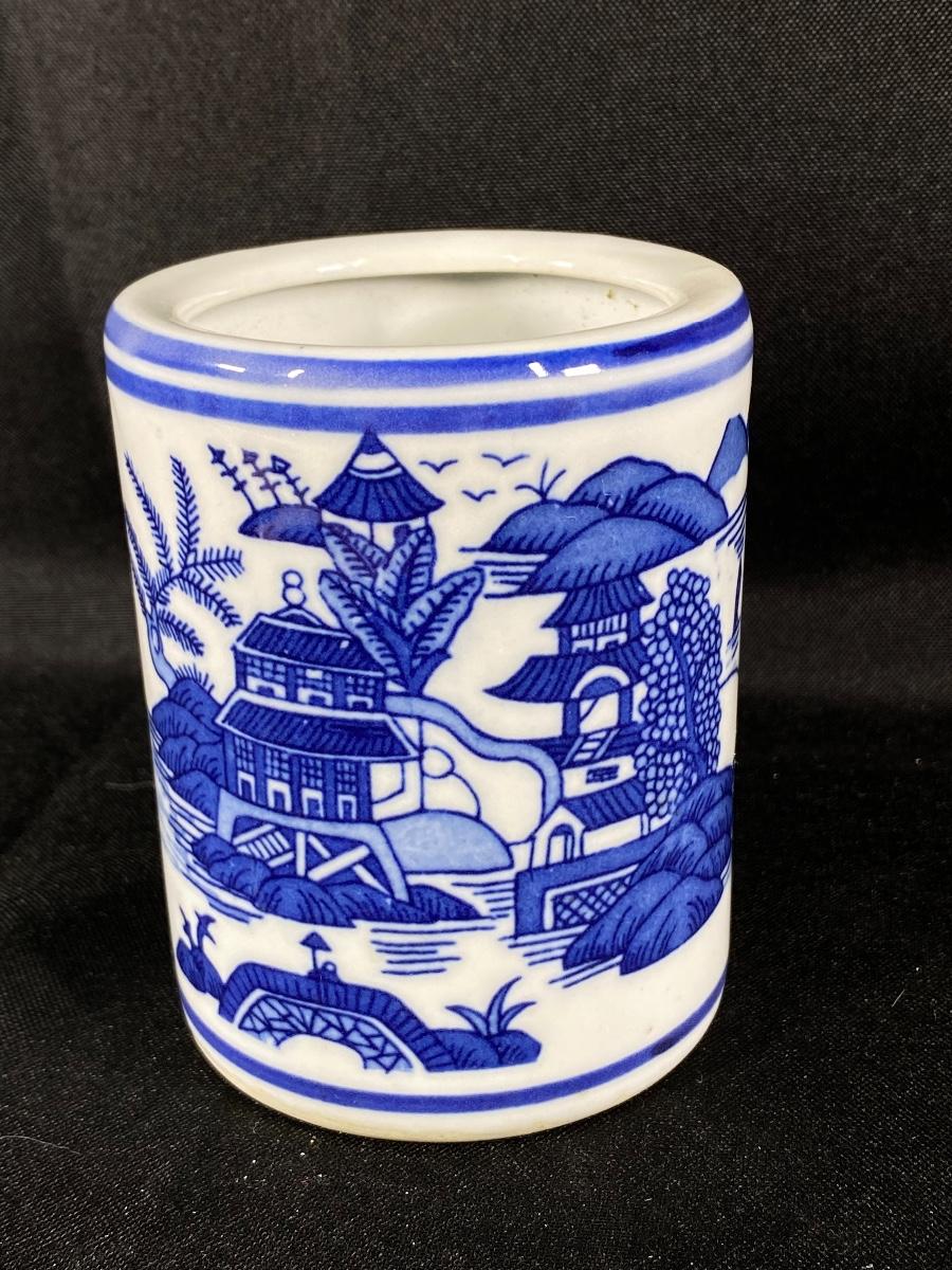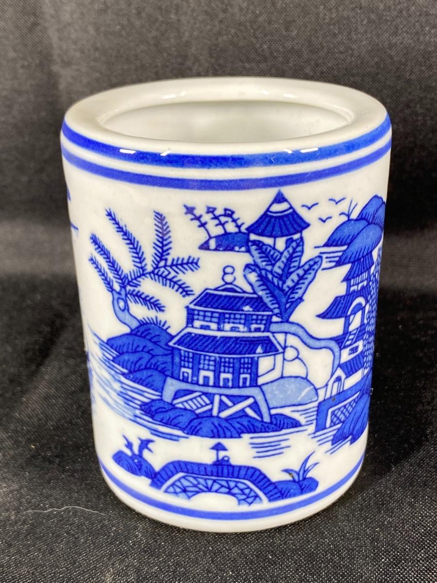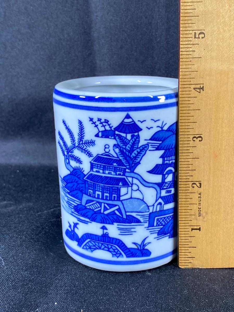 Faux Blue Willow pattern ceramic cup. Looks like it had artifical flowers in it at one time, foam residue in the bottom. Good condition. 4" size.