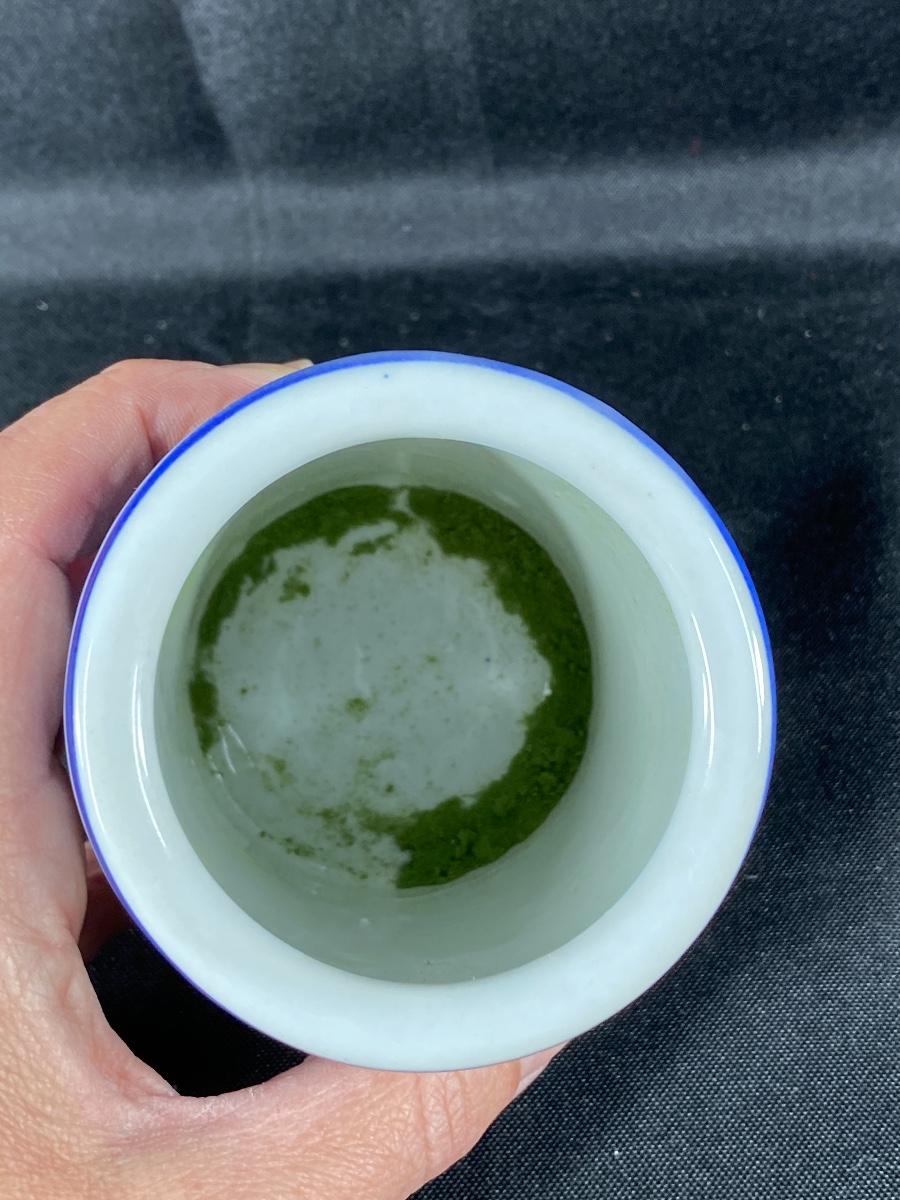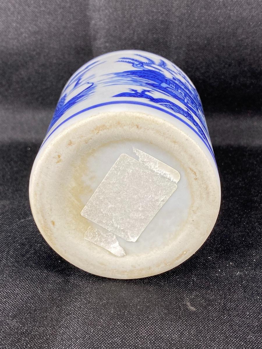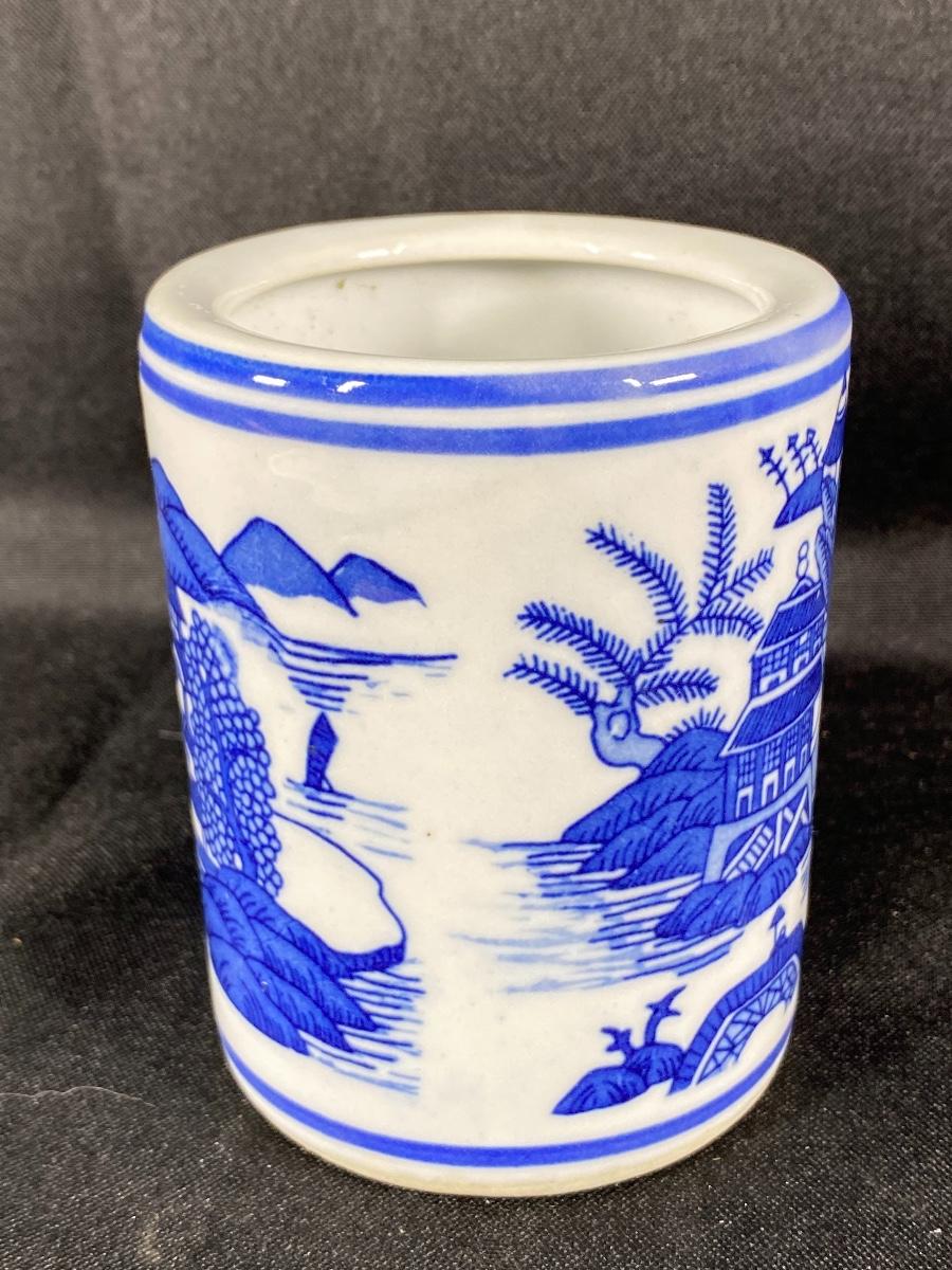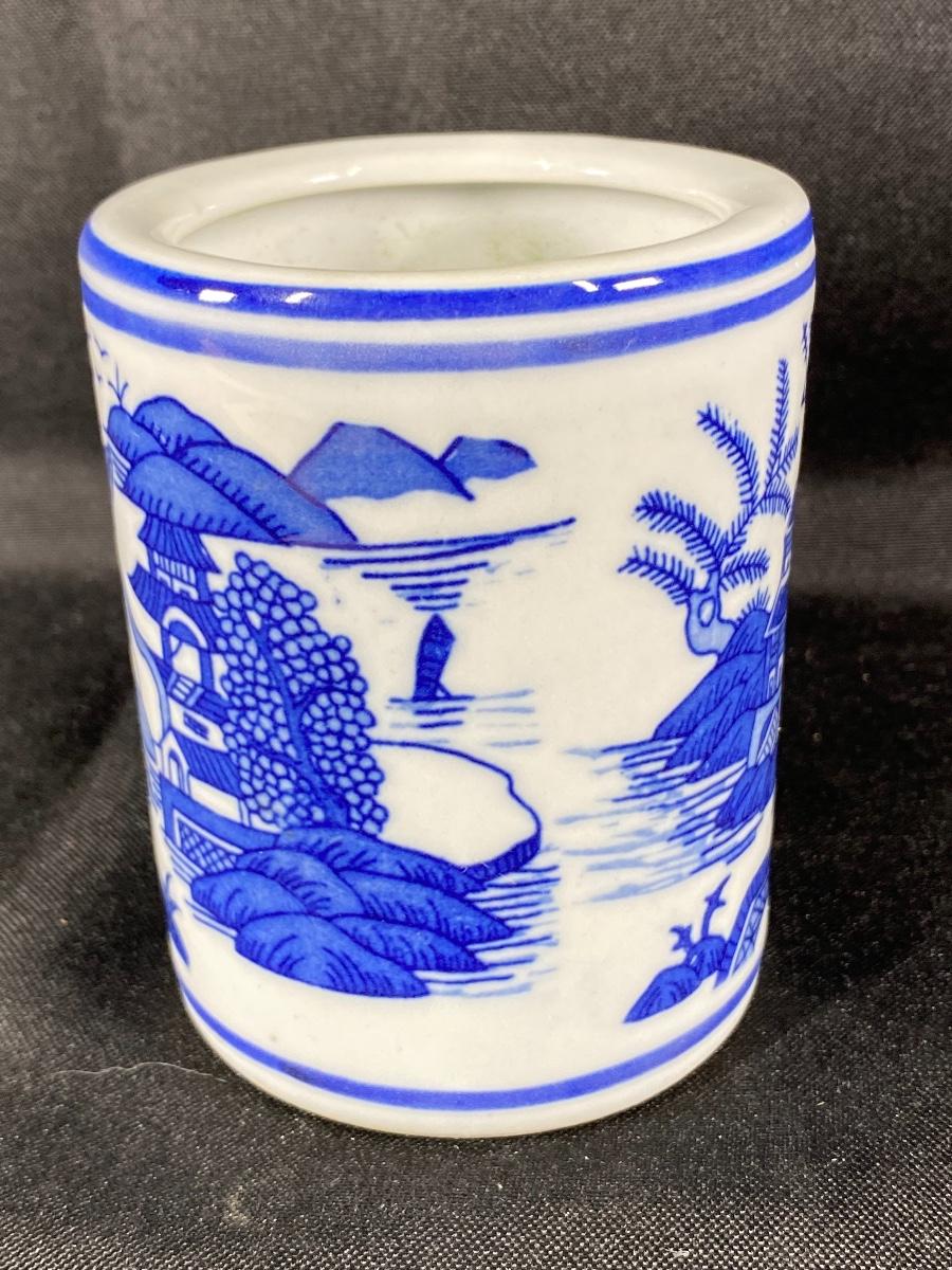 Faux Blue Willow pattern ceramic cup. Looks like it had artifical flowers in it at one time, foam residue in the bottom. Good condition. 4" size.