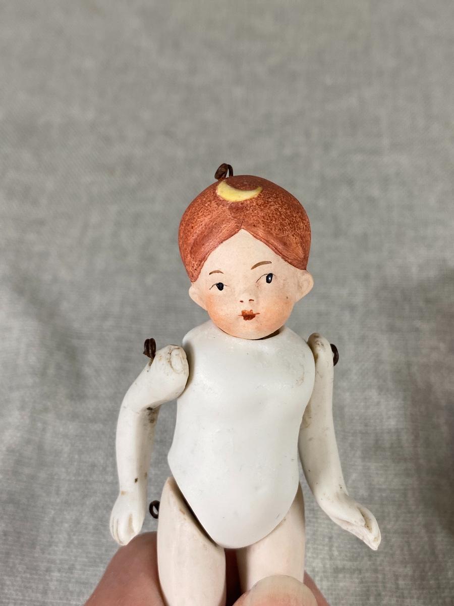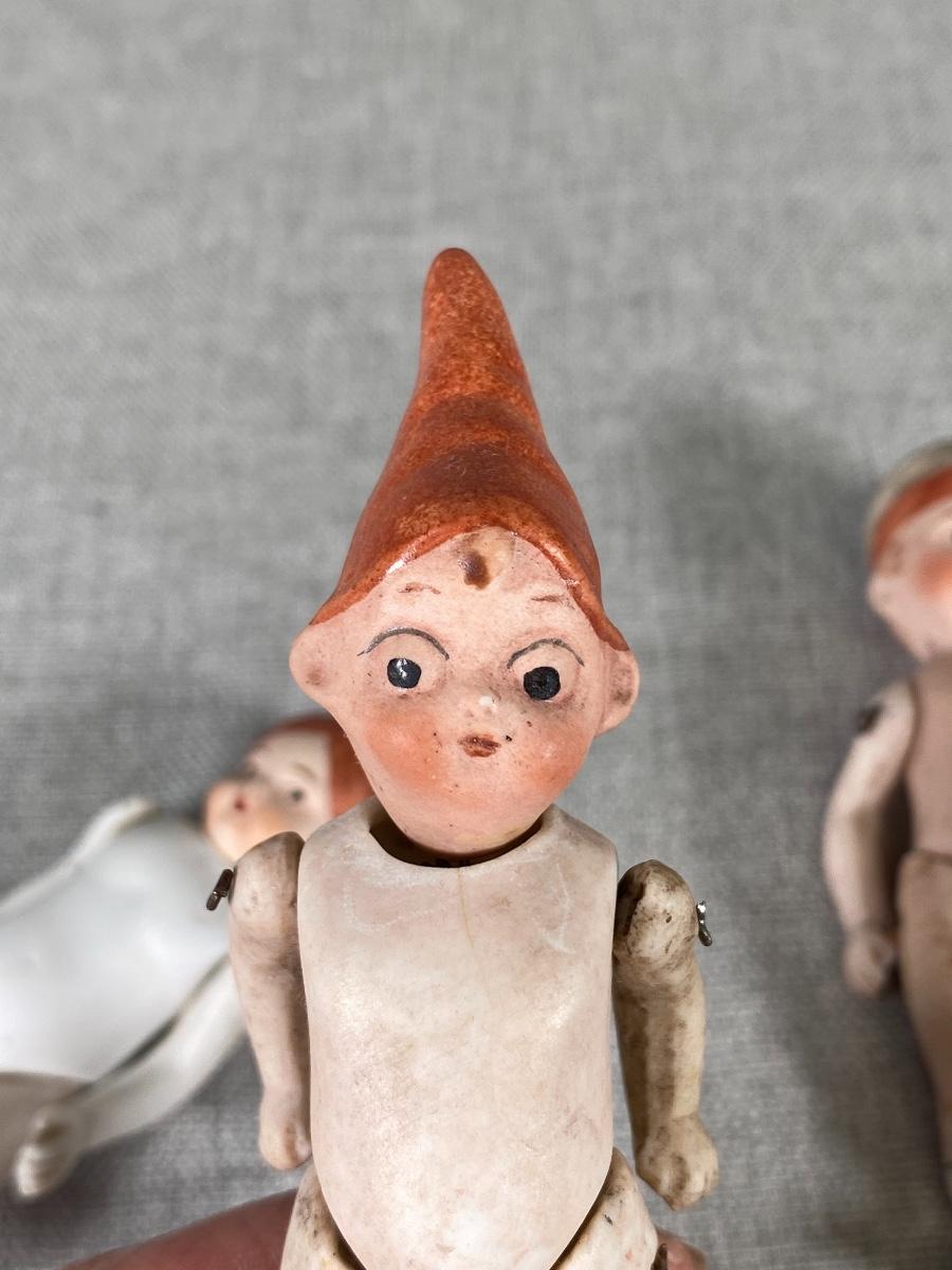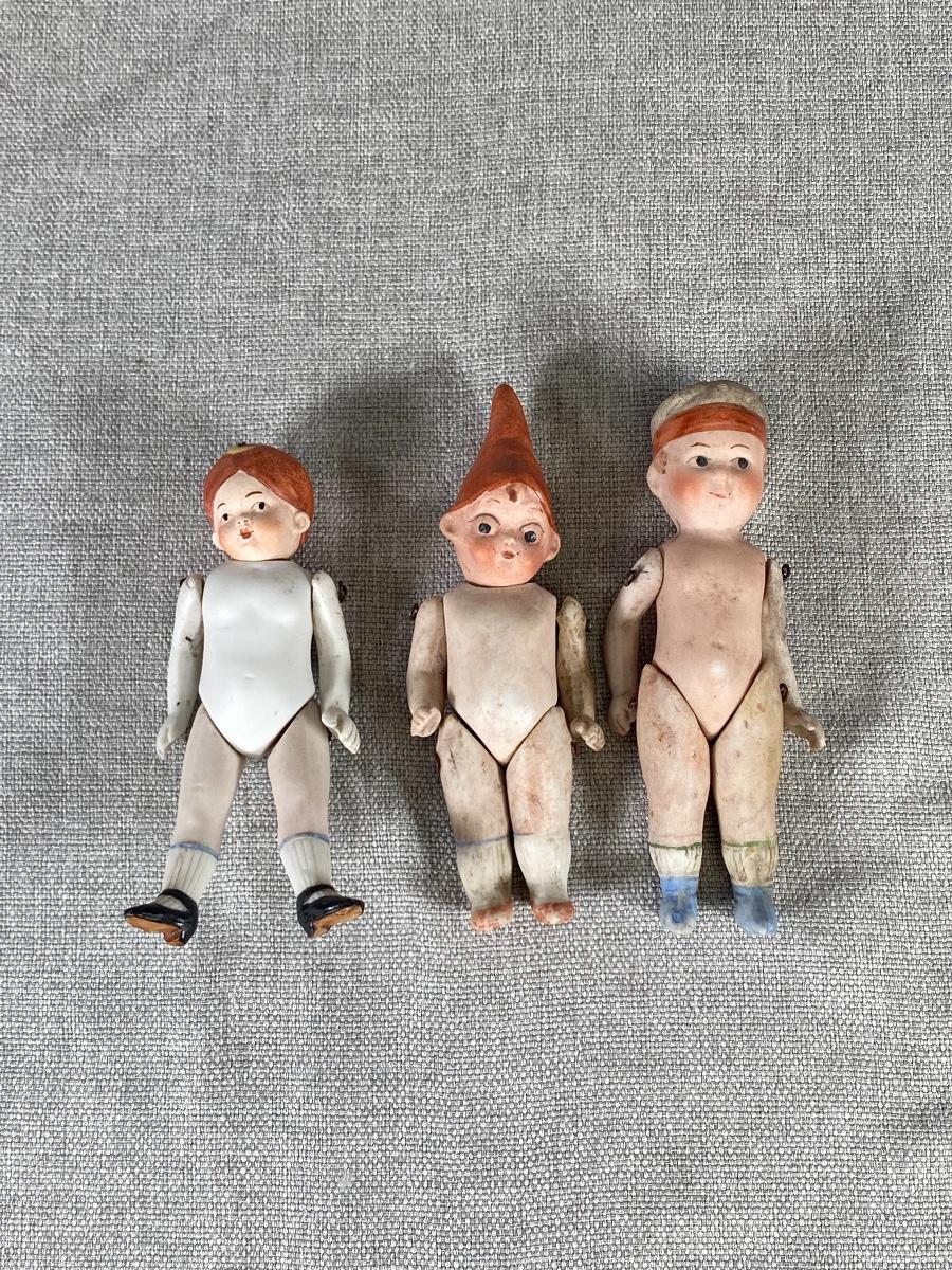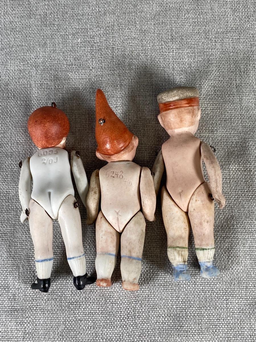 Set of 3 bisque dollhouse dolls. All three have jointed limbs. Painted socks, shoes and hats. Signs of age, see photos. Two have marks on backs. Under 4" size.