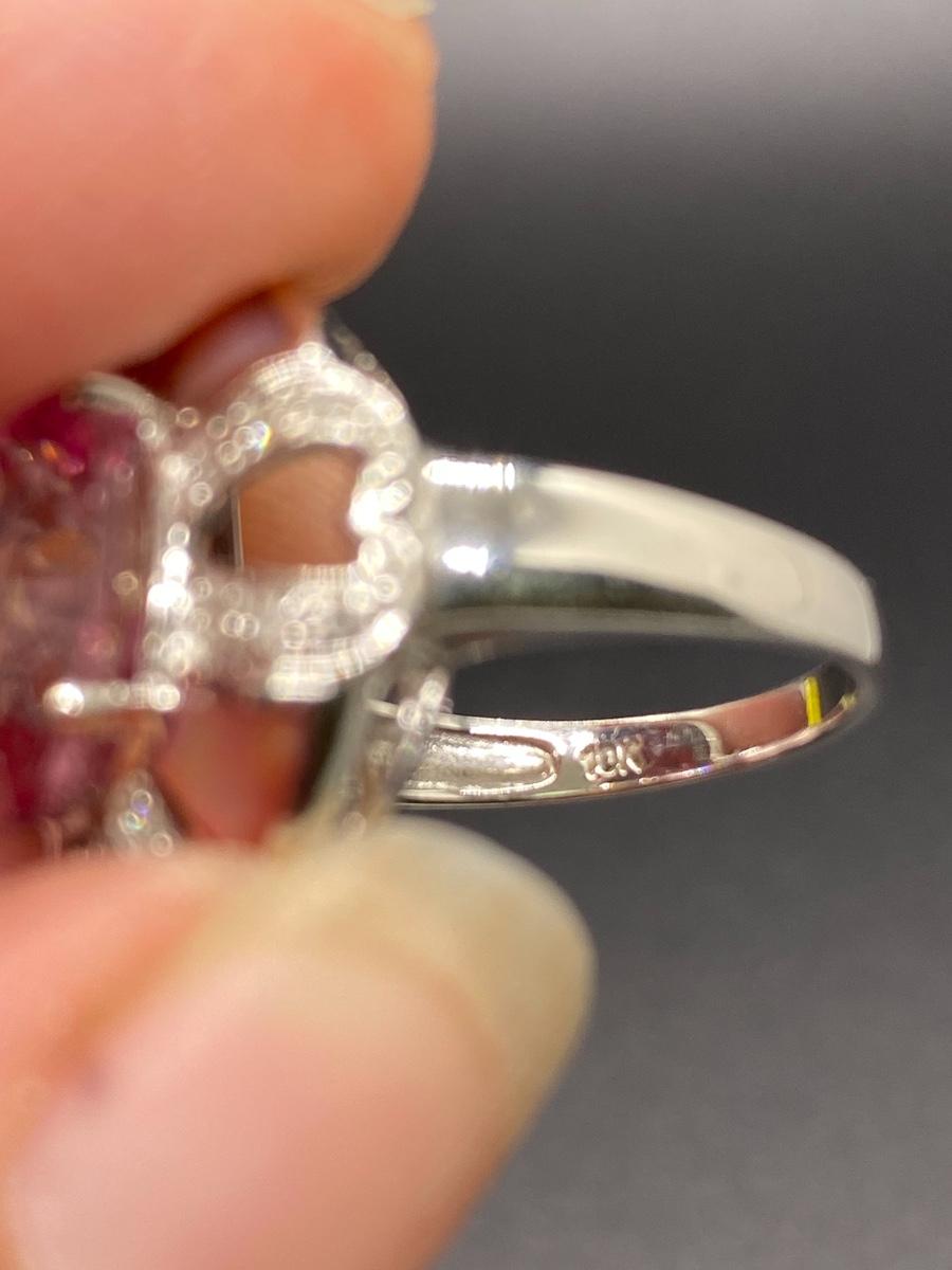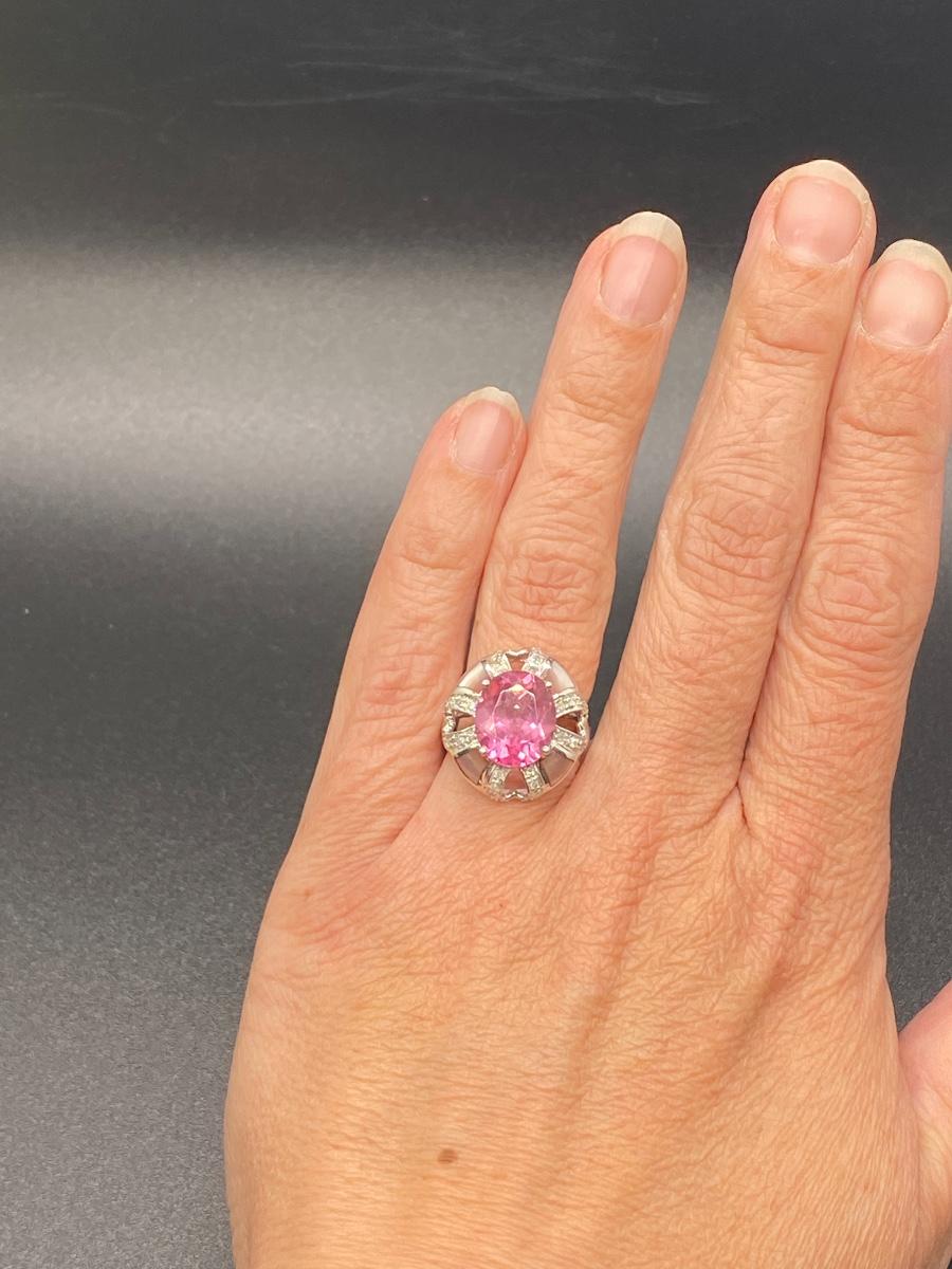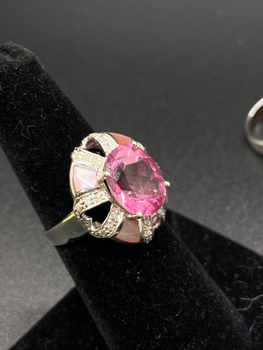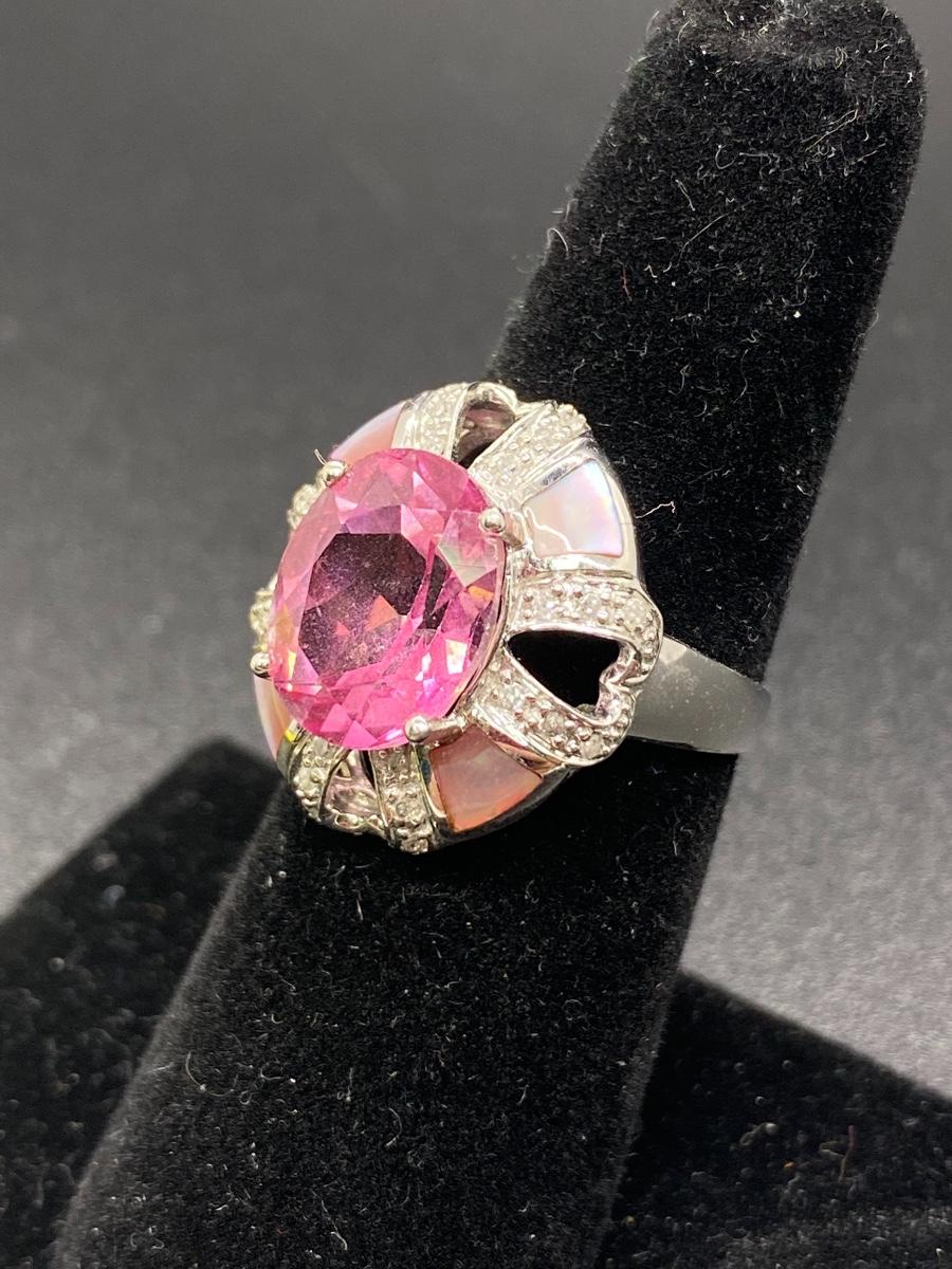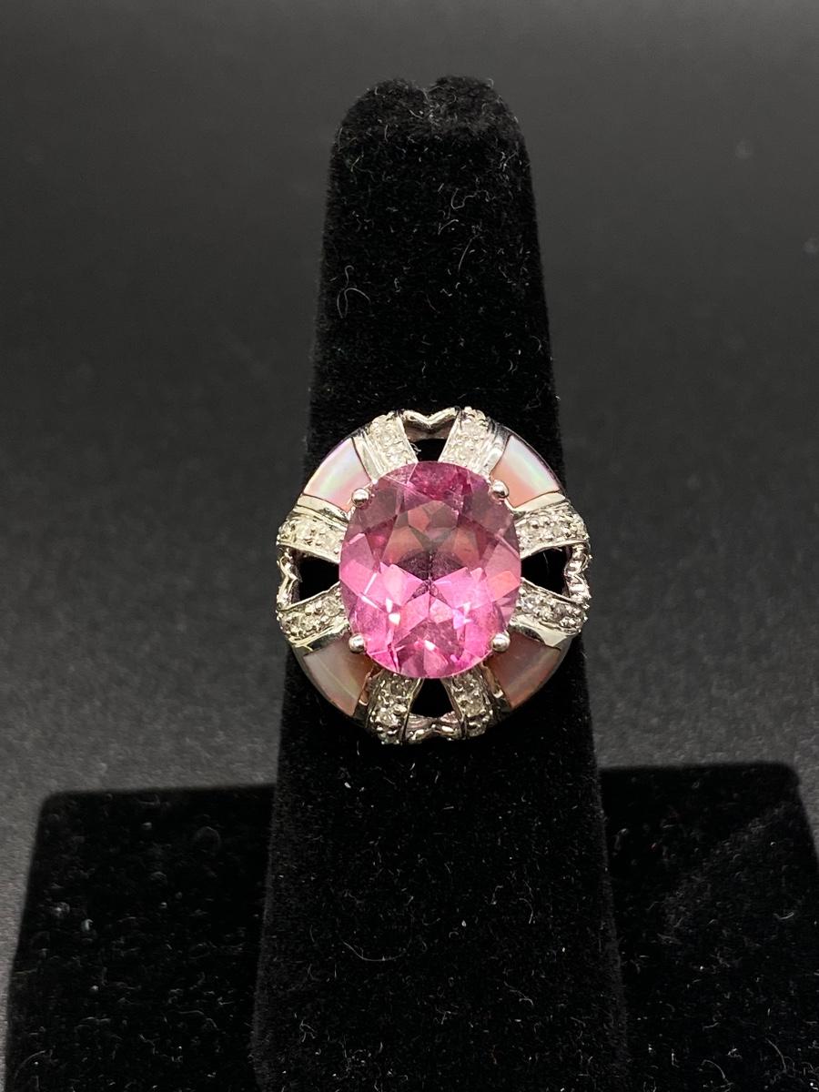 Bright pink gemstone cocktail ring. Looks like rose zirconia or pink sapphire, set in 10k white gold. Pink tint abalone shell accent. Fits like a 7. 5.4g tw. Stamped 10k inside.