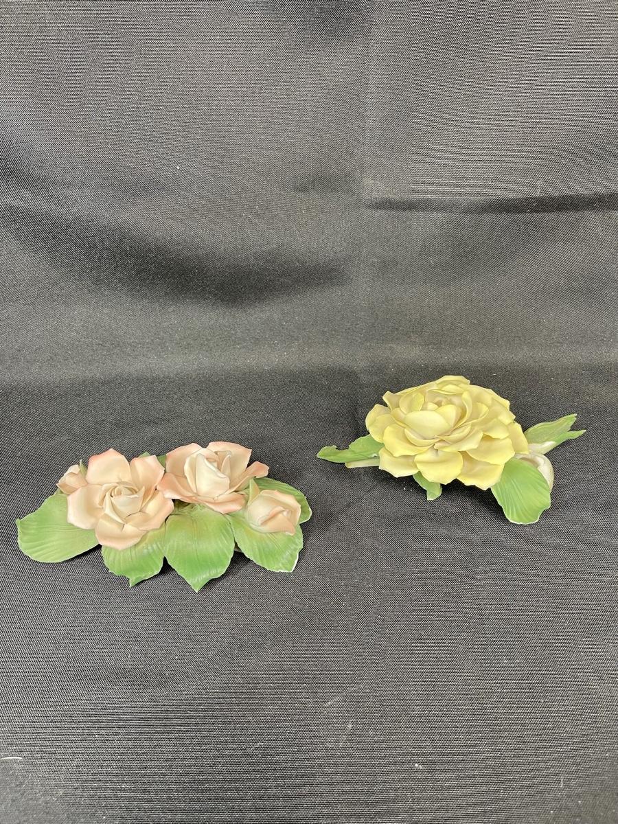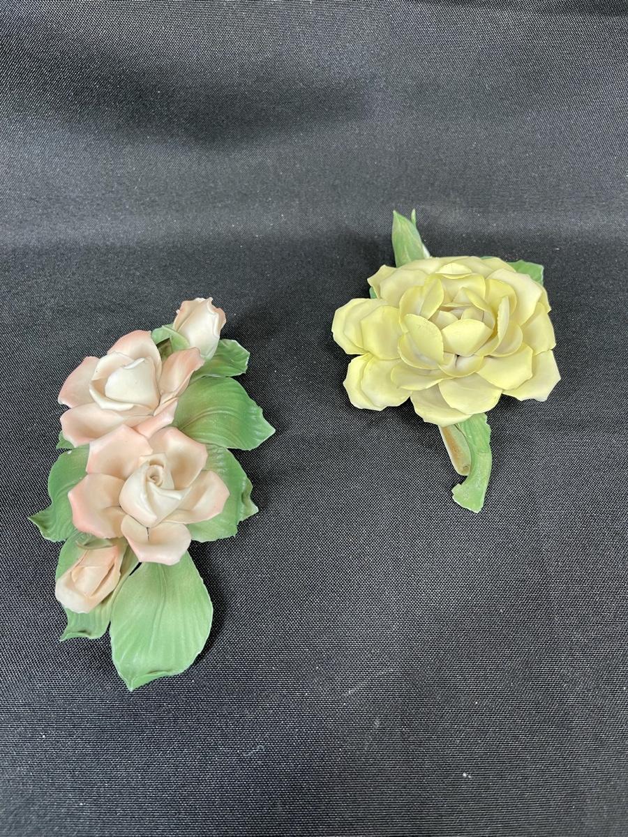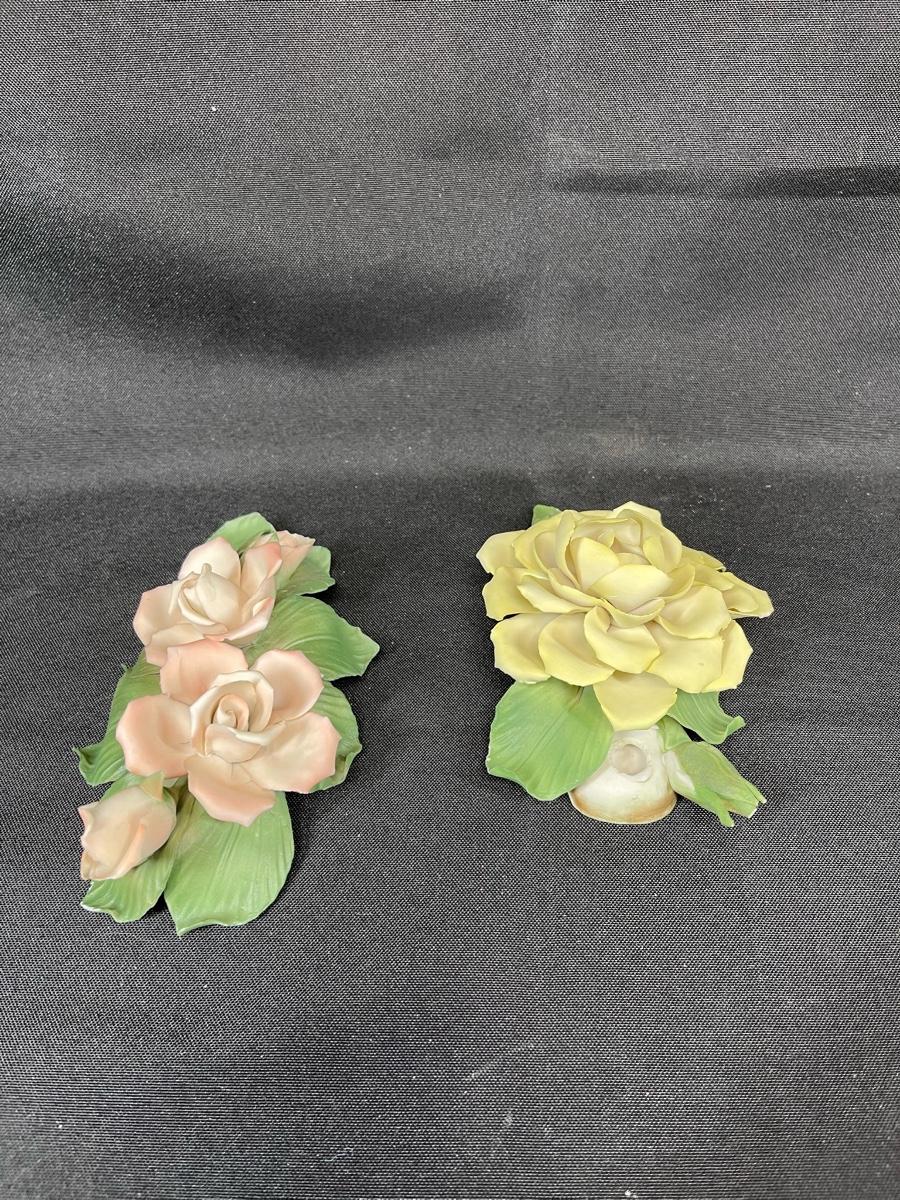 Pair of Capodimonte rose figurines. Yellow and pink roses. The yellow rose looks to be missing either a leaf or flower, but displays nicely. 6" size. Marked on the bottom.