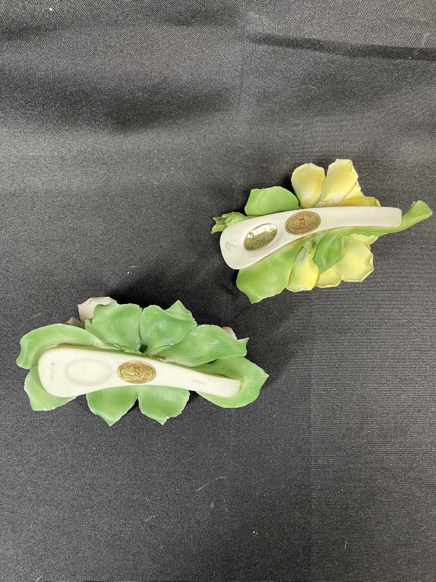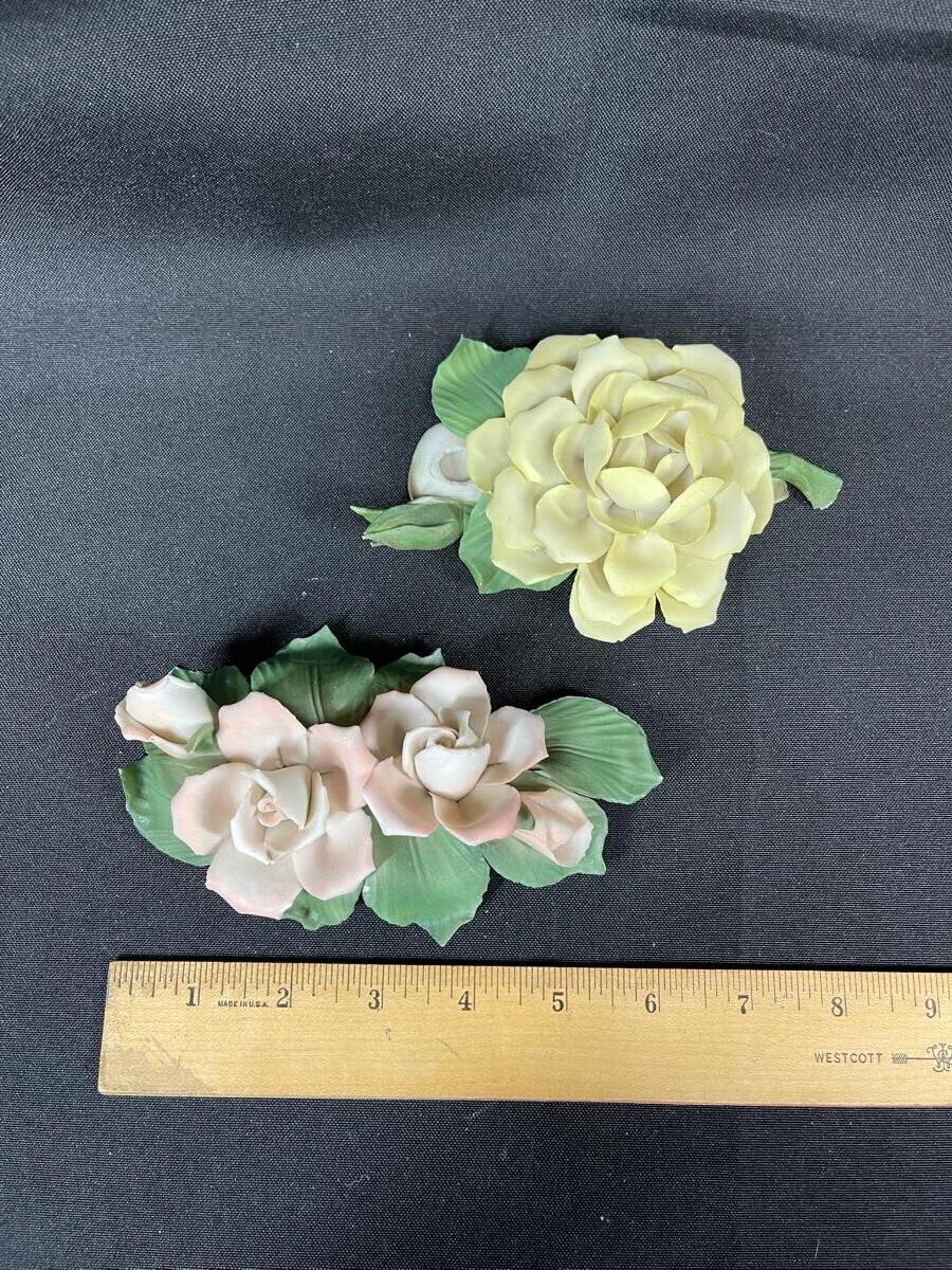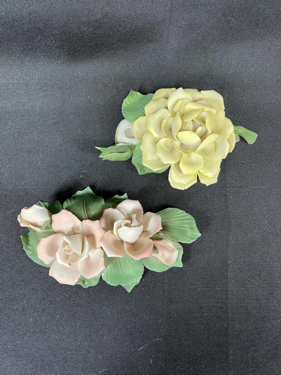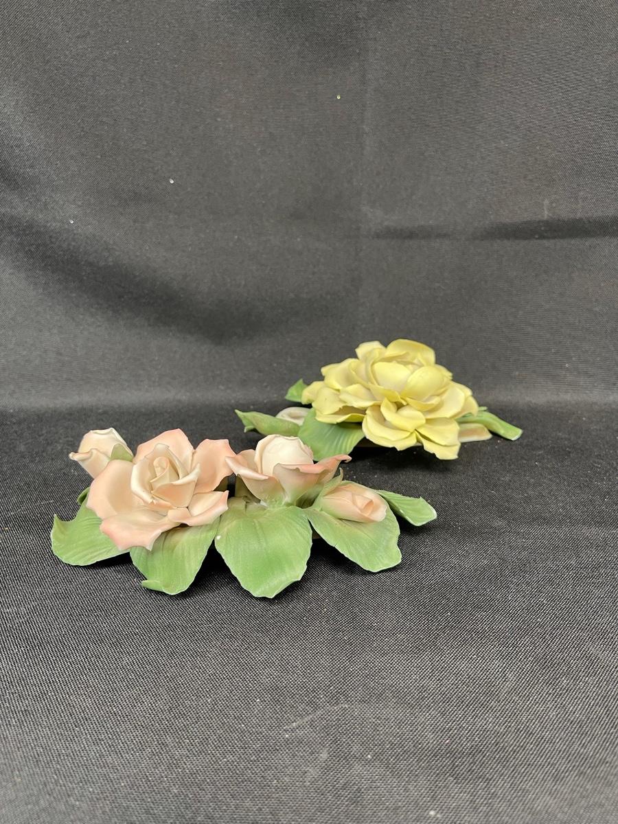 Pair of Capodimonte rose figurines. Yellow and pink roses. The yellow rose looks to be missing either a leaf or flower, but displays nicely. 6" size. Marked on the bottom.