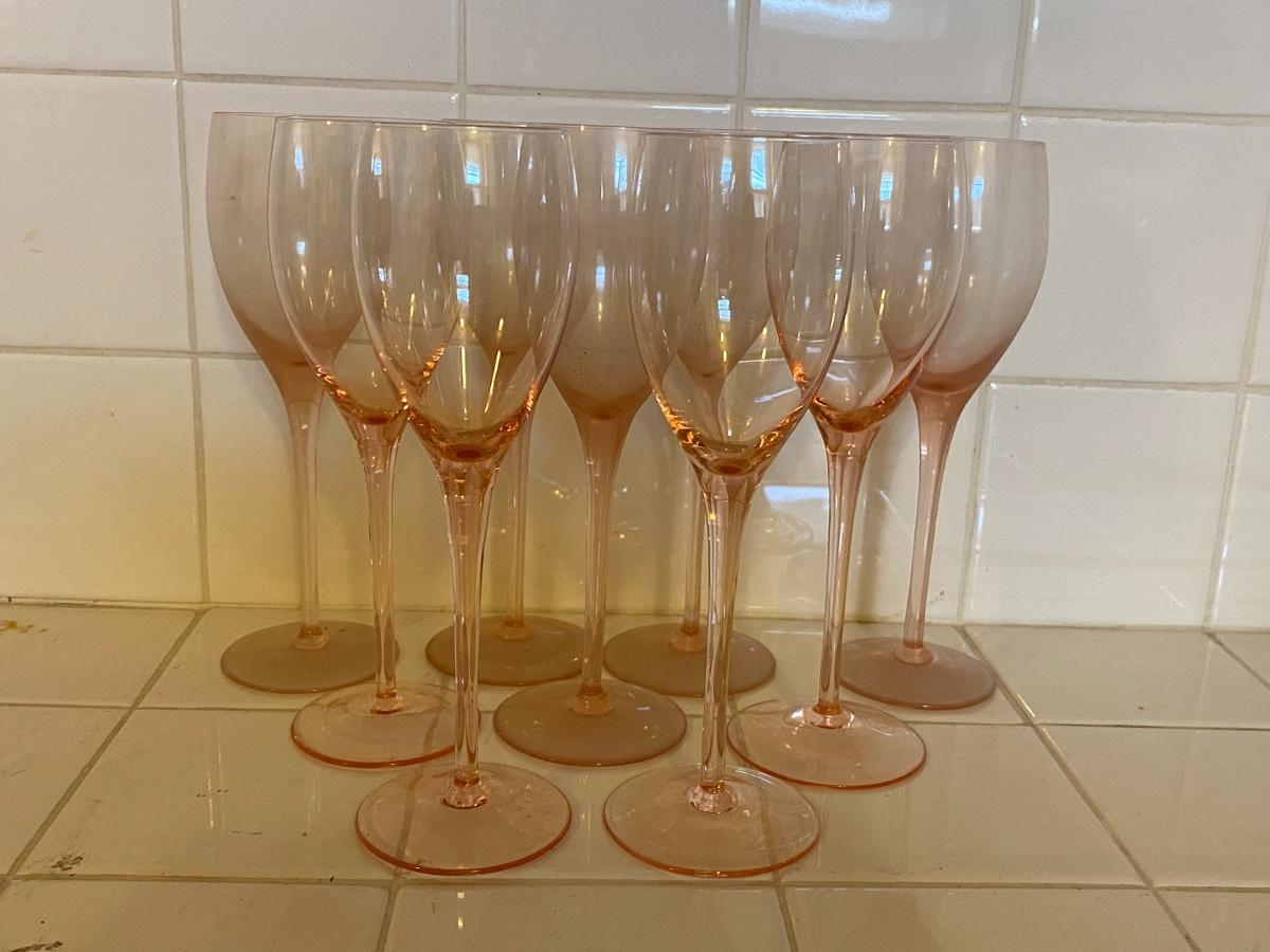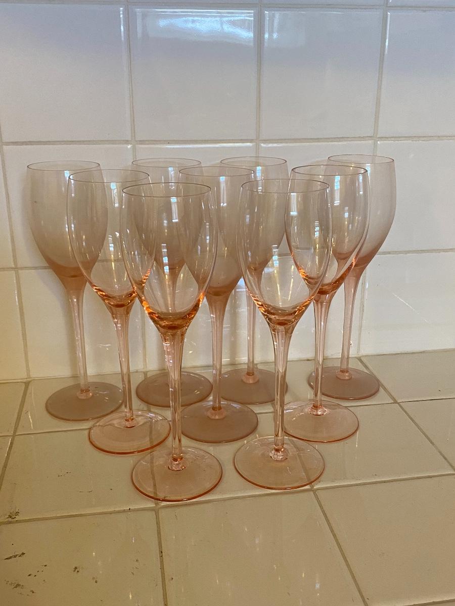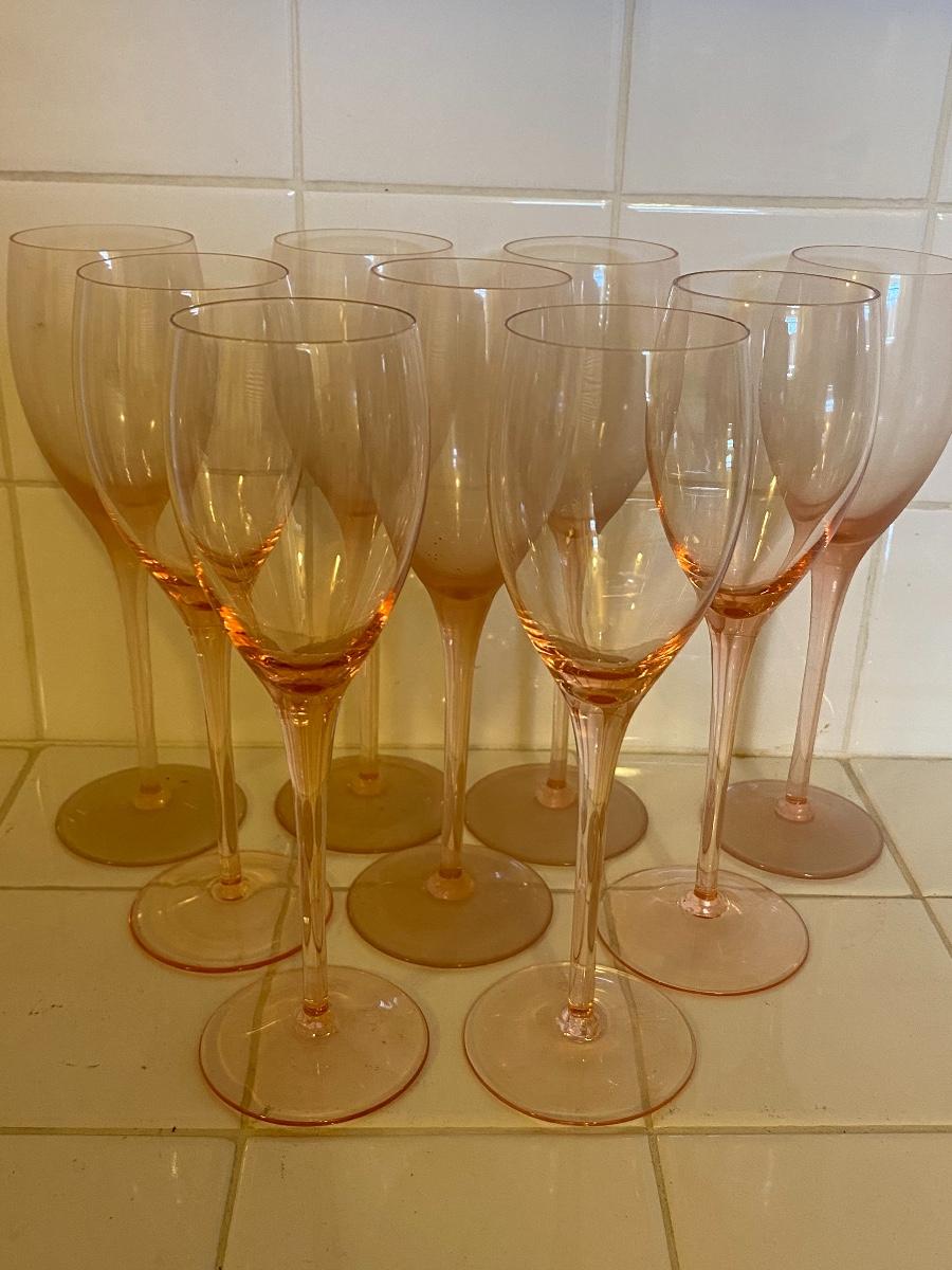Pale Pink Peach Wine Champagne Flutes Glasses. Good condition, dusty.