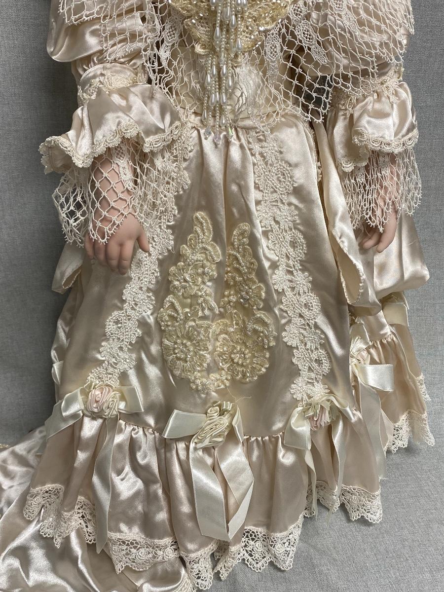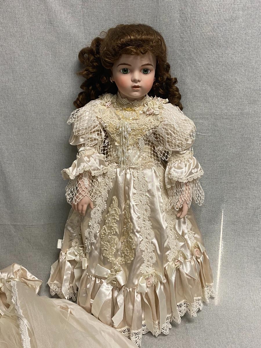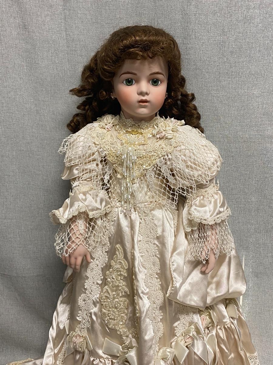 Beautiful bride doll by Patricia Loveless. Limited edition, #383/2000. Head is a Bru Jne repro from Bell Ceramics. Dress has removeable train, when veil and train are removed she has more of a Victorian look to her. Highly decorated gown. In great condition, beautiful face with green eyes. About 28" tall.