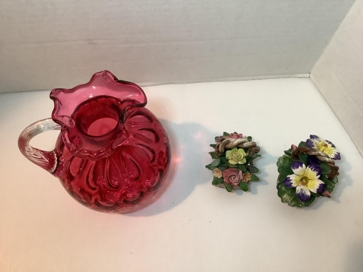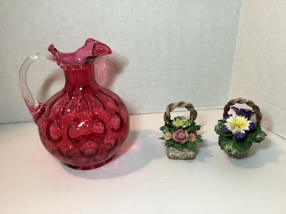 T. 843  Two Capidimonte Baskets & One Thumb Print Cranberry Glass Pitcher
