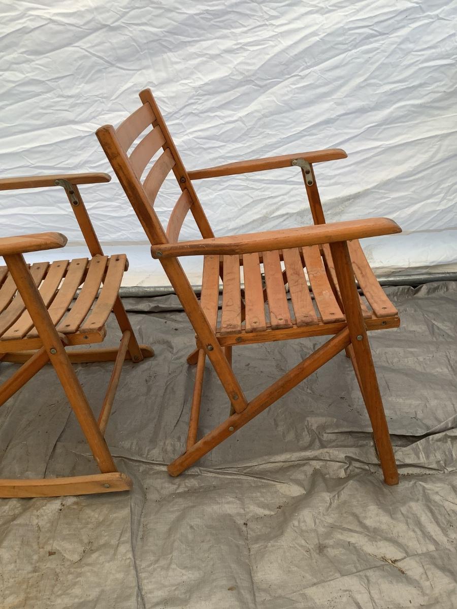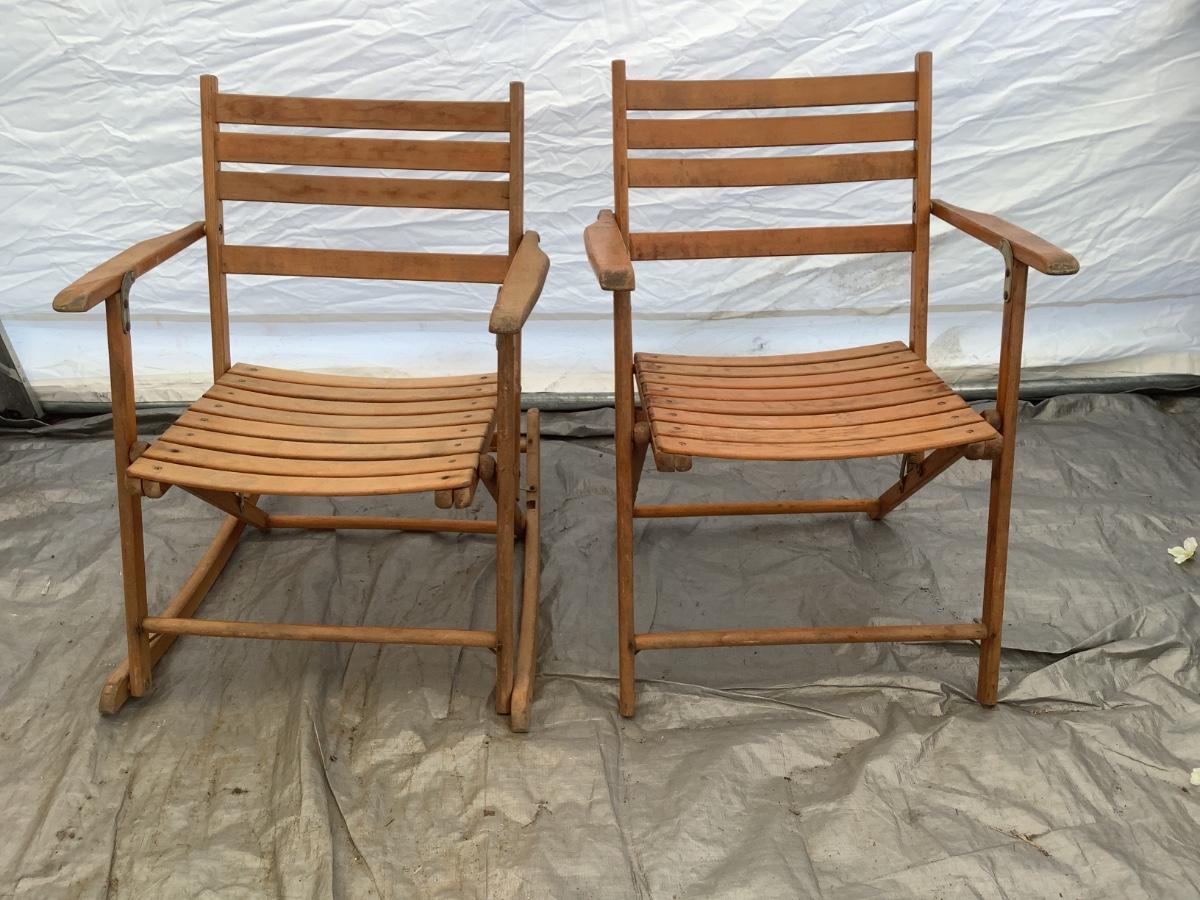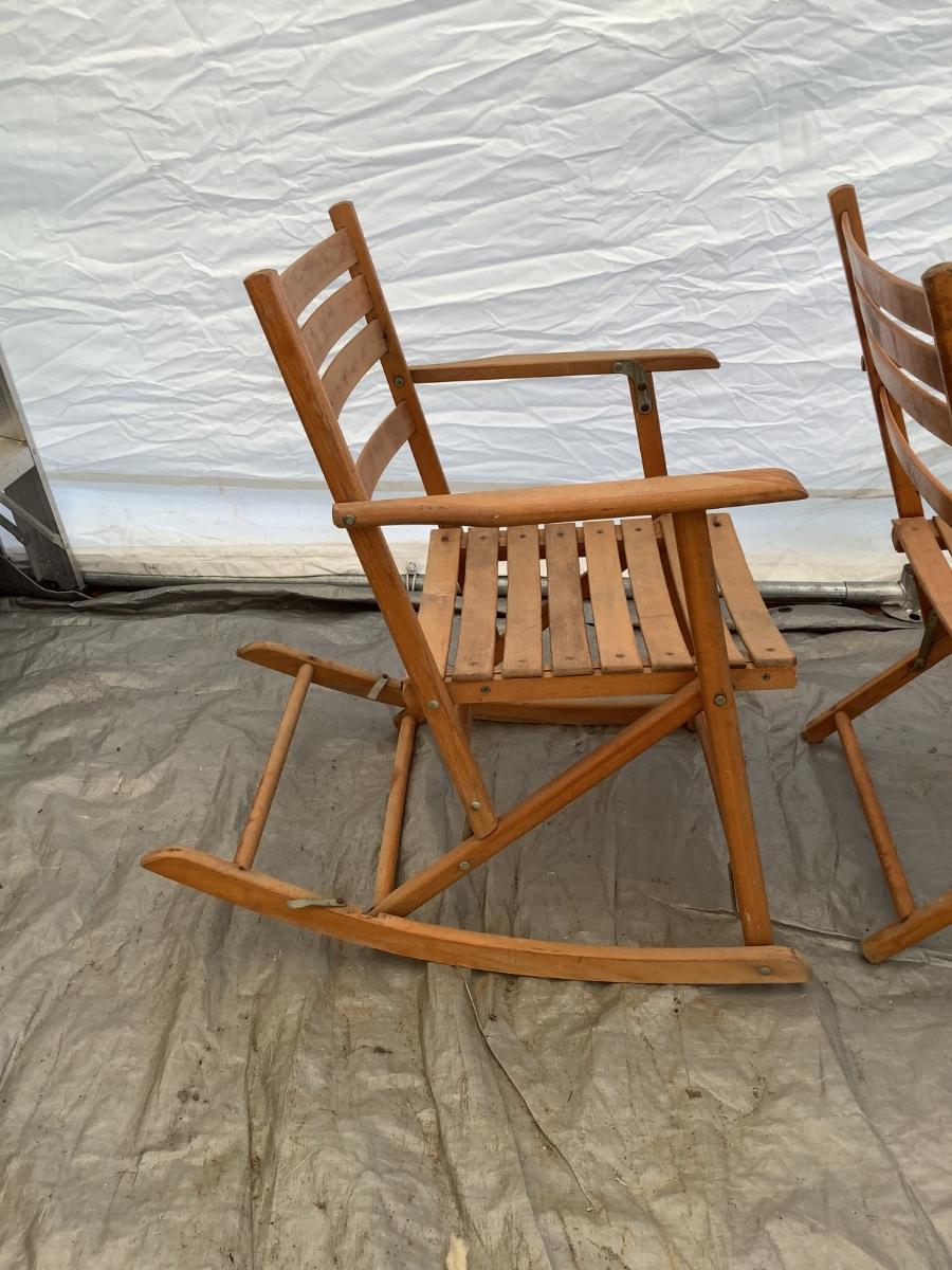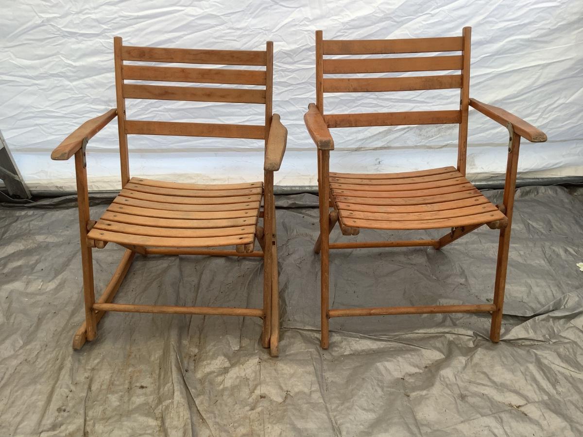 T - 894 Pair of Vintage Telescope Folding Wooden Chairs ( 1 Rocking Chair/Stationary Chair )