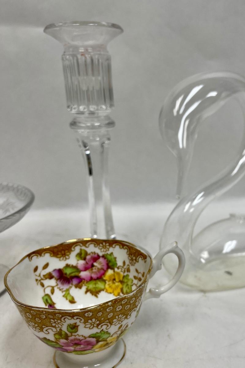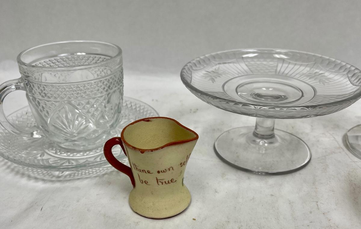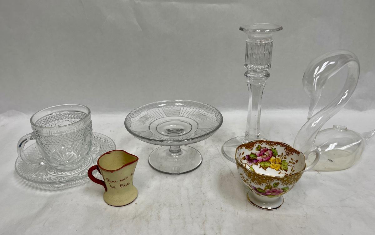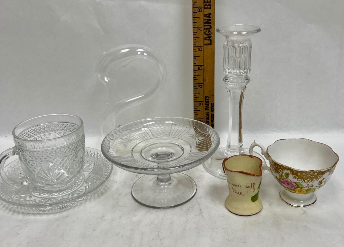 Misc. Vintage Glass, and Ceramic Lot - demitasse cup, mini creamer, mini cake plate, cup & saucer, candlestick holder
