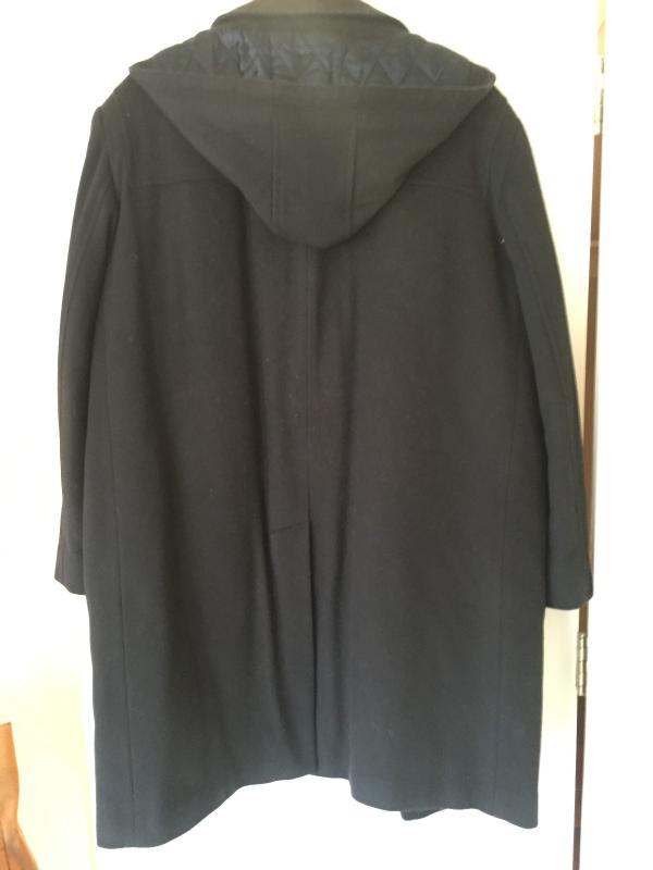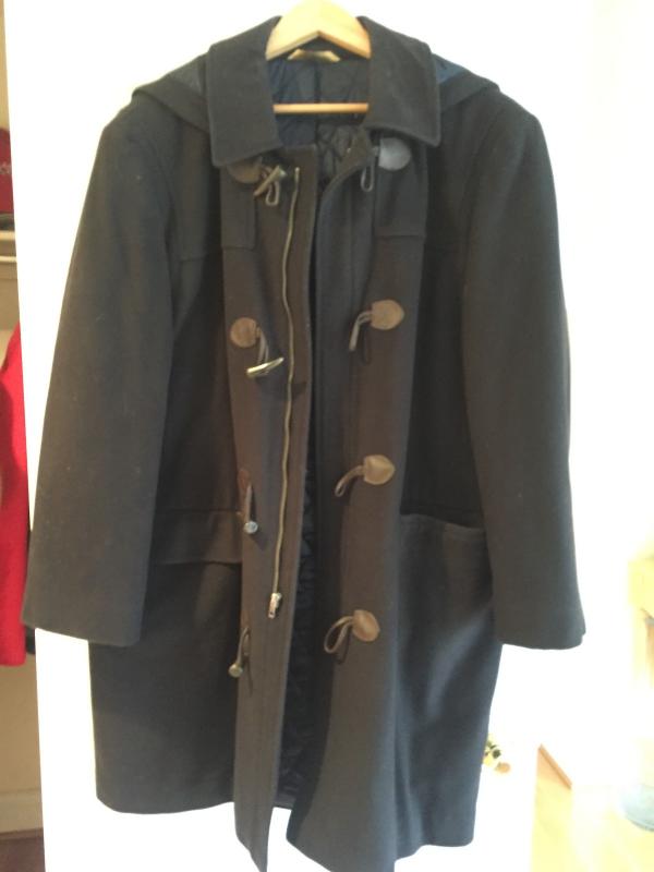 Very nice navy wool men's overcoat with hood by T Harris of London. Horn toggle closure over front zipper. Great shape. XL