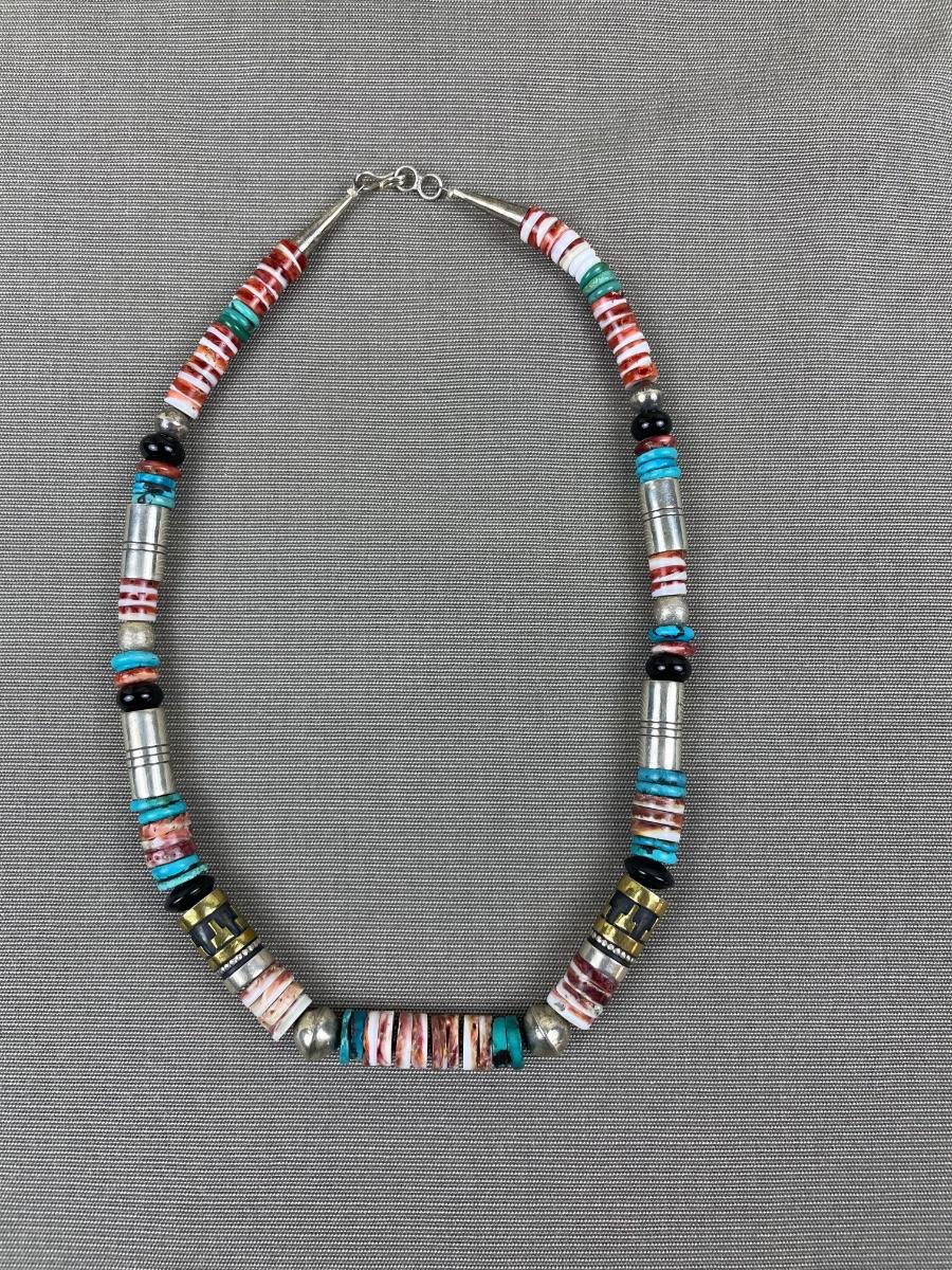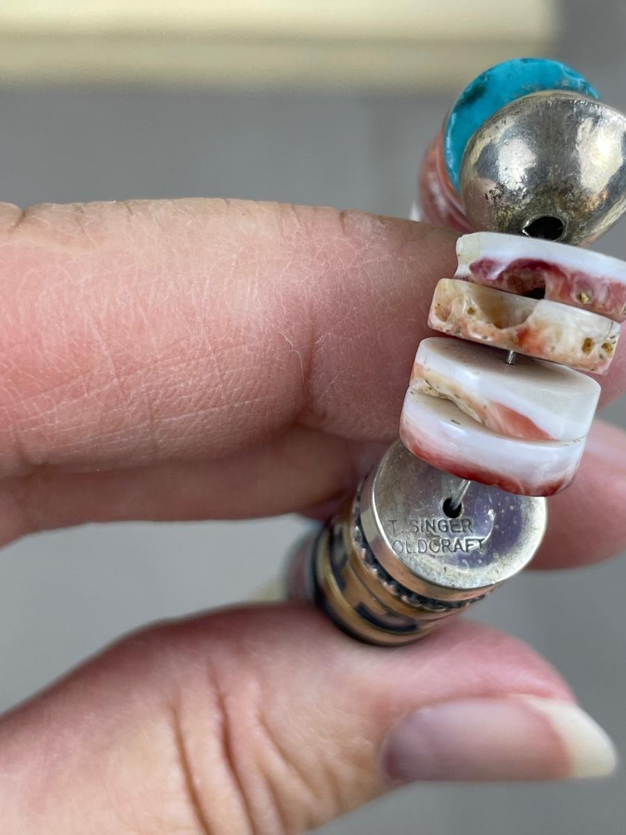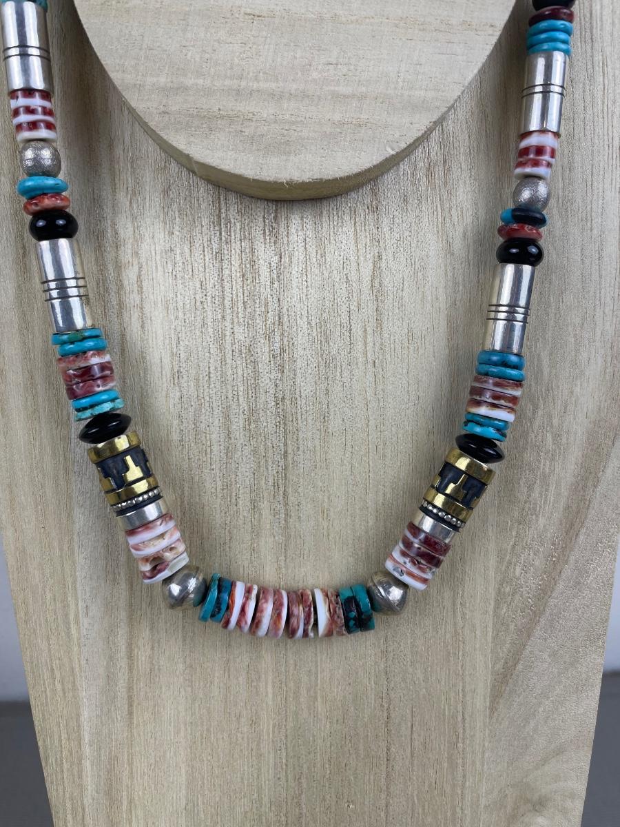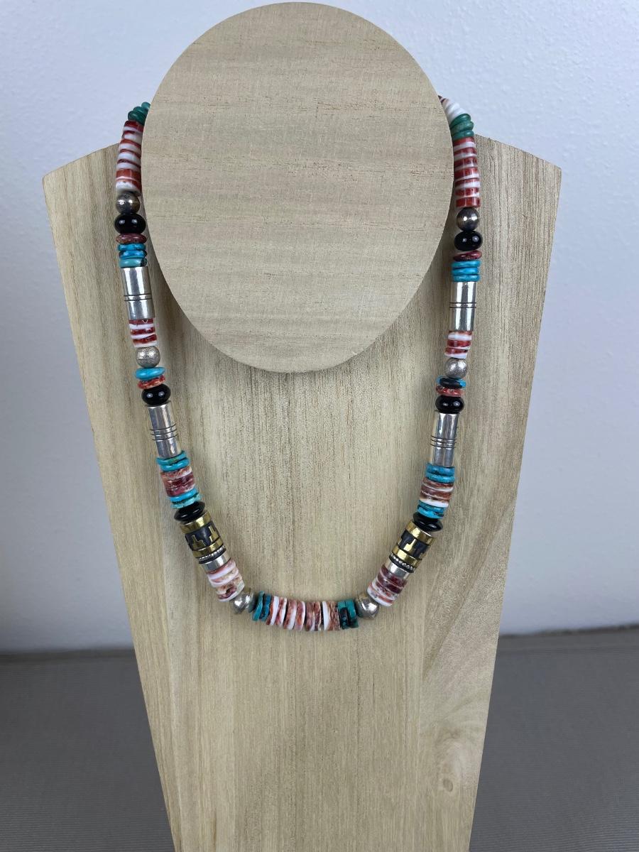 Tommy Singer was a well known Navajo artist. This 20 inches long necklace features spiny oyster, onyx, turquoise and sterling silver barrel beads.