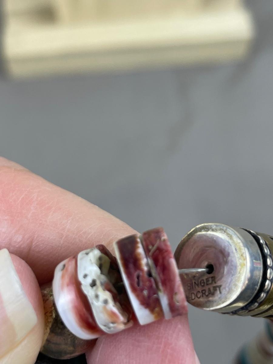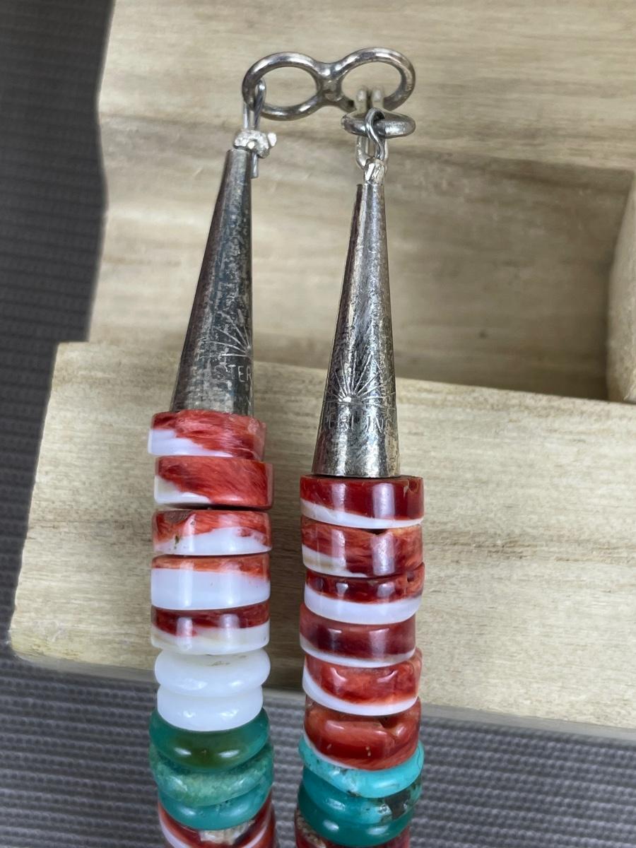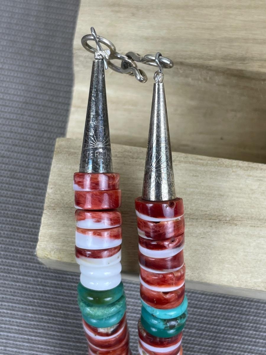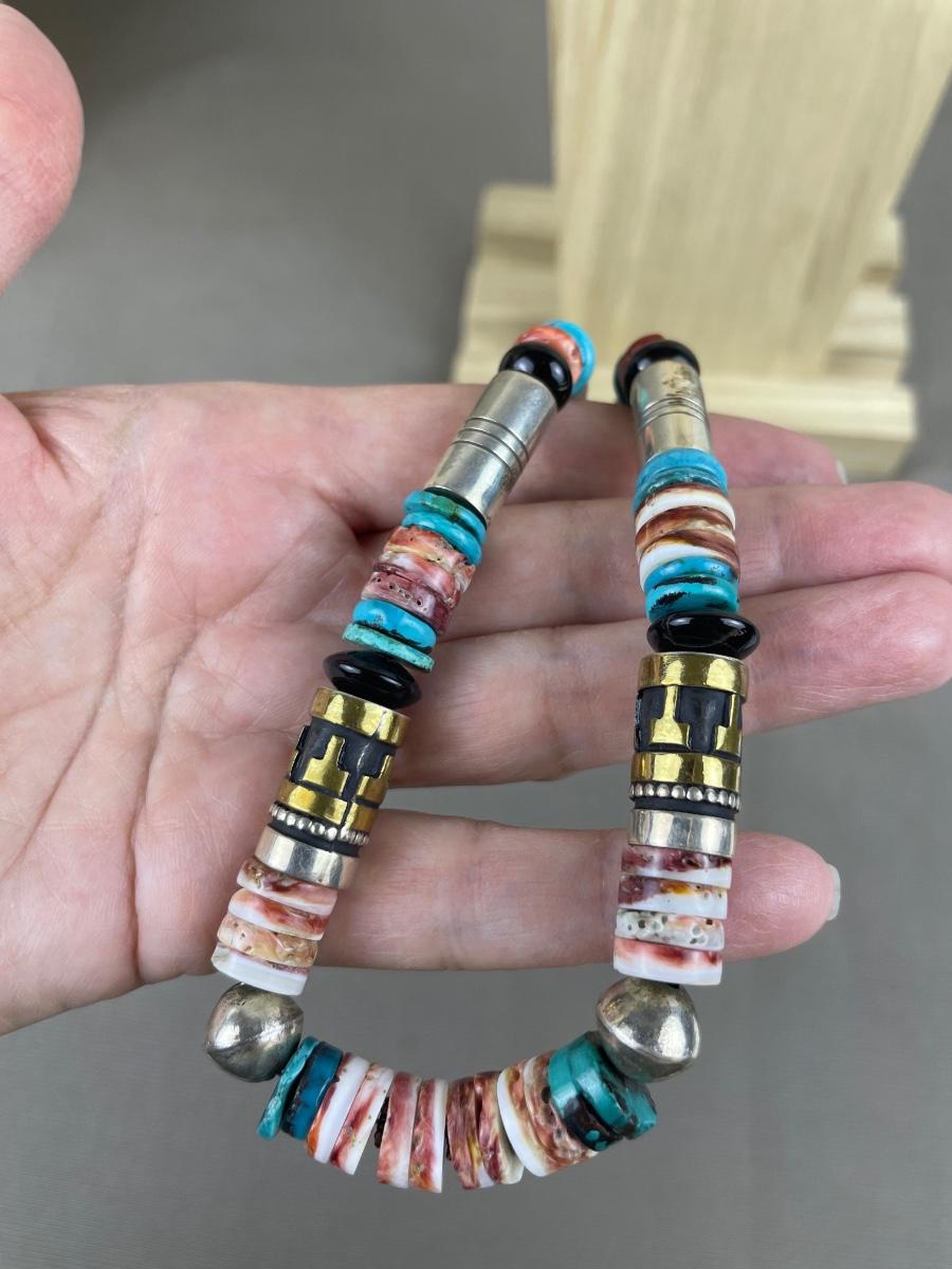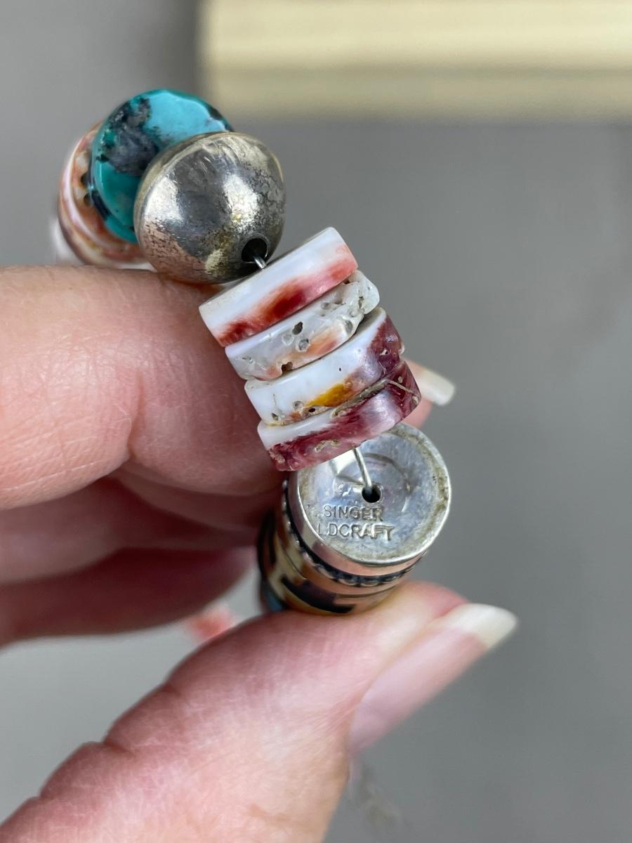 Tommy Singer was a well known Navajo artist. This 20 inches long necklace features spiny oyster, onyx, turquoise and sterling silver barrel beads.