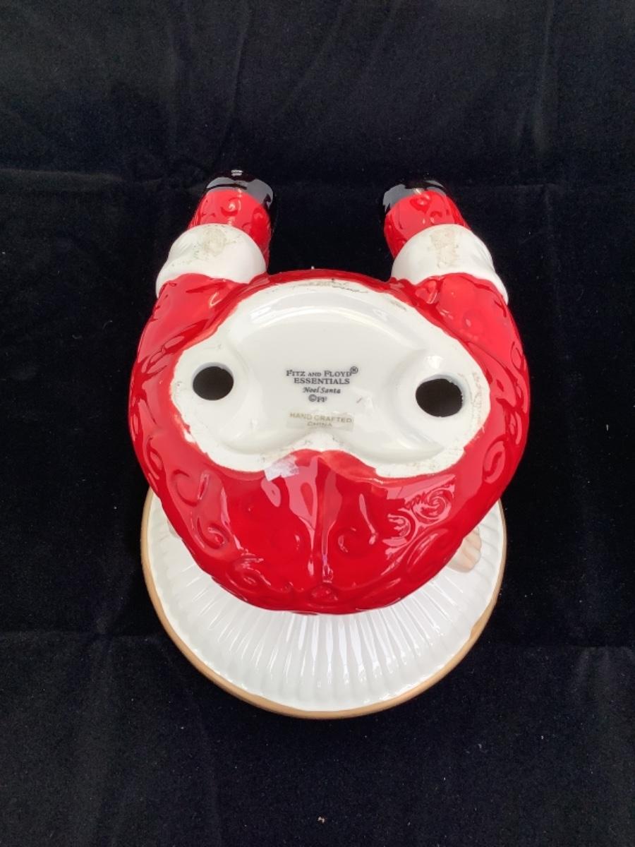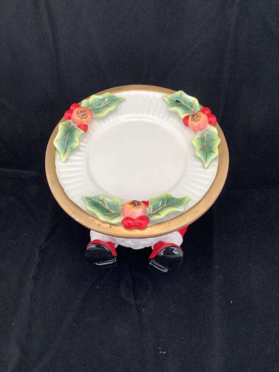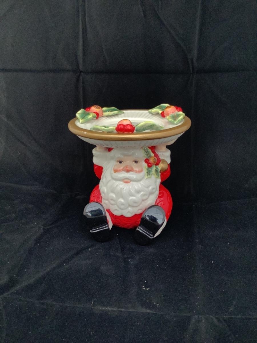 Fitz & Floyd “Noel Santa” candle holder, Fitz & Floyd Christmas plate- “Merry & Bright”, wooden angel playing violin-wing has been repaired, hand carved wooden santa & composite angel playing trumpet