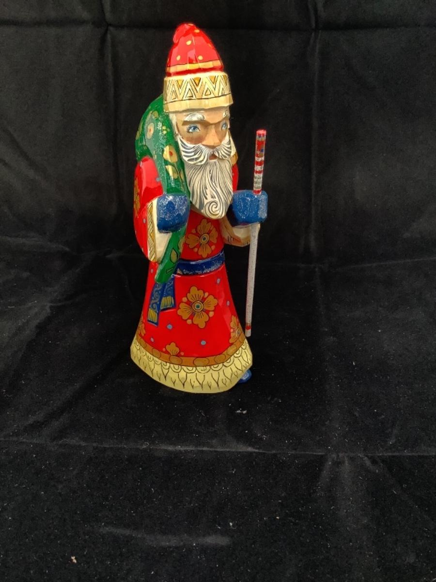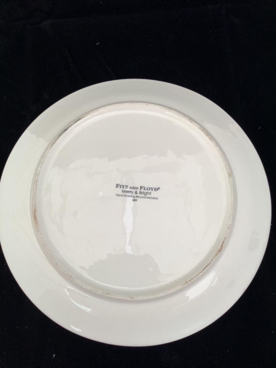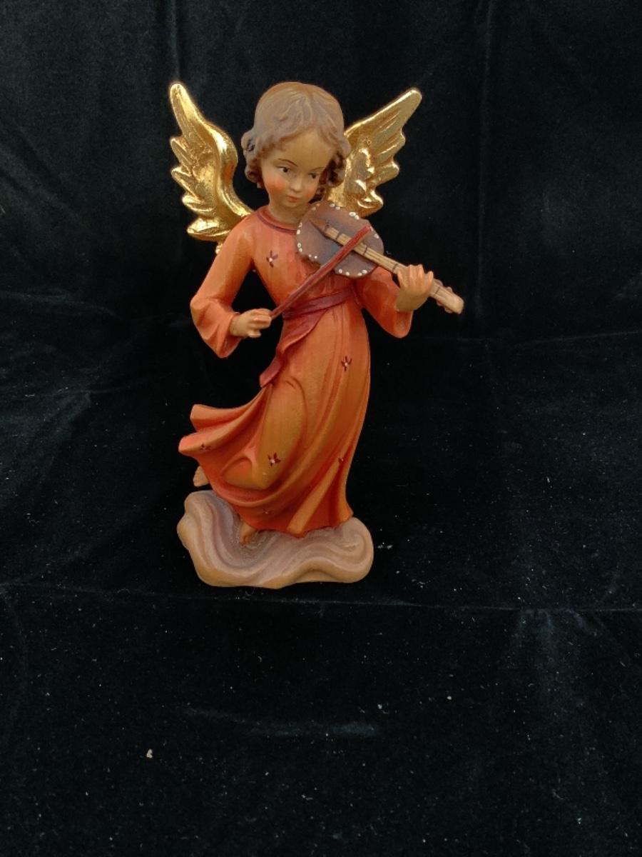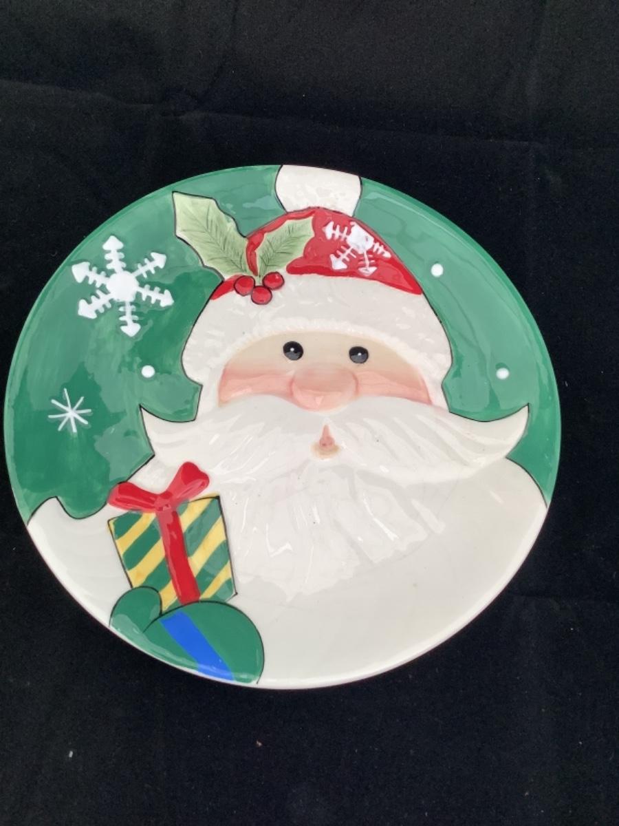 Fitz & Floyd “Noel Santa” candle holder, Fitz & Floyd Christmas plate- “Merry & Bright”, wooden angel playing violin-wing has been repaired, hand carved wooden santa & composite angel playing trumpet