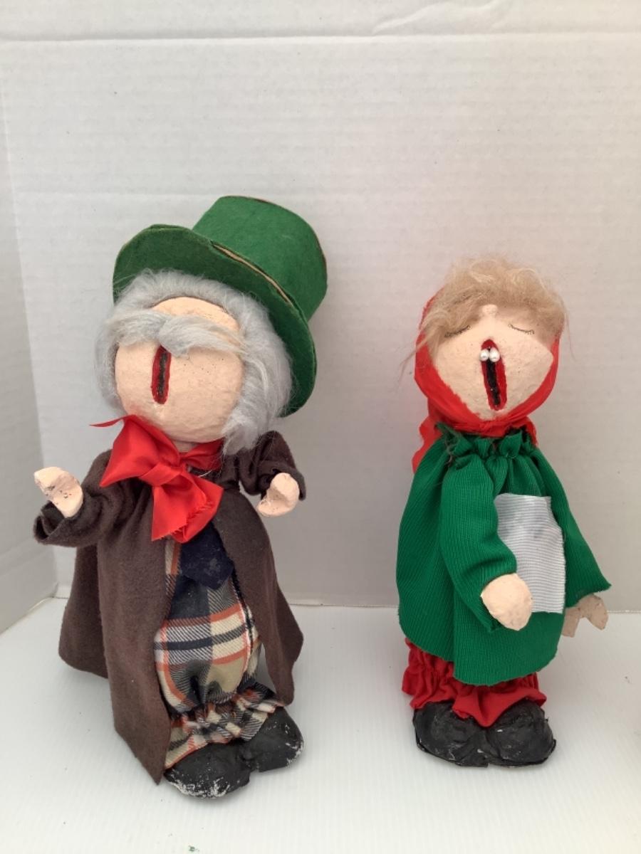 Carolers are handmade from beer bottles and mache and measures 11” high , Elf on shelf is vintage and has some fading ,