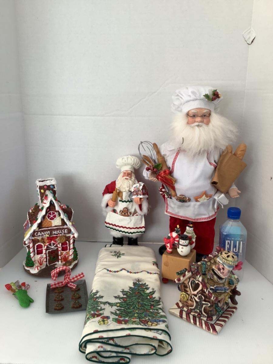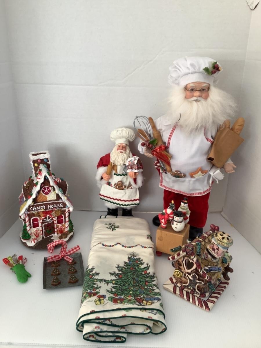 Candy house music box, Spode style Christmas tree tablecloth , blue sky works votive , cheese spreaders, two baking santa figures