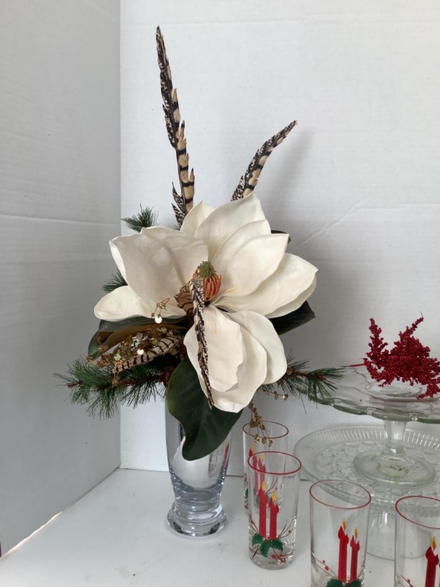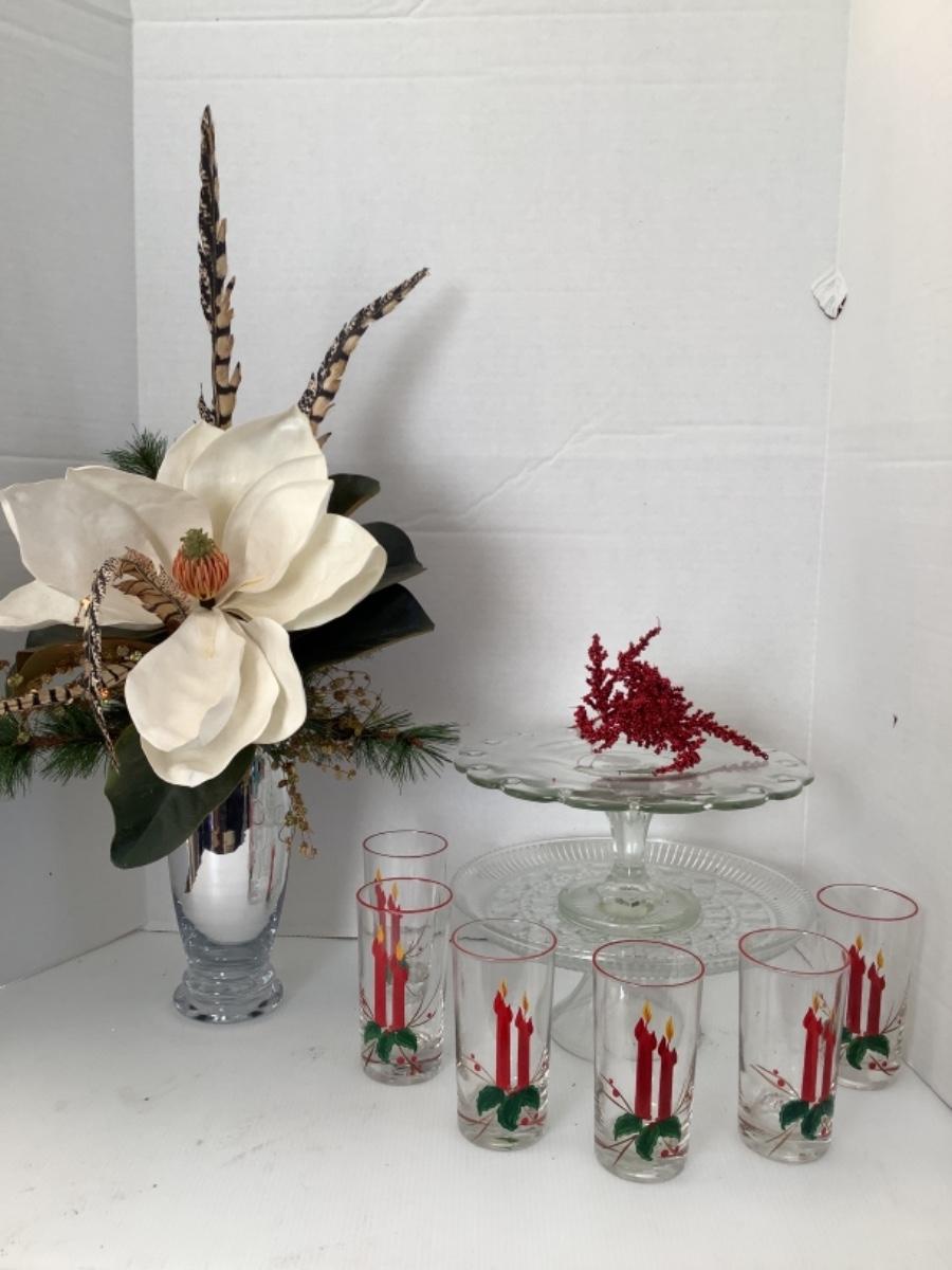 T191 Mercury Glass Floral arrangement with Glass Cake plates, and Glasses