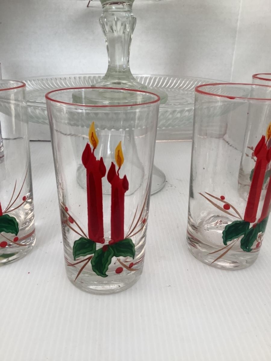 6 Handpainted vintage glass set with mercury vase floral arrangement and two pedestal cake plates