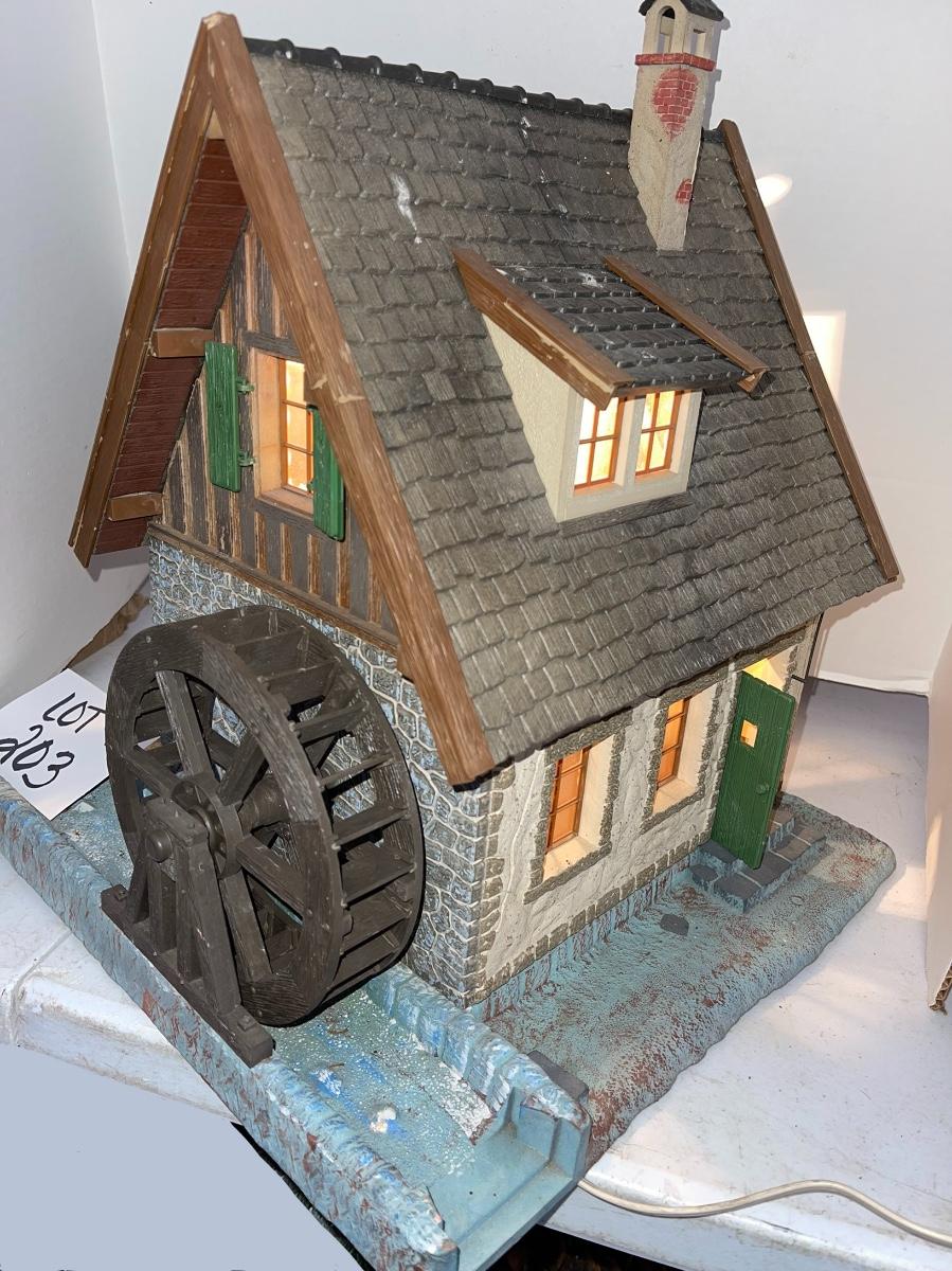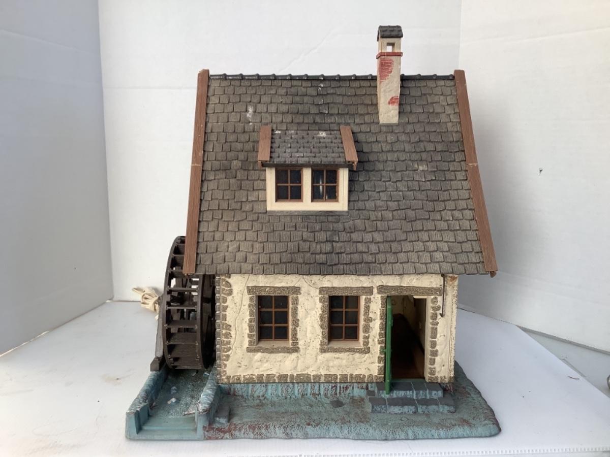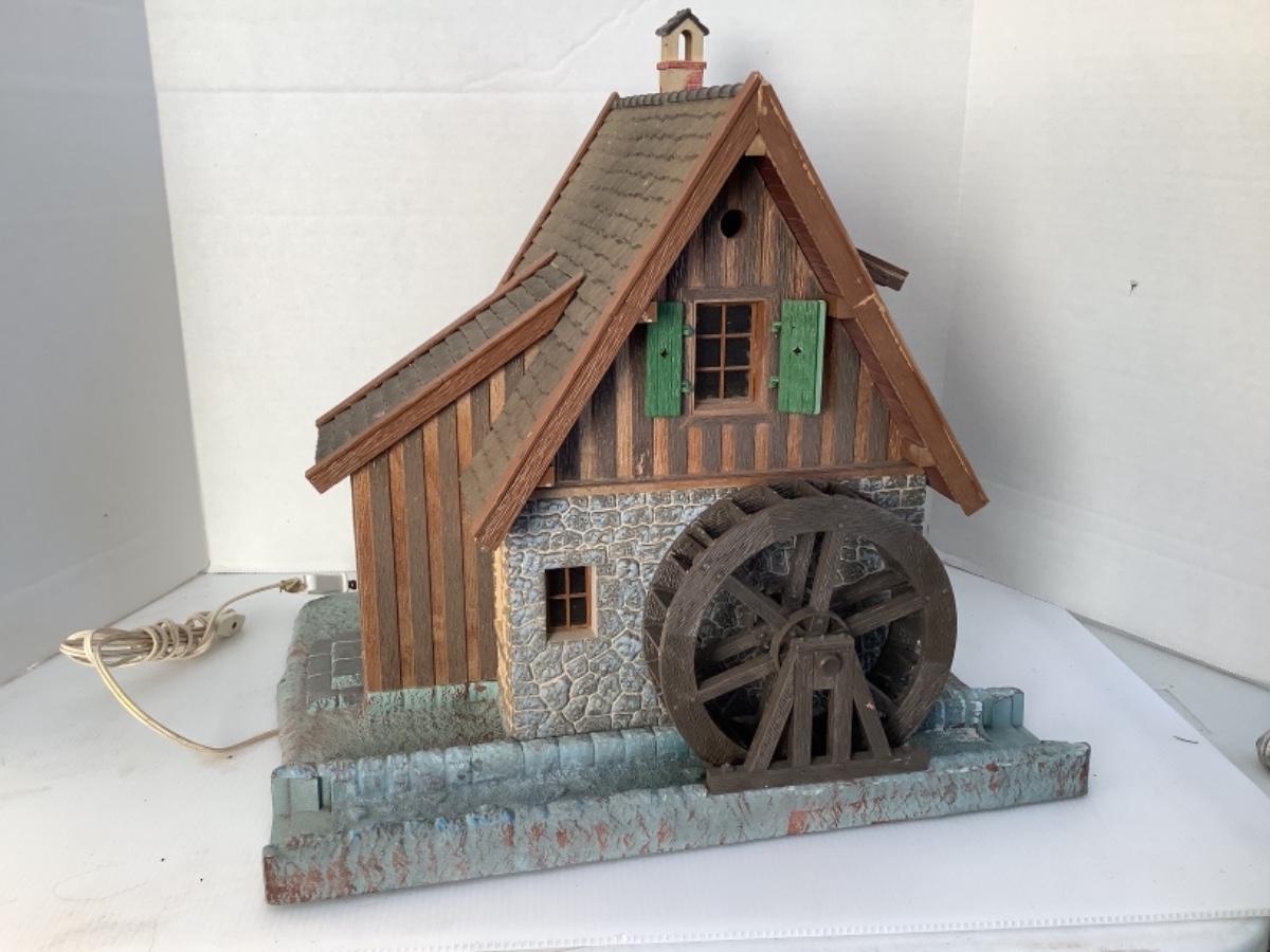 This building originally came with a motor to run water thru the mill. It no longer has this. It has a working light. Measures 16.5” long x 15.75” wide x 15” high